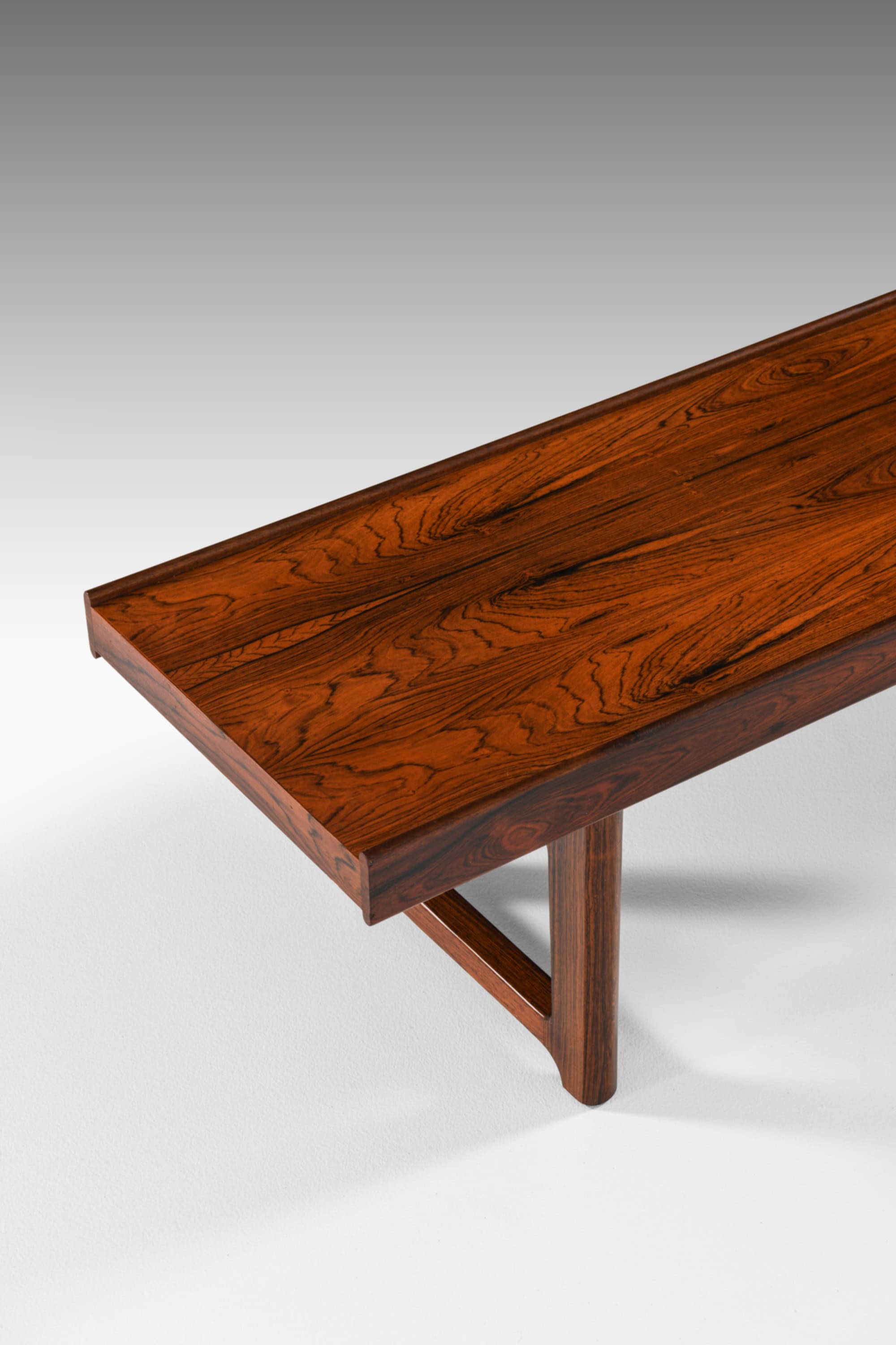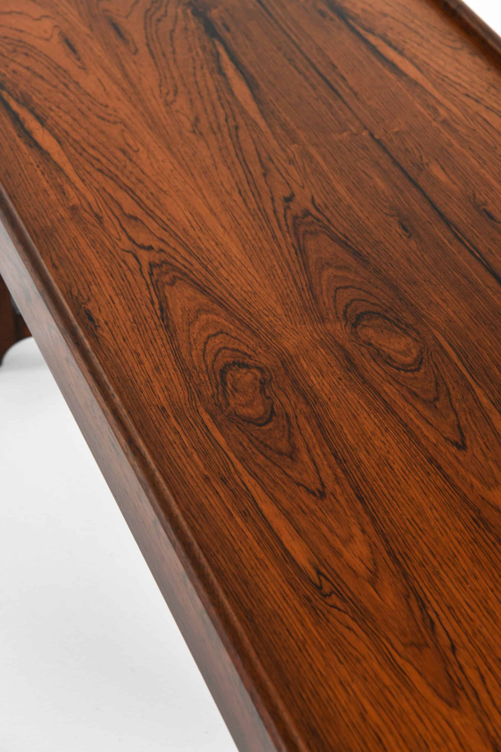 The bench rests on two end frames with integrated stretchers, forming a stable and visually light base. The legs are straight with softened edges, and the joinery is expressed in a clear, structural way typical of Scandinavian modern furniture. The proportions are low and elongated, allowing the piece to function both as a bench and as a side or coffee table. The rosewood veneer and solid elements are carefully matched so that the grain flows continuously, emphasizing the linear character of the design.