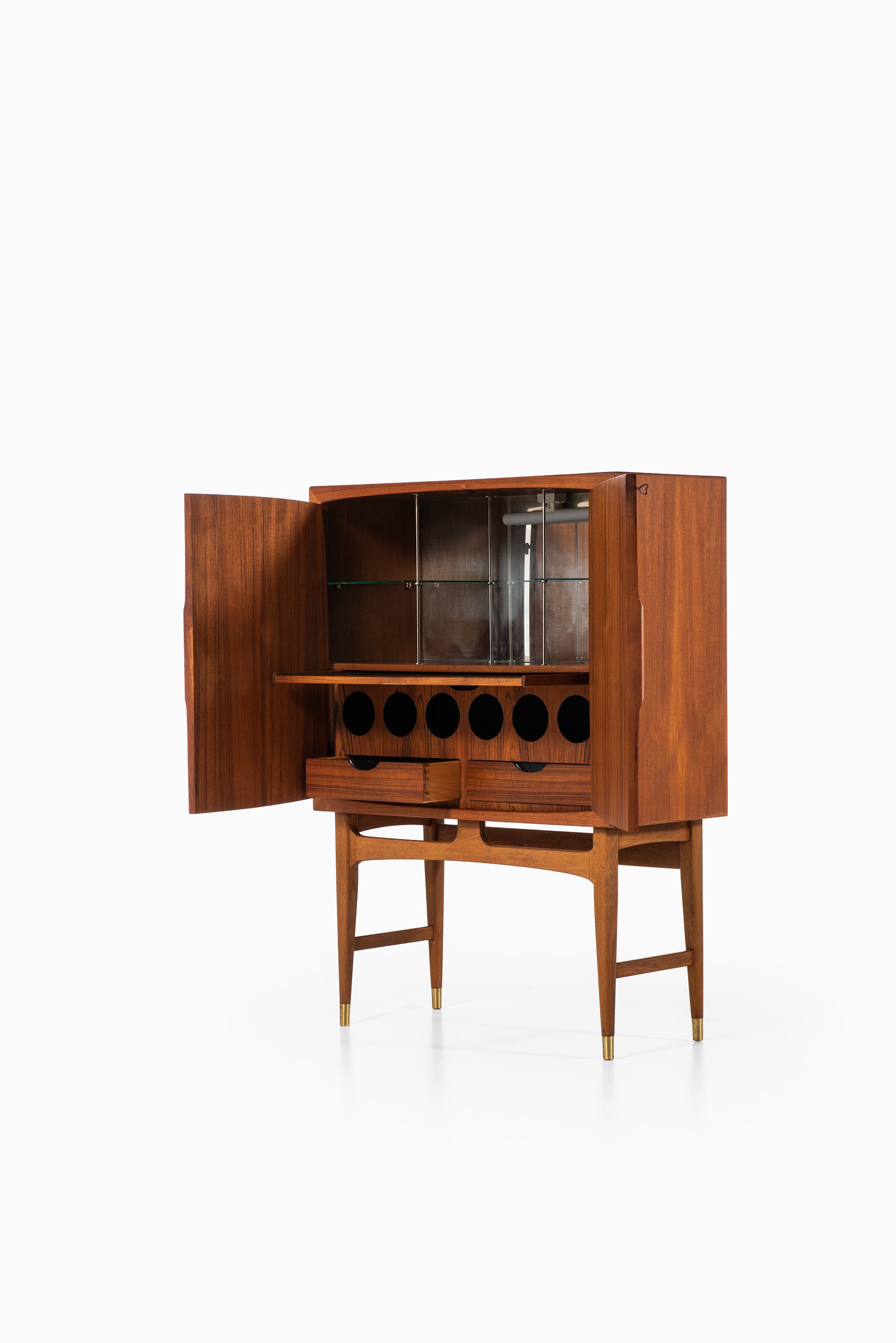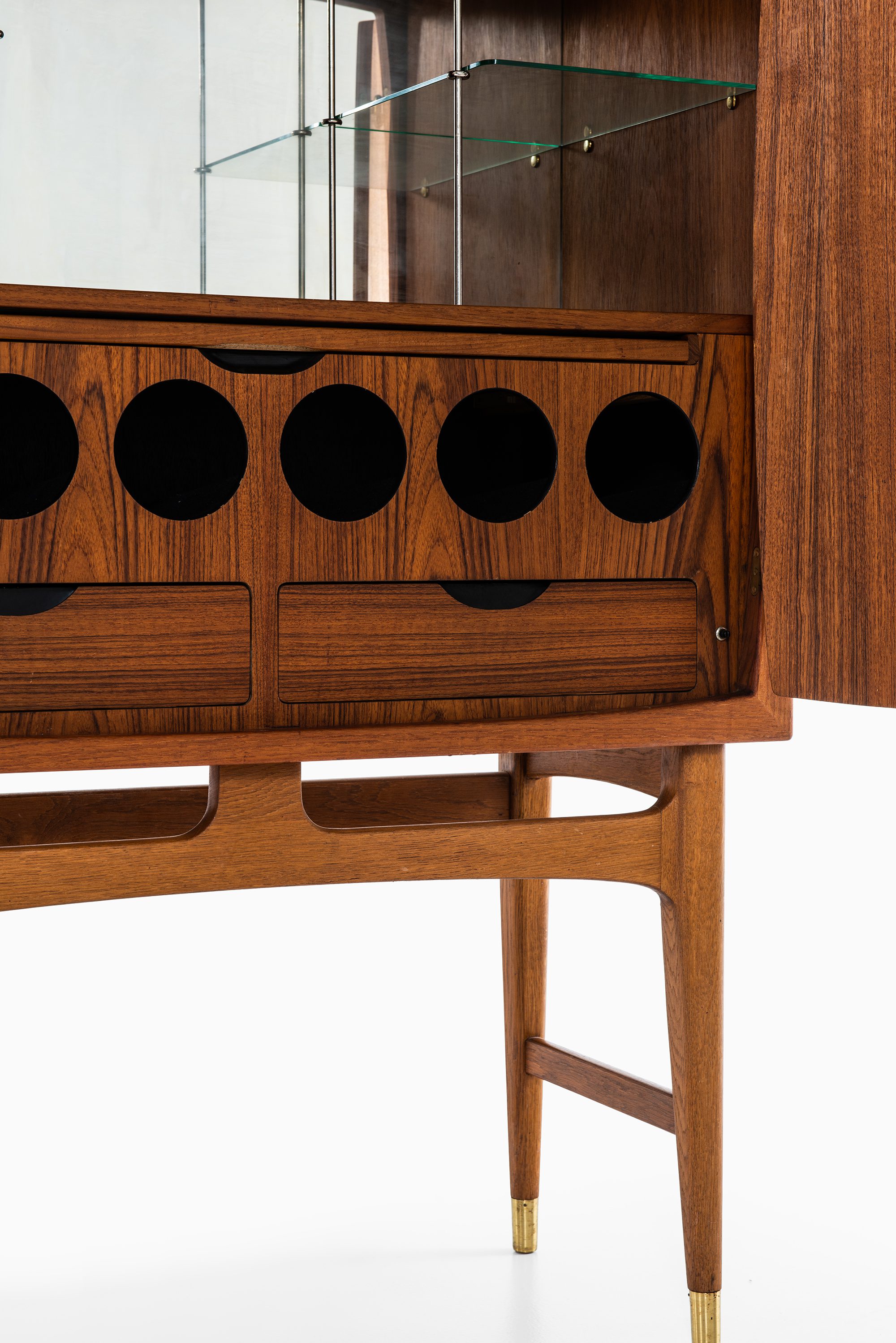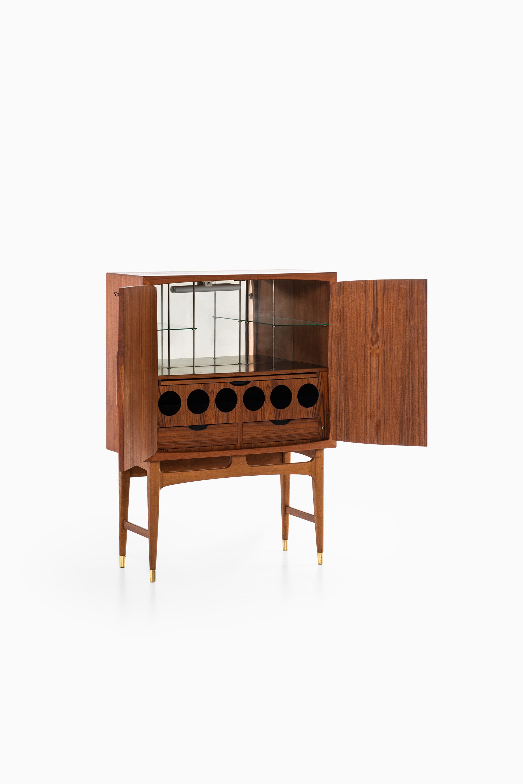 The bar cabinet is presented in good vintage condition, with signs of usage and a patina that corresponds to its age. The surfaces, brass fittings, and interior components remain well preserved, underlining the quality of both the design and the craftsmanship.