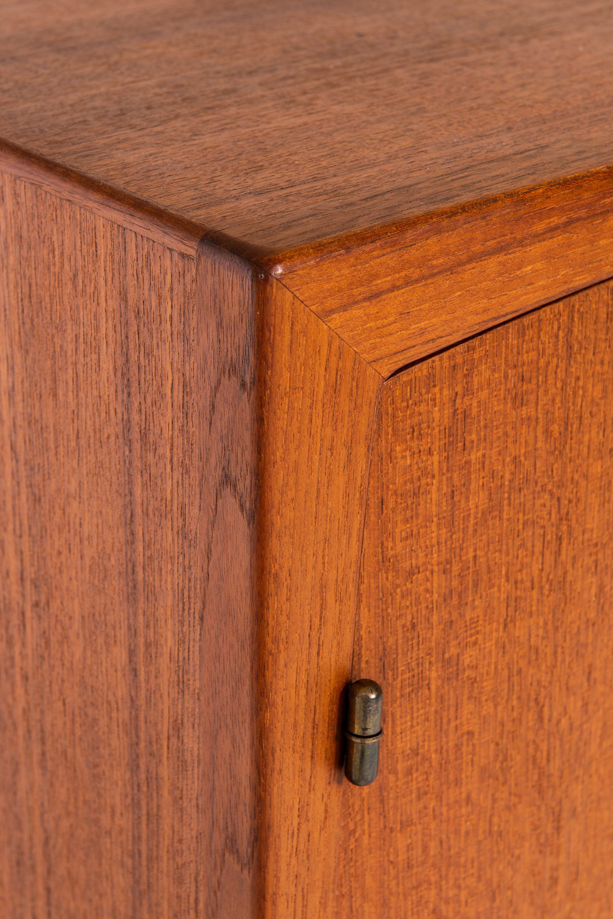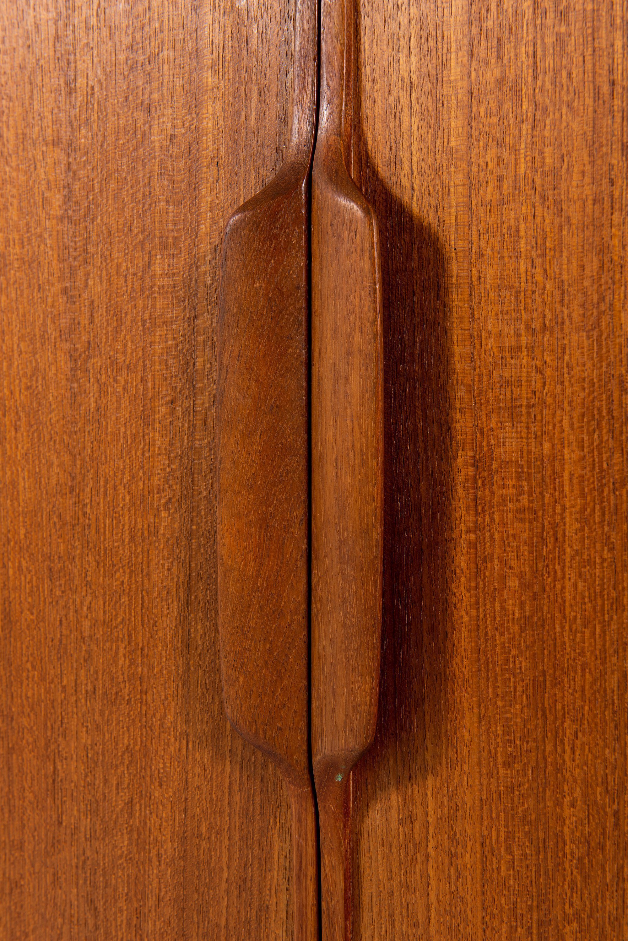 The cabinet is executed in teak with oak as secondary wood, complemented by brass and glass details. The exterior is minimal, with clean lines and gently curved handles that soften the rectilinear form. The cabinet stands on tapered legs with brass-capped feet, a detail that enhances both stability and sophistication. The structure is lifted from the ground, emphasizing lightness while maintaining a strong presence.
