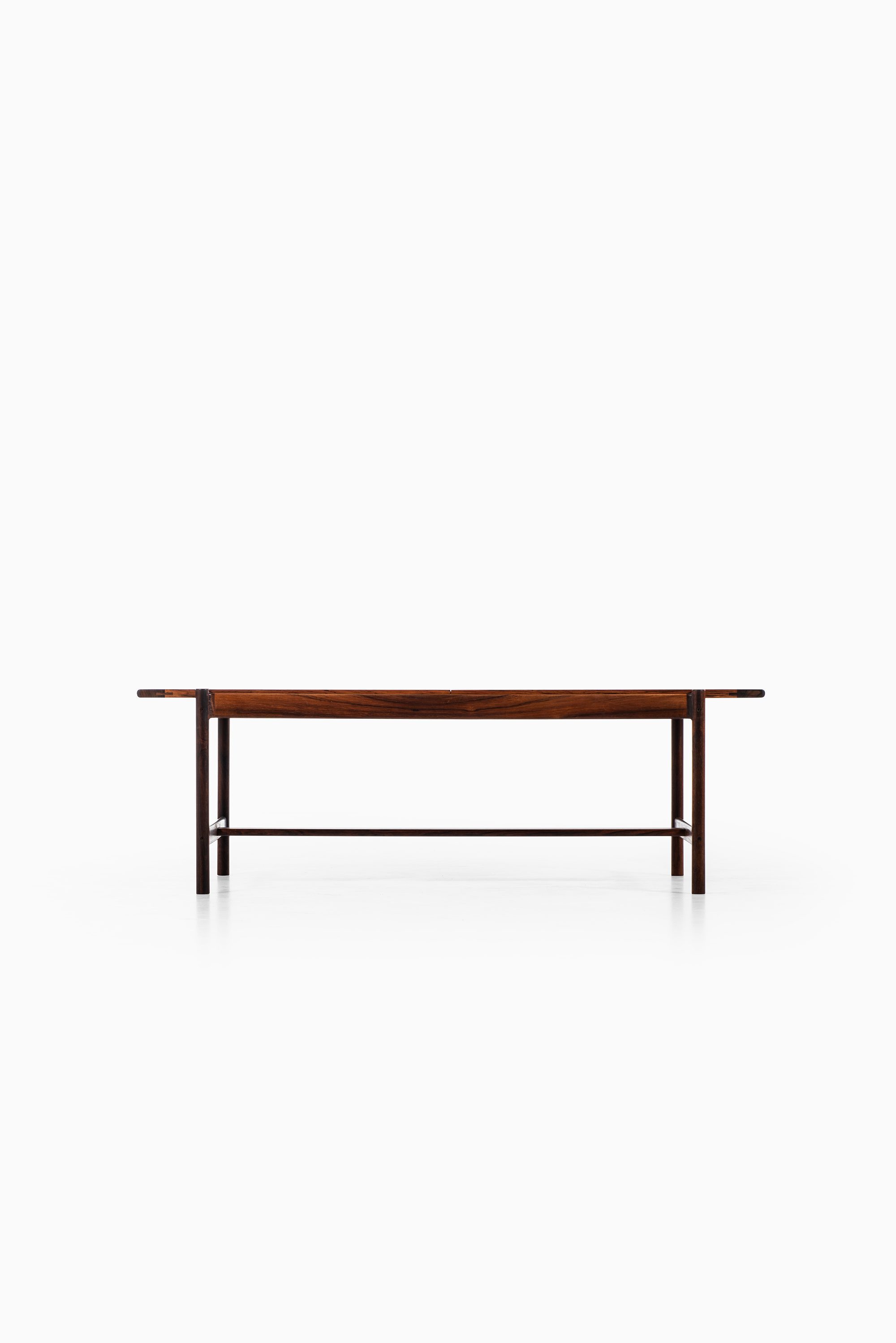 This rare large coffee table, model Sari, was designed by the Norwegian designer Torbjørn Afdal and produced by Bruksbo during the 1960s. The table is executed in rosewood with a strong linear grain pattern that gives depth and richness to the surface. A distinctive design feature is the combination of the warm-toned rosewood with a central black formica inlay, which provides both a visual contrast and a durable surface. The use of brass fittings and detailing adds subtle refinement and reflects Afdal’s attention to both structure and finish.