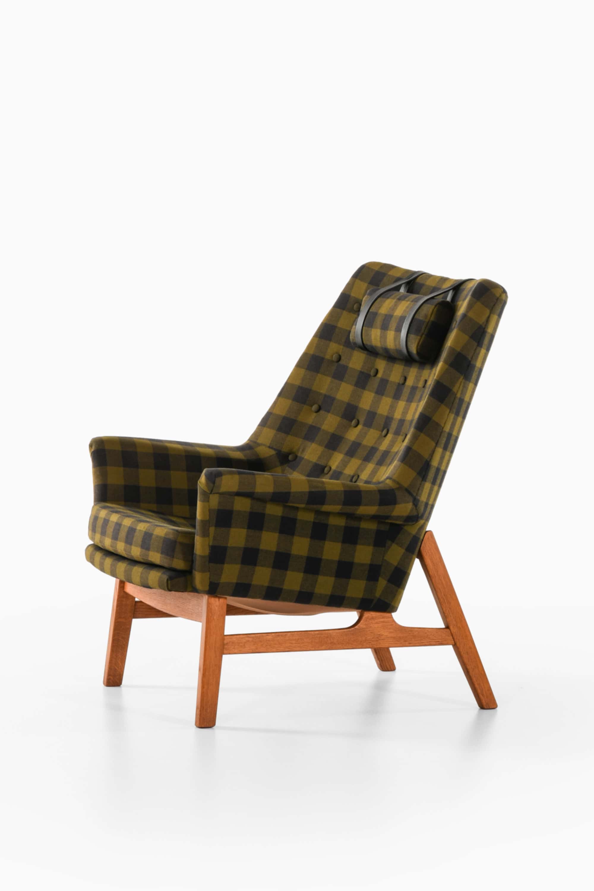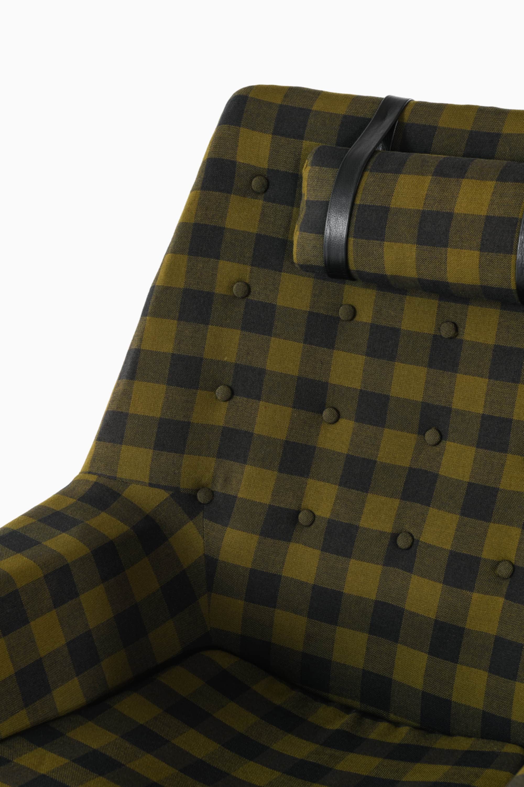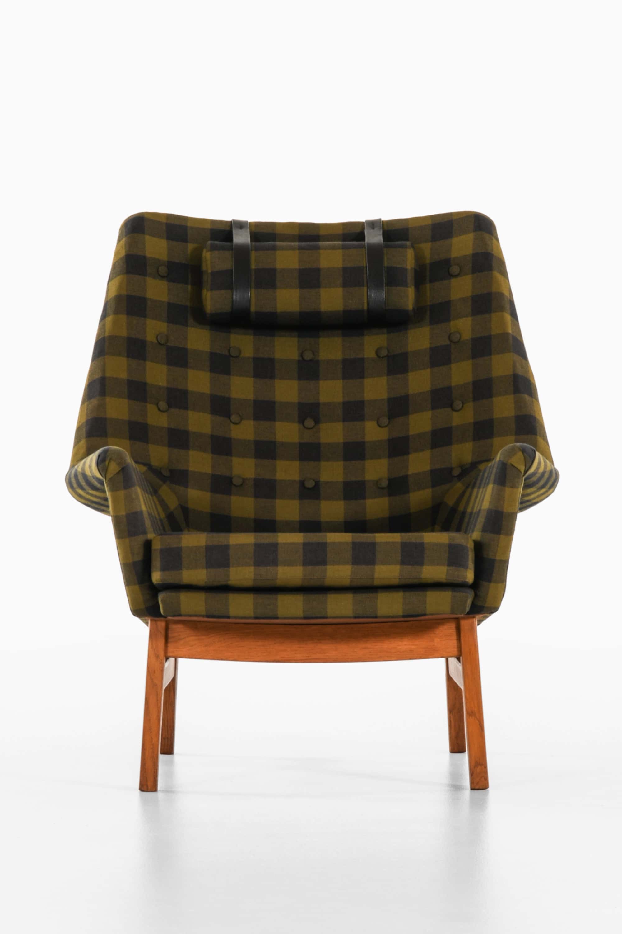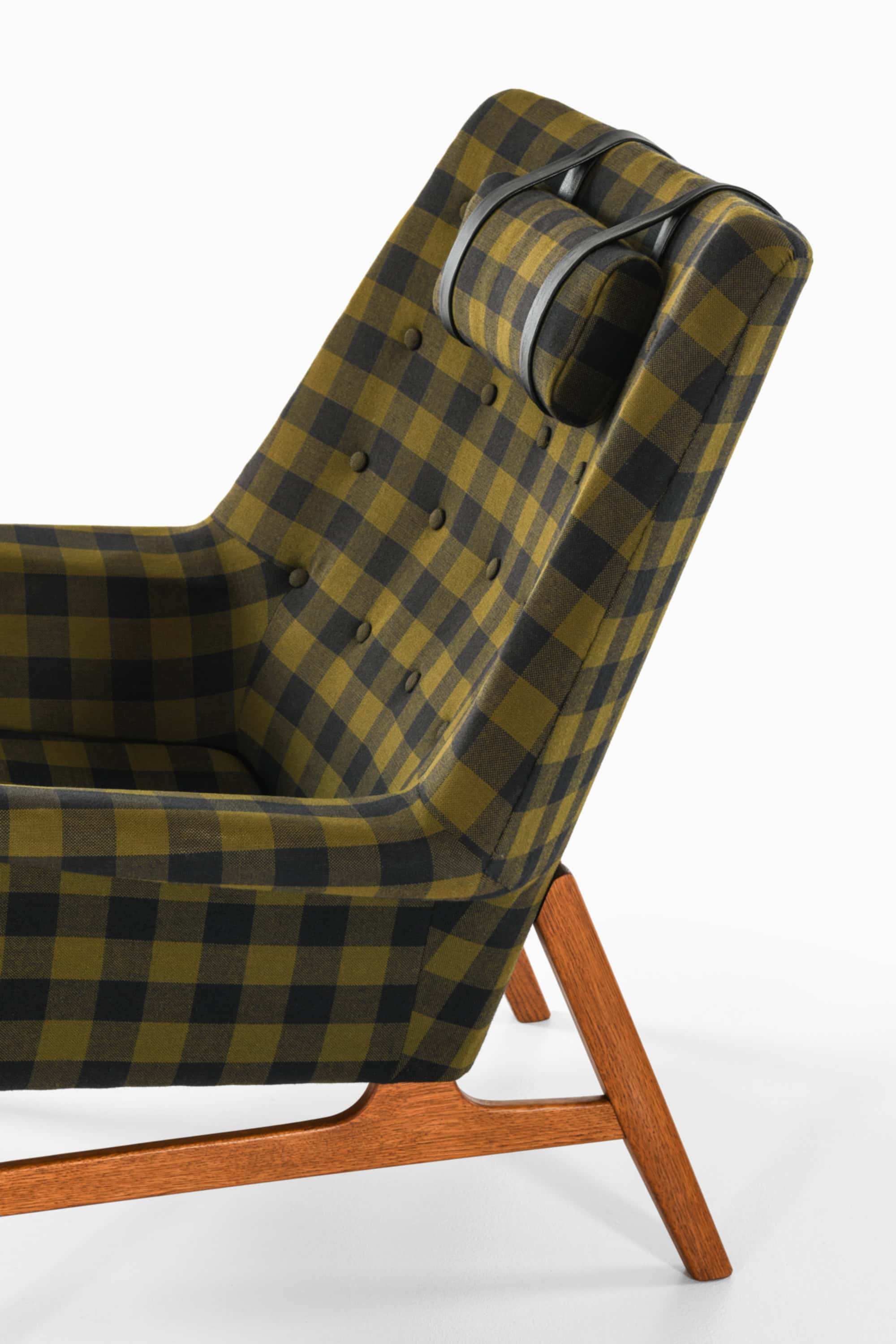 This is the rare “Glimminge” easy chair, designed by Tove and Edvard Kindt-Larsen and produced by OPE Möbler in Sweden during the 1960s. The chair combines a solid oak frame with the original checked wool upholstery in tones of olive green and black, complemented by a cylindrical headrest held in place with black leather straps. The structure displays a characteristic balance of geometric precision and organic softness, typical of the Kindt-Larsens’ mid-century Scandinavian approach.