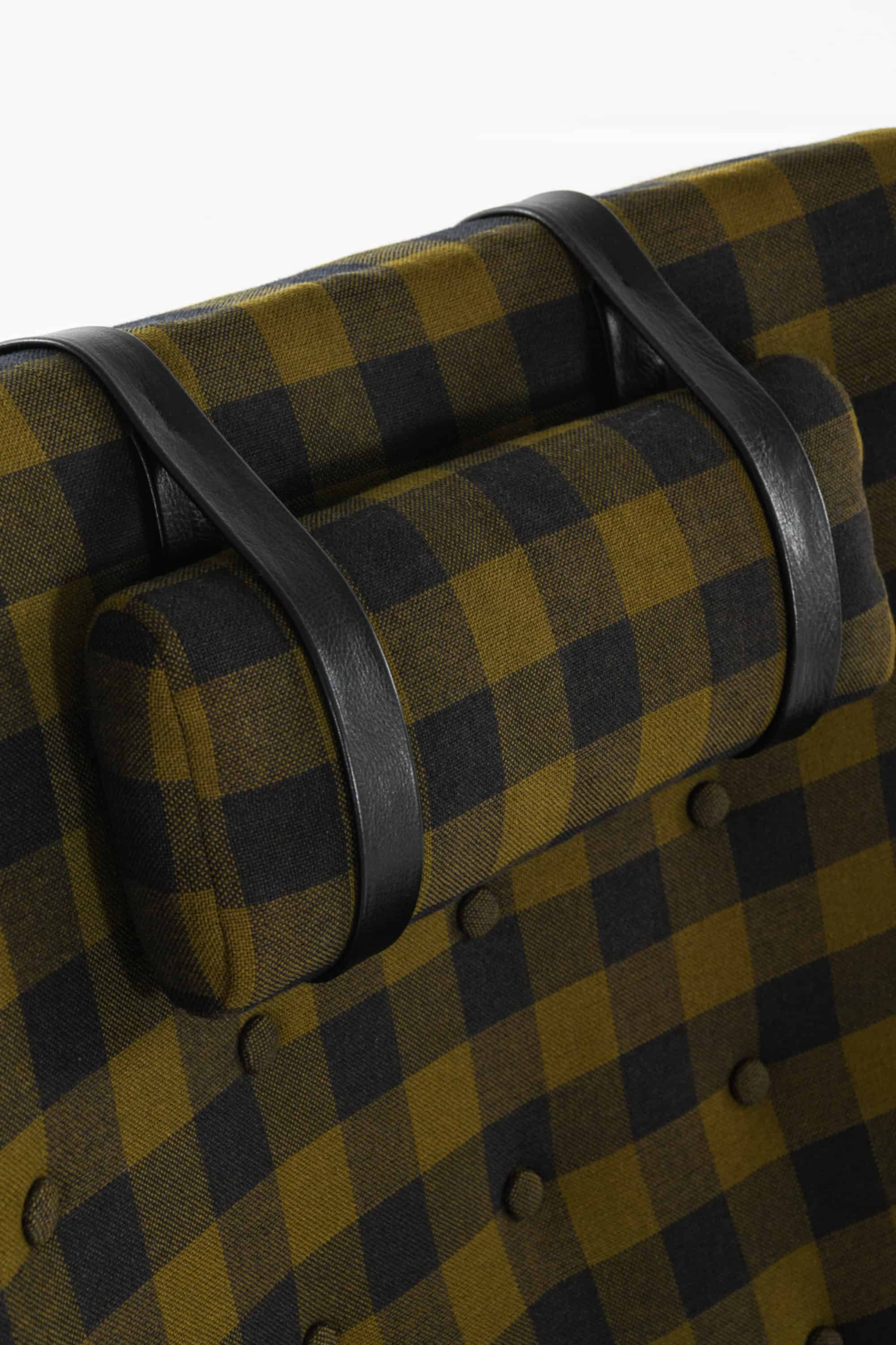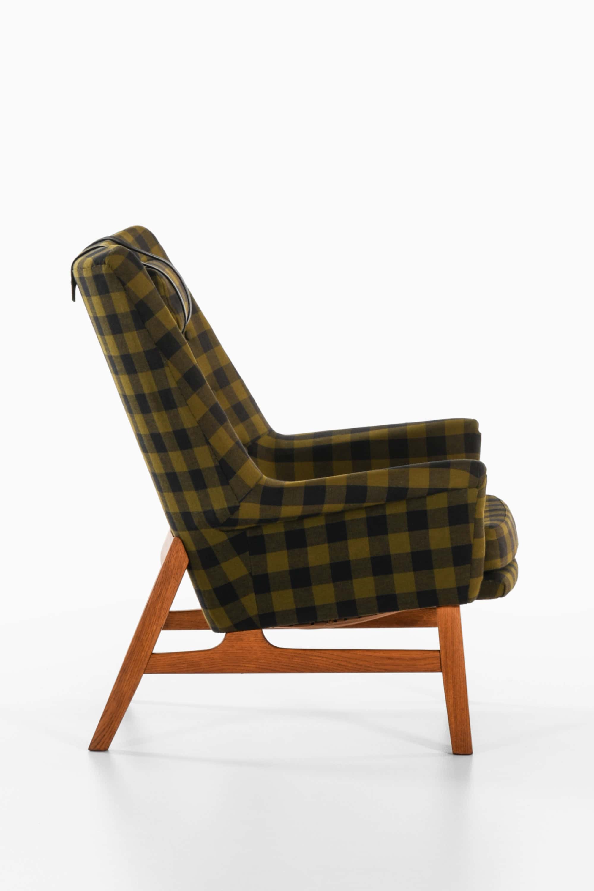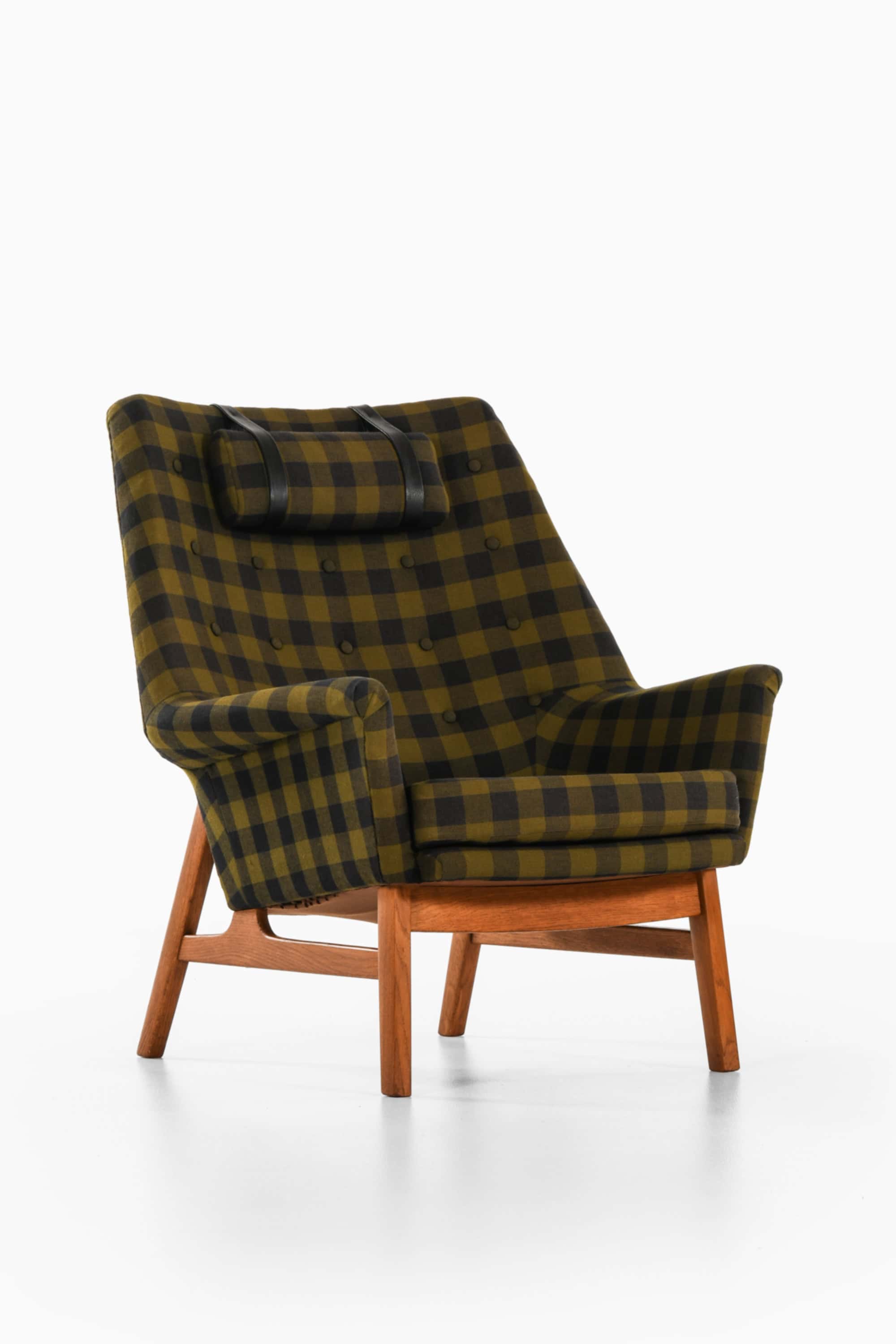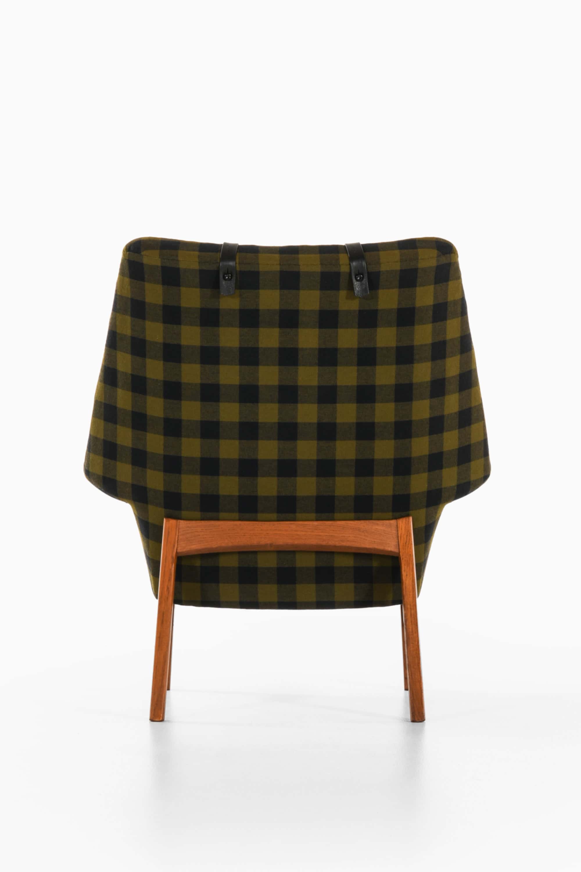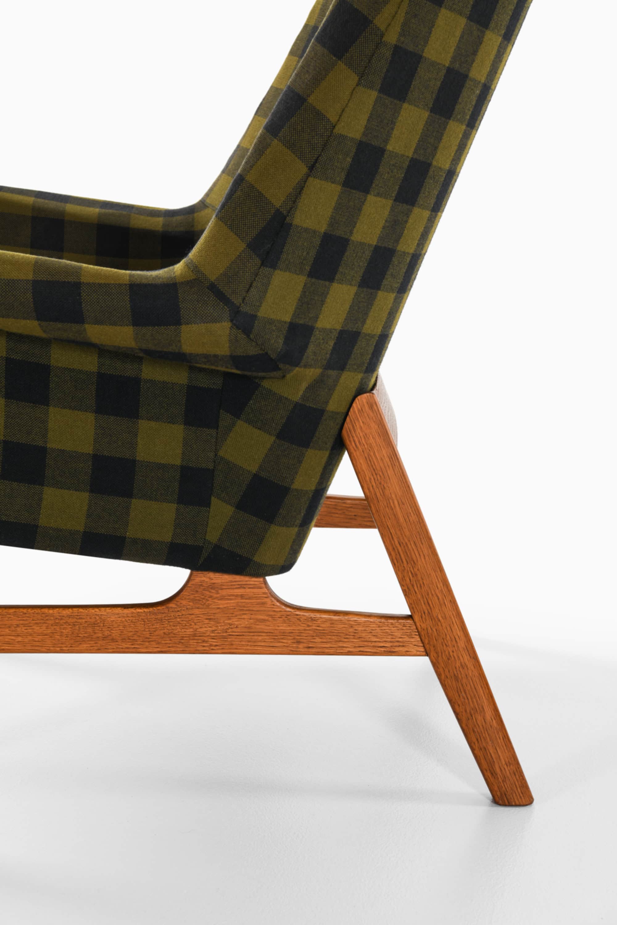 This is the rare “Glimminge” easy chair, designed by Tove and Edvard Kindt-Larsen and produced by OPE Möbler in Sweden during the 1960s. The chair combines a solid oak frame with the original checked wool upholstery in tones of olive green and black, complemented by a cylindrical headrest held in place with black leather straps. The structure displays a characteristic balance of geometric precision and organic softness, typical of the Kindt-Larsens’ mid-century Scandinavian approach.