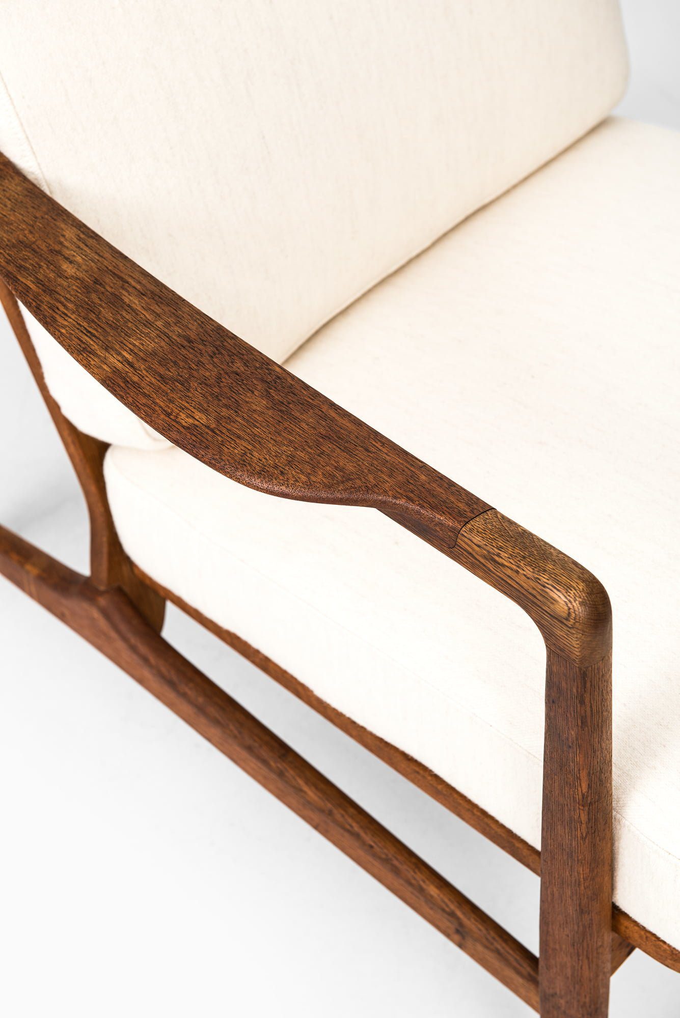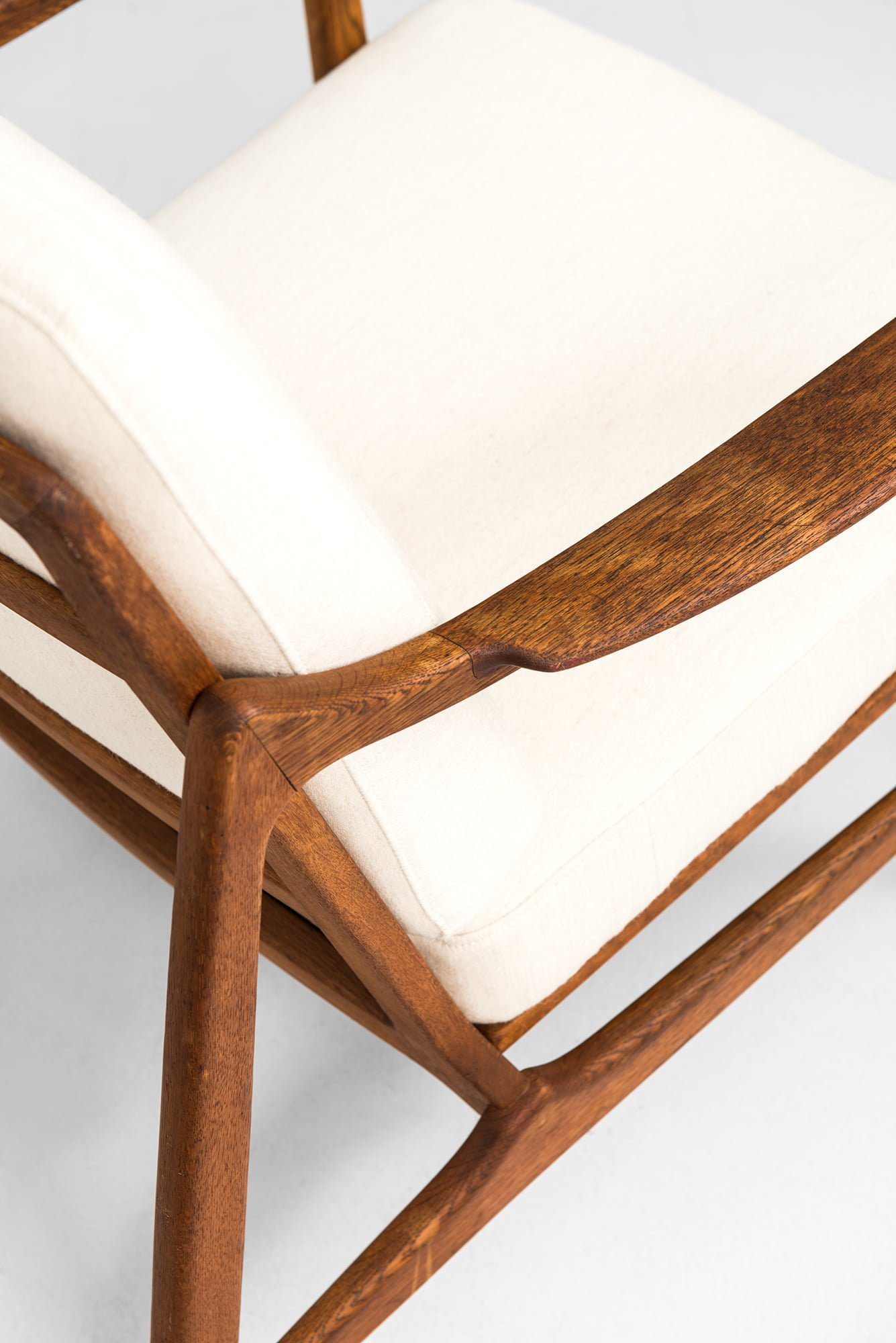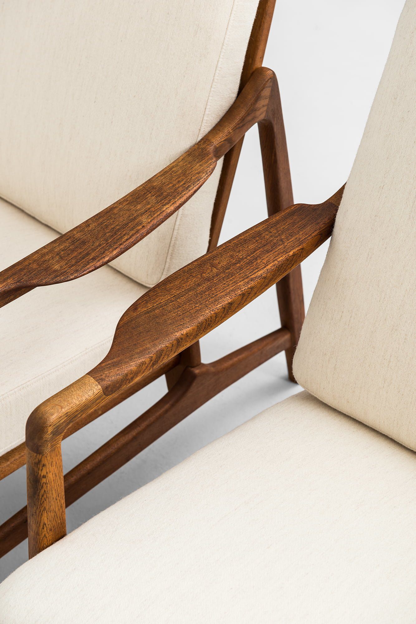 The seating and back cushions have been newly reupholstered in Savak plain, a wool fabric that was widely used in Scandinavian design during the mid-century era. The neutral tone of the upholstery complements the oak frame, reinforcing the restrained yet sophisticated aesthetic. The cushions are generously proportioned, providing comfort without compromising the clarity of the chair’s silhouette.