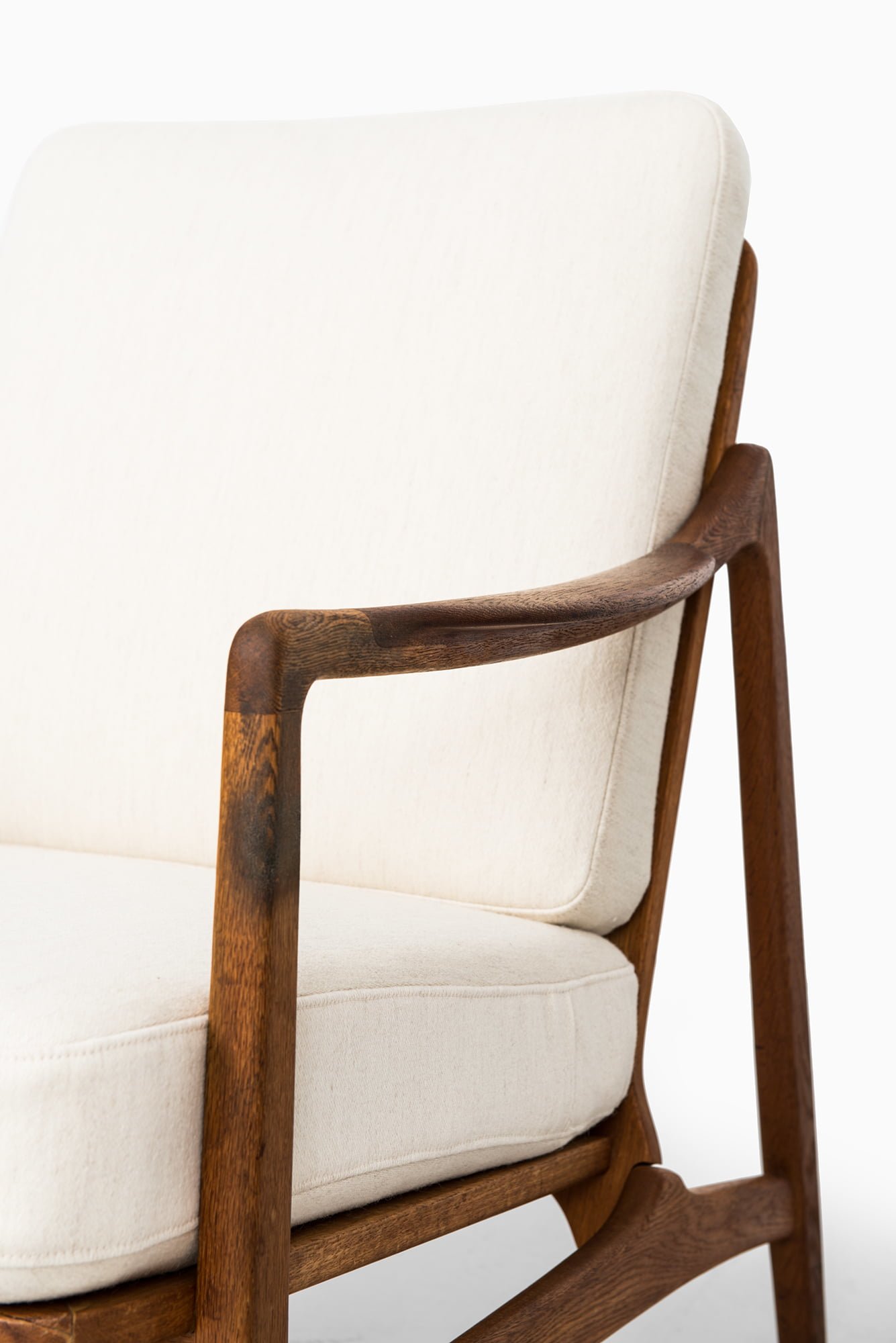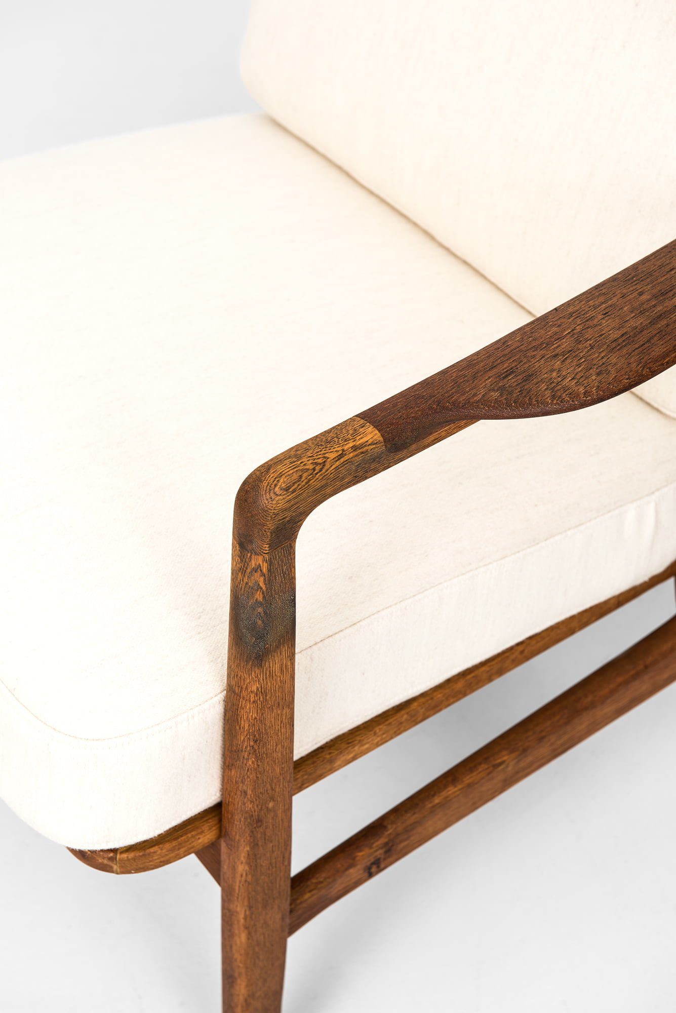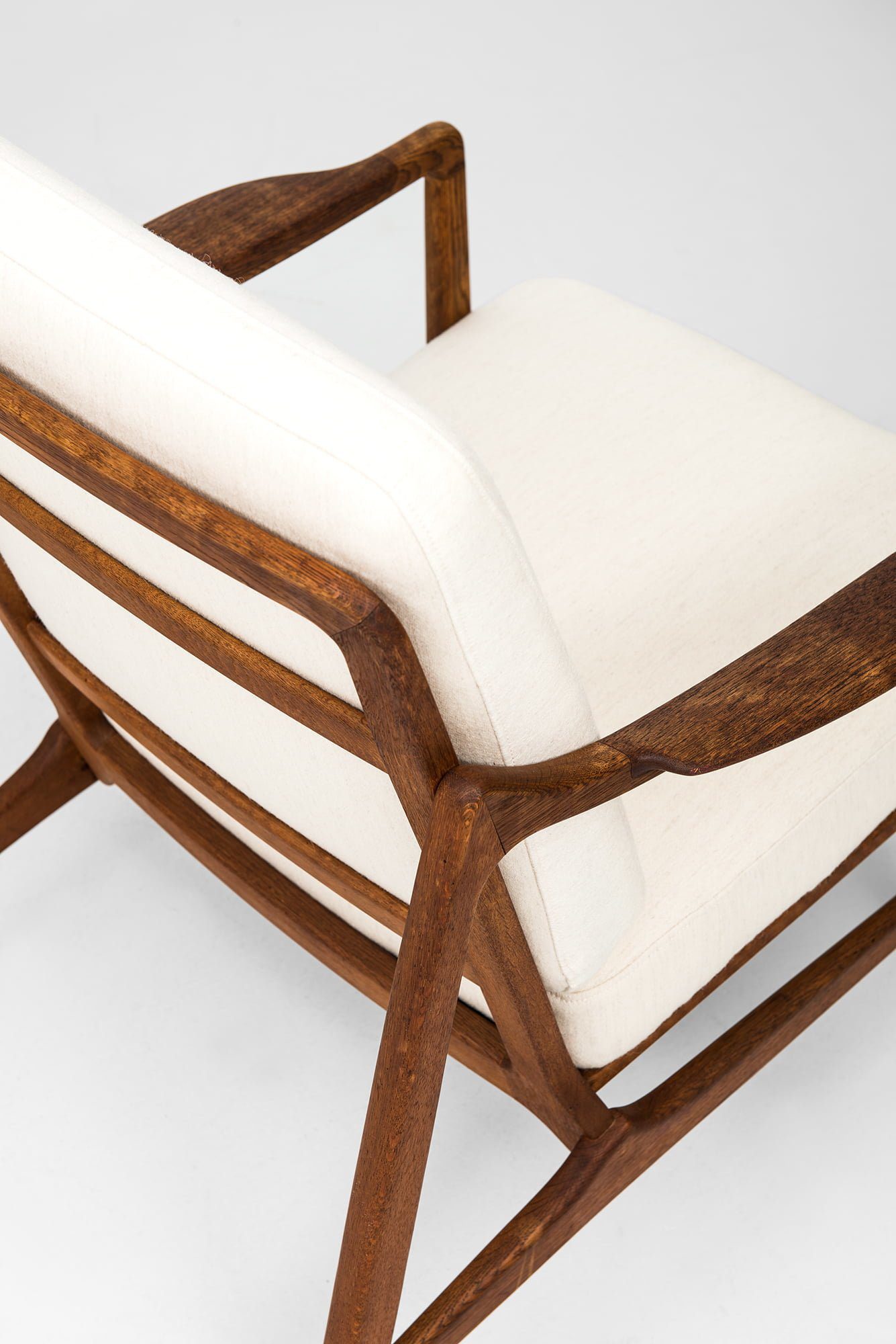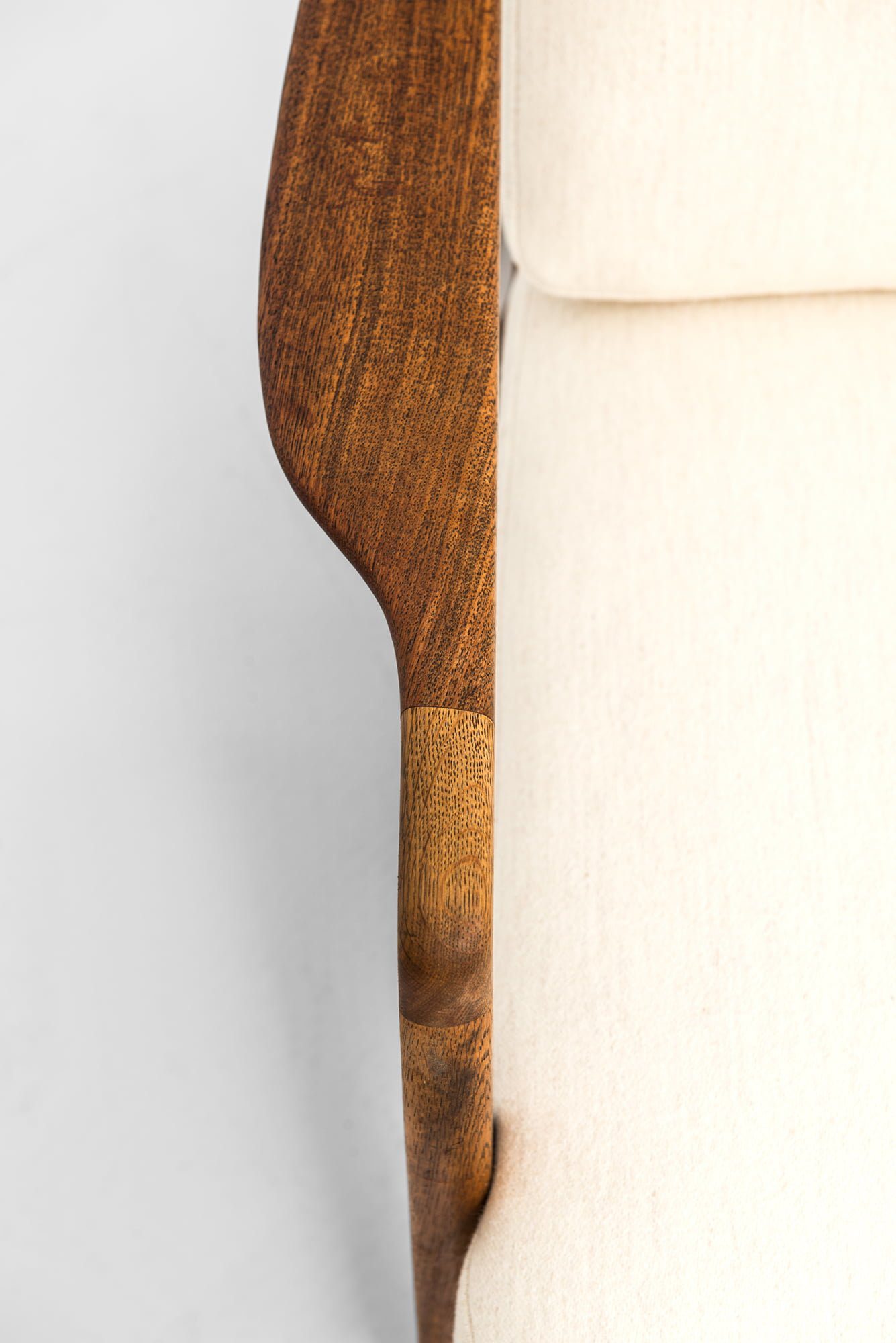 The seating and back cushions have been newly reupholstered in Savak plain, a wool fabric that was widely used in Scandinavian design during the mid-century era. The neutral tone of the upholstery complements the oak frame, reinforcing the restrained yet sophisticated aesthetic. The cushions are generously proportioned, providing comfort without compromising the clarity of the chair’s silhouette.