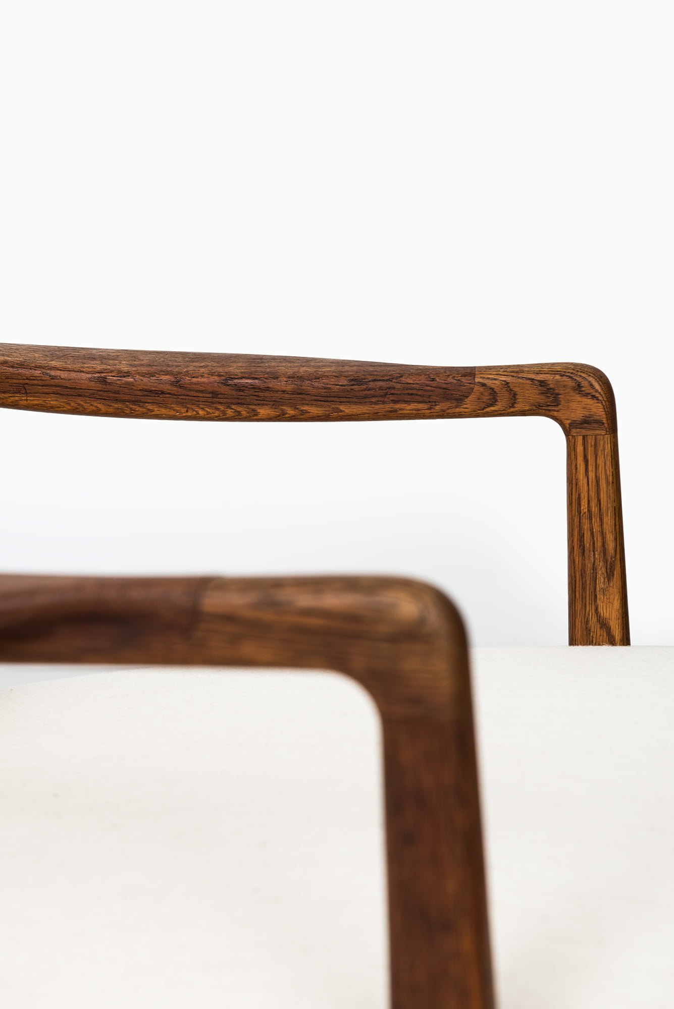 The chairs are constructed from oak, displaying a warm natural tone and a distinctive sculptural frame with gently sloping armrests. The construction highlights the designers’ ability to merge organic shapes with functional stability, producing a frame that is both visually light and structurally solid. The oak frames carry a subtle patina that reflects careful use and age, enhancing the authenticity of the pieces while preserving their integrity.