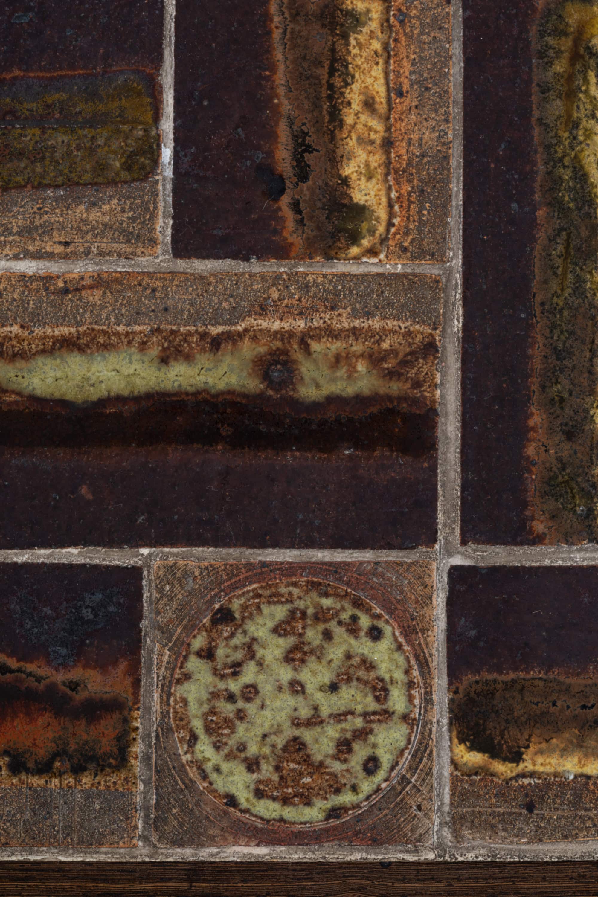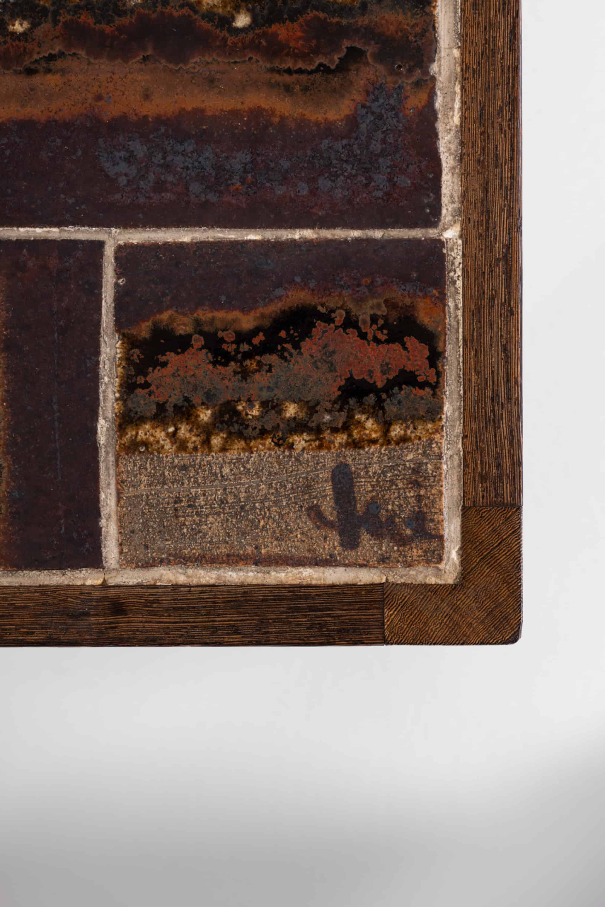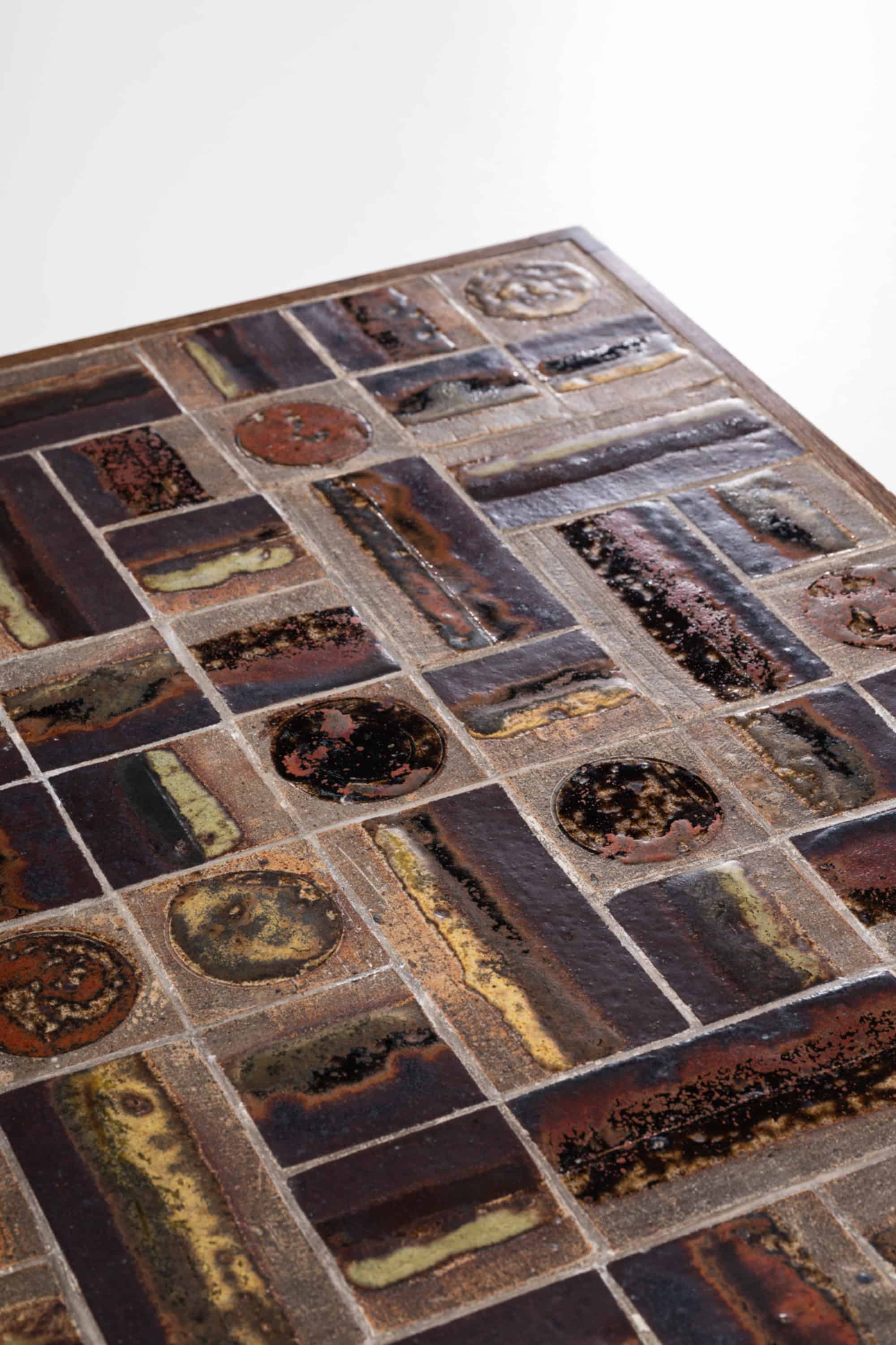 The top is composed of individually hand-glazed ceramic tiles designed by Tue Poulsen. Arranged in a geometric grid, the composition combines rectangular and circular elements, creating a rhythmic and varied surface. The glaze displays a rich palette of earthy tones, including deep browns, ochres, and muted greens, with areas of mottling, pooling, and textural variation that give each tile a unique character. One tile bears the signature “Tue” underscoring the artistic origin of the ceramic work.