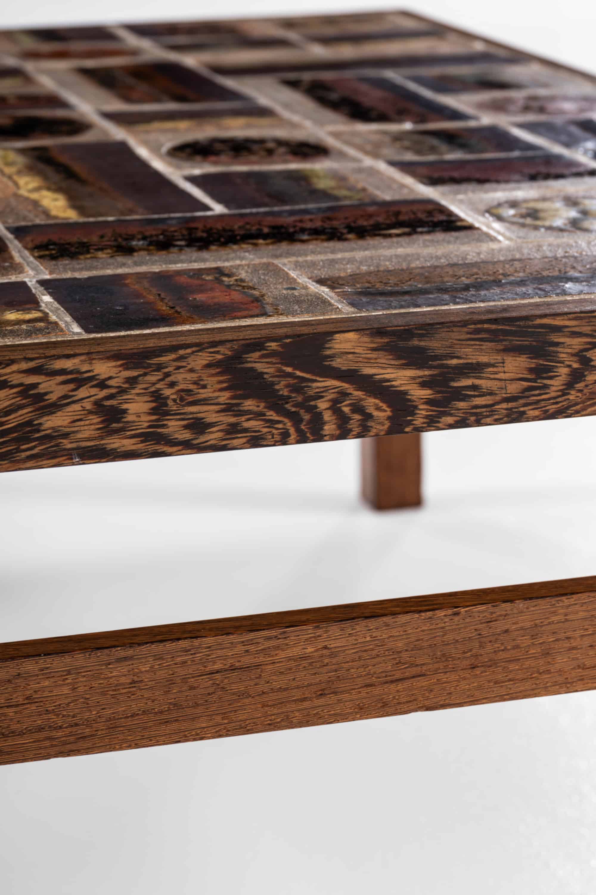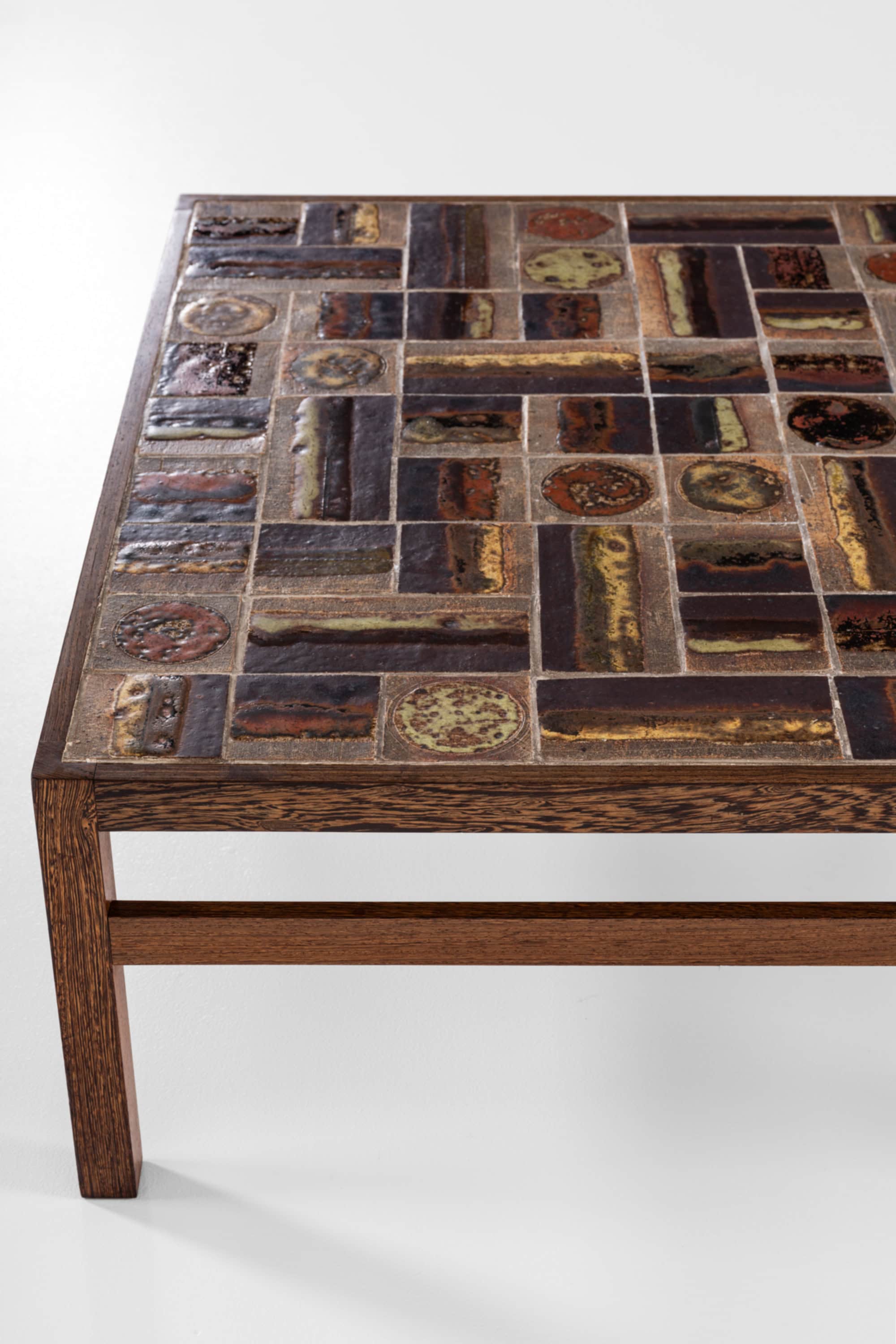 The contrast between the dark, structured wengé frame and the expressive, tactile tile surface creates a balanced interplay between form and decoration. The table functions equally as a practical piece of furniture and as a sculptural object, reflecting the Scandinavian approach of integrating art into everyday design.