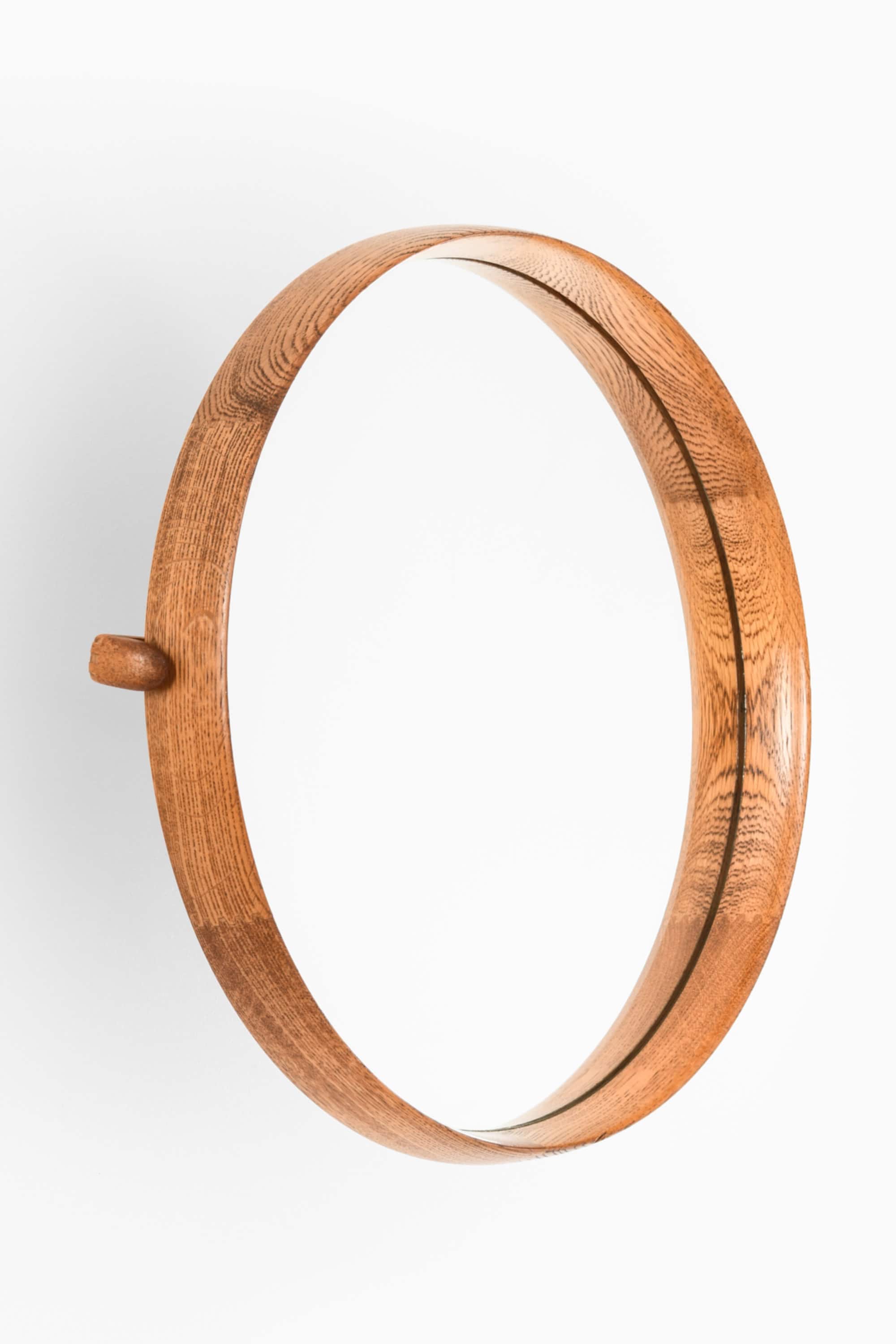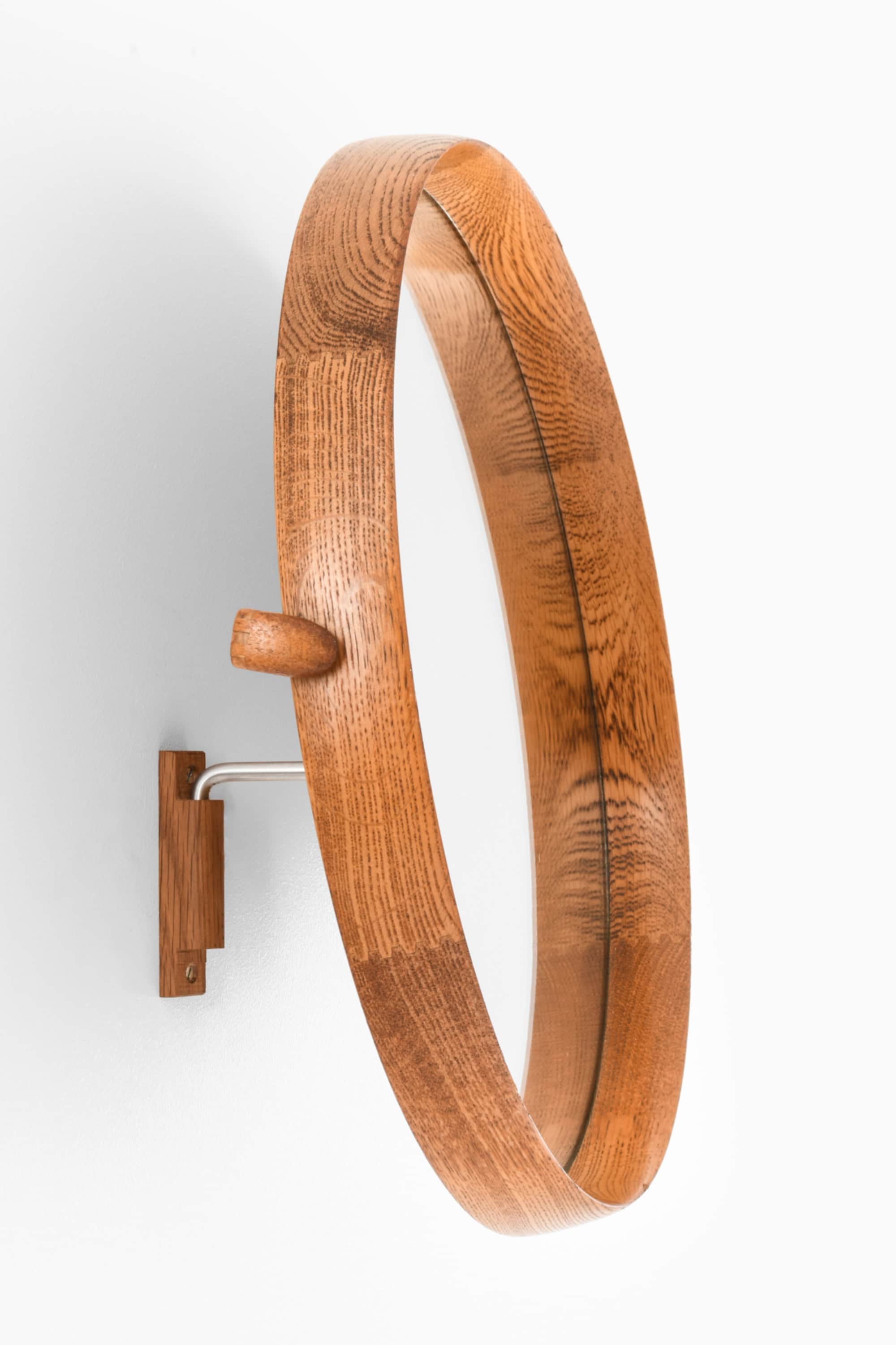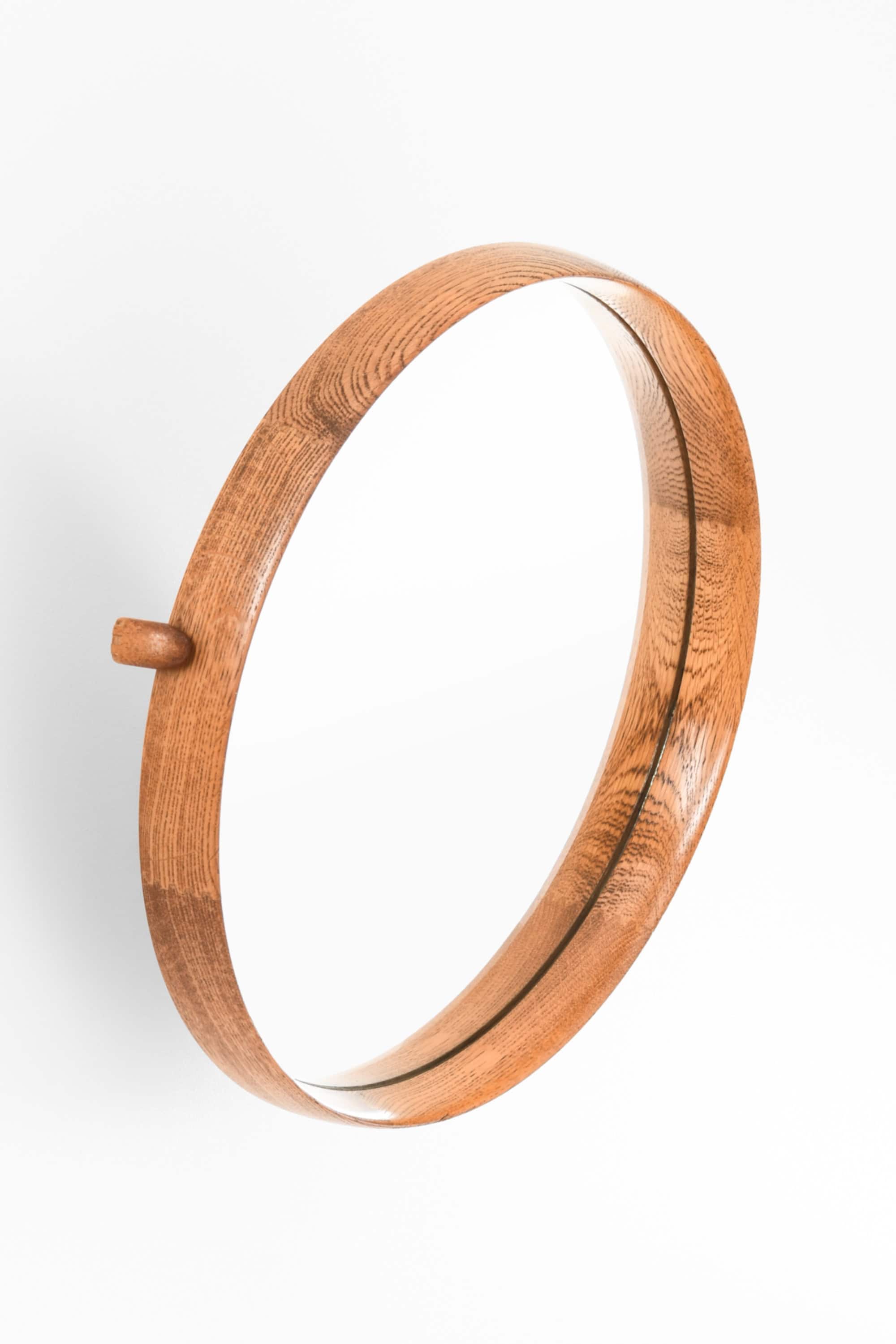This wall mirror is a rare design by Uno & Östen Kristiansson, produced by Luxus in Vittsjö, Sweden. It features a circular oak frame with a warm, natural grain and a fine central inlay detail, giving the mirror a distinctive Scandinavian character. The frame is mounted on a pivoting steel bracket that allows the mirror to be easily tilted and adjusted, making it highly functional in addition to its sculptural presence.