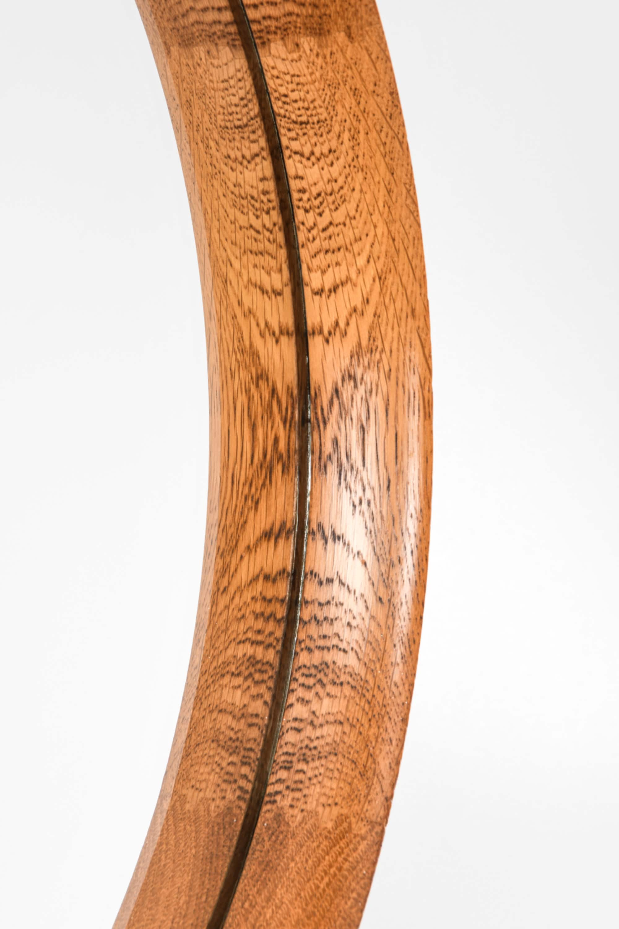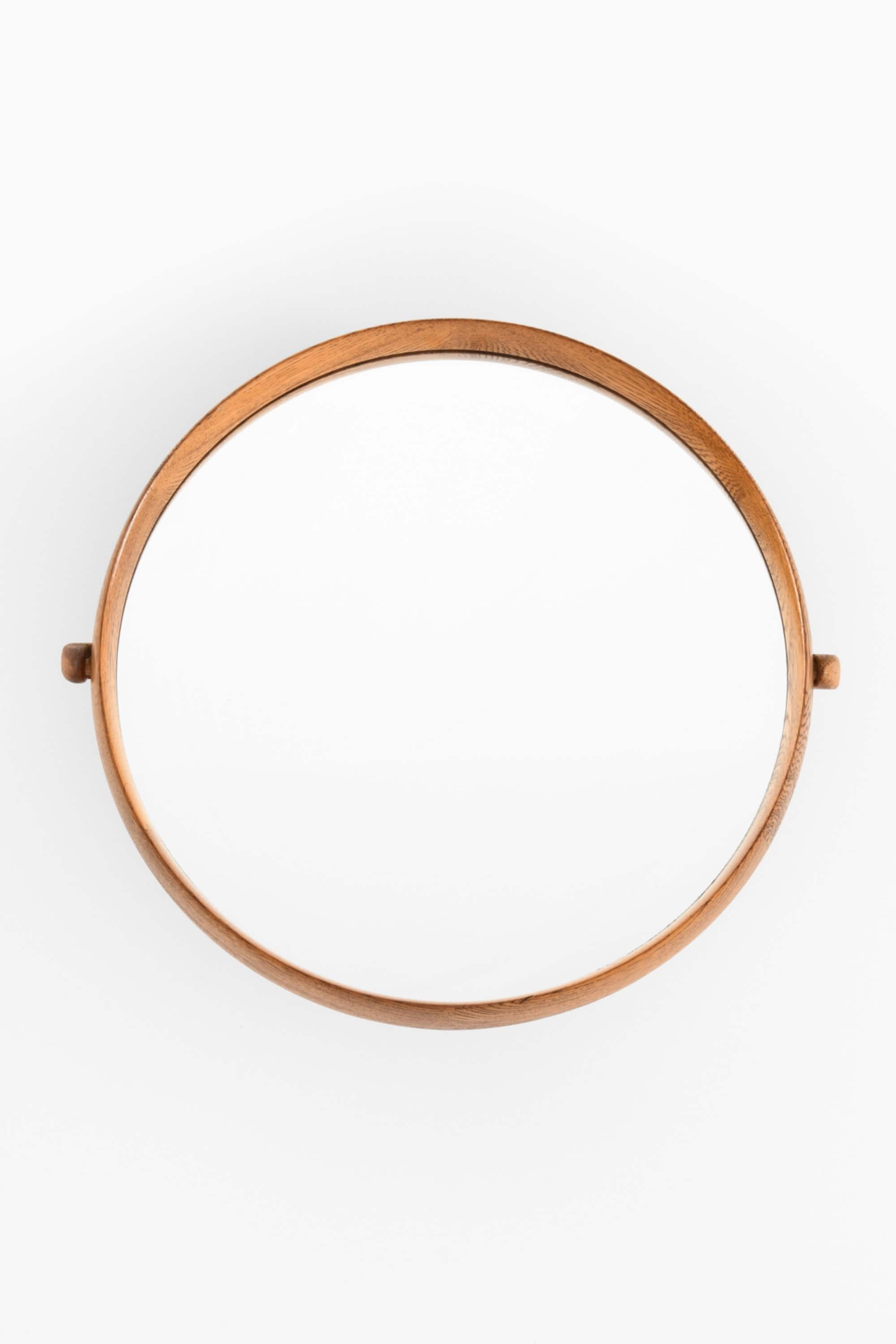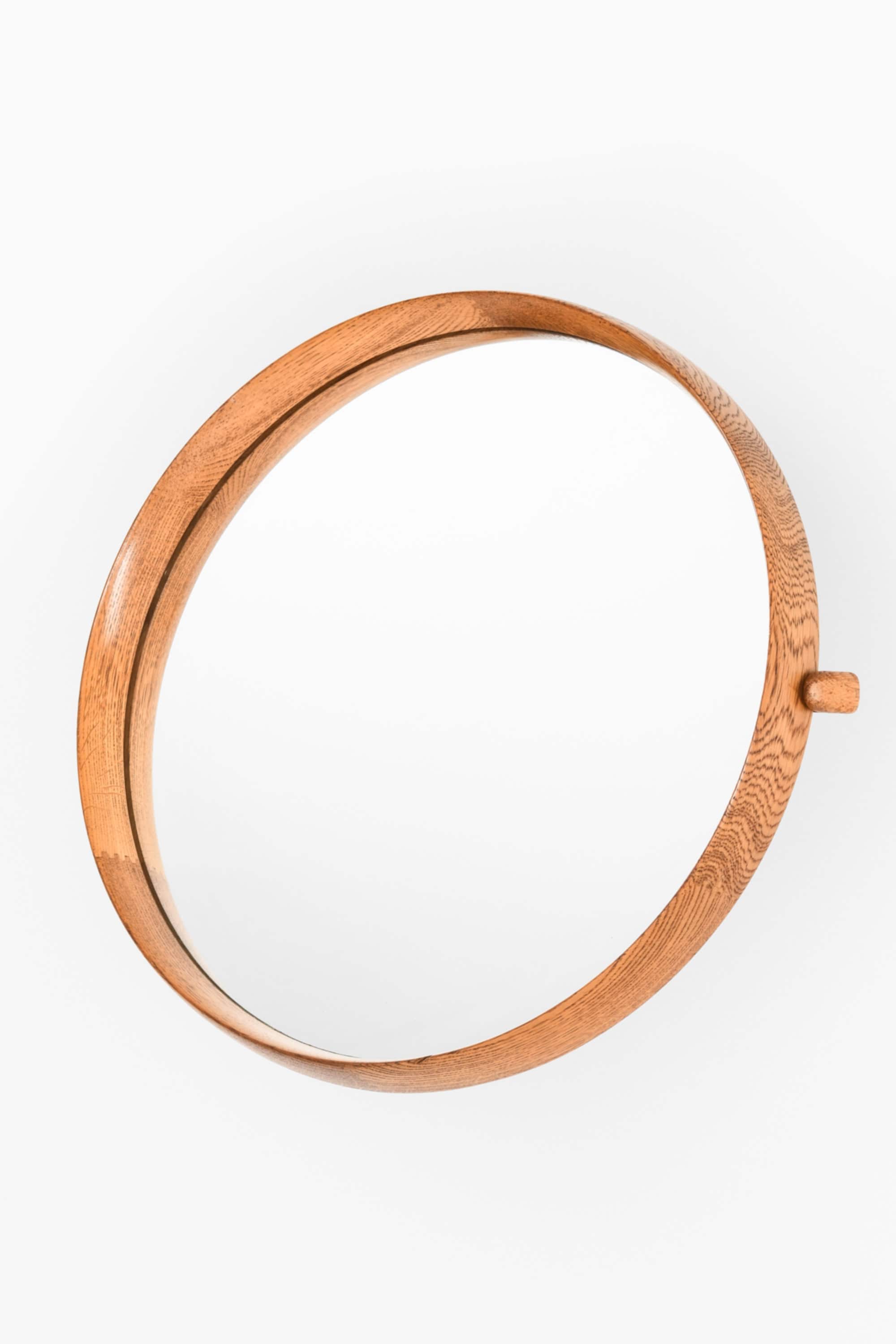 This wall mirror is a rare design by Uno & Östen Kristiansson, produced by Luxus in Vittsjö, Sweden. It features a circular oak frame with a warm, natural grain and a fine central inlay detail, giving the mirror a distinctive Scandinavian character. The frame is mounted on a pivoting steel bracket that allows the mirror to be easily tilted and adjusted, making it highly functional in addition to its sculptural presence.