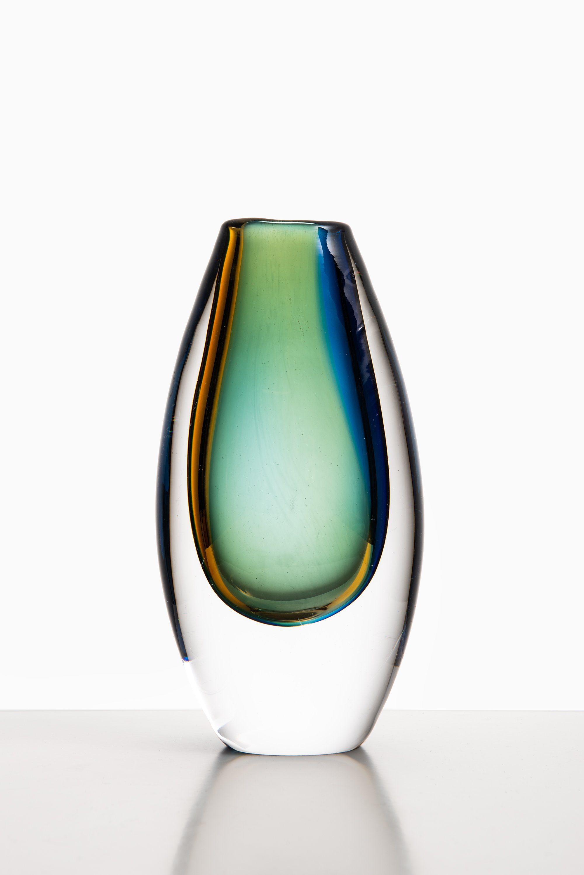 This striking glass vase was designed by Vicke Lindstrand and produced by Kosta Glasbruk in Sweden during the 1960s. Lindstrand, a central figure in 20th-century Scandinavian glass art, was known for his masterful use of color layering and organic forms, combining technical innovation with sculptural elegance. His work helped position Kosta as one of the leading glassworks in Europe during the postwar period.