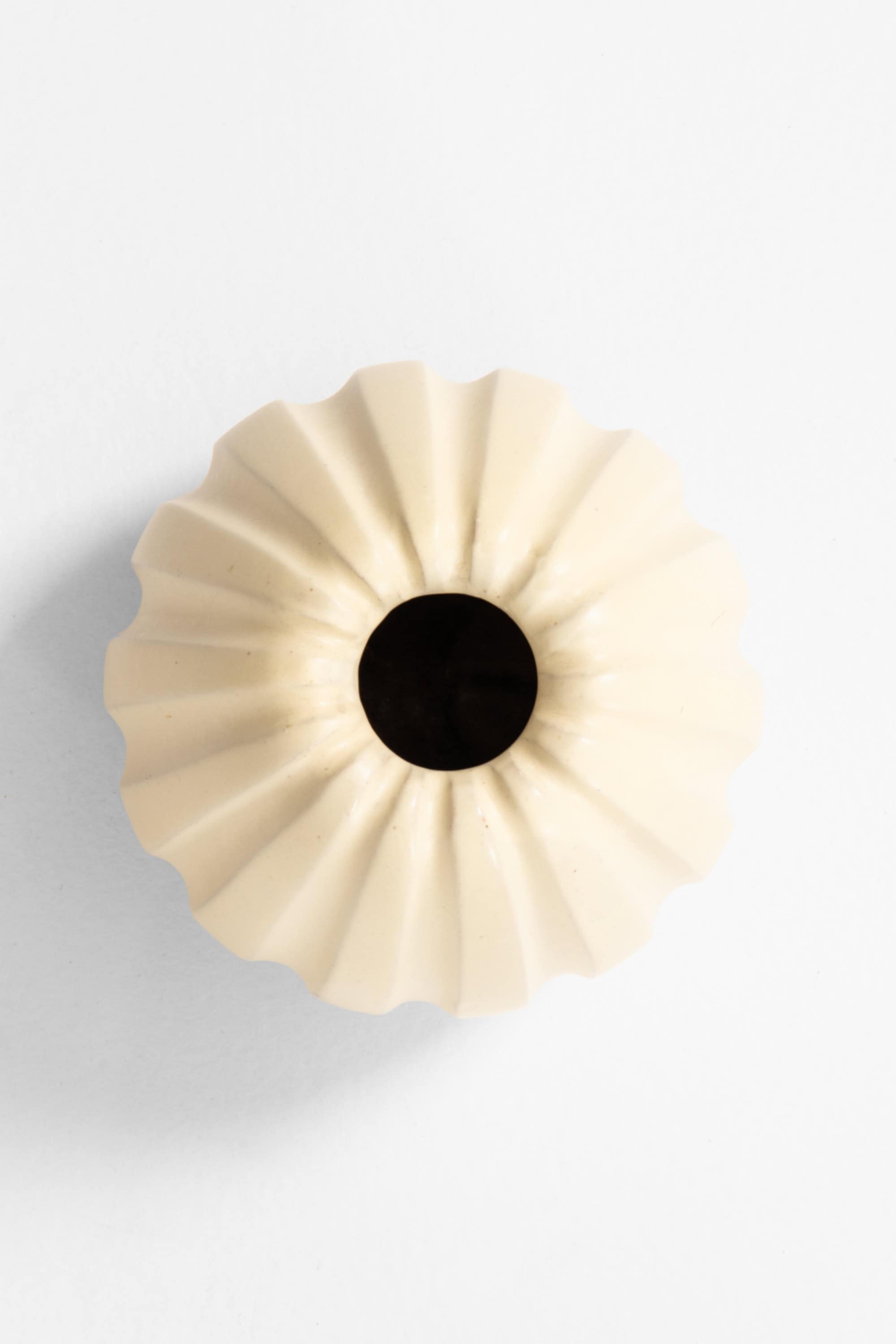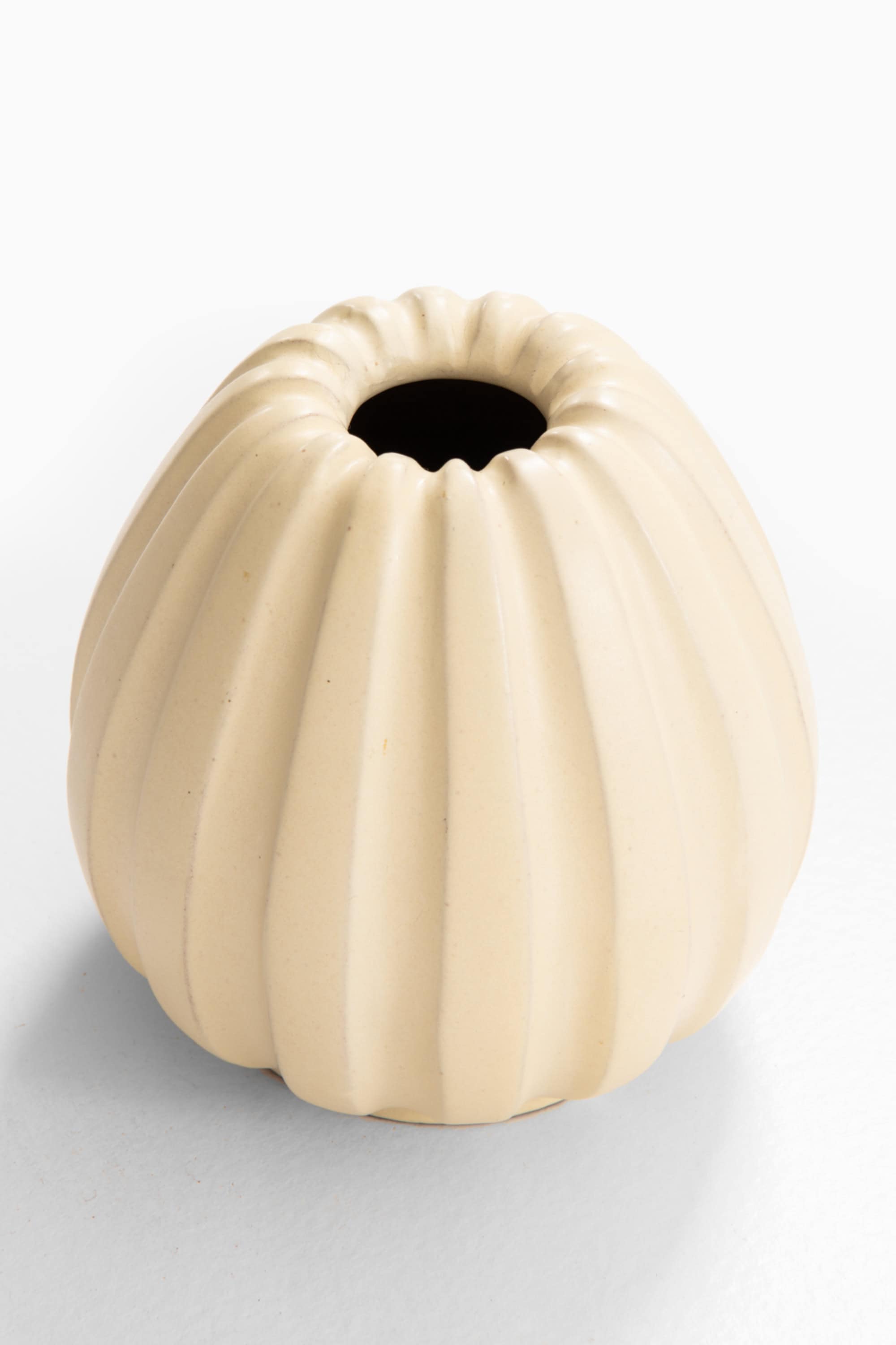 The vase features a compact, rounded body with vertically fluted sides that create a soft, rhythmic surface. The form tapers slightly toward the base and opens into a subtly undulating mouth, giving the piece a calm but organic presence. It is finished in a light cream to warm ivory glaze, typical of Upsala Ekeby’s refined stoneware production during this period. The glaze is softly satin-like, allowing the sculpted ribs to catch light and shadow without excessive contrast.