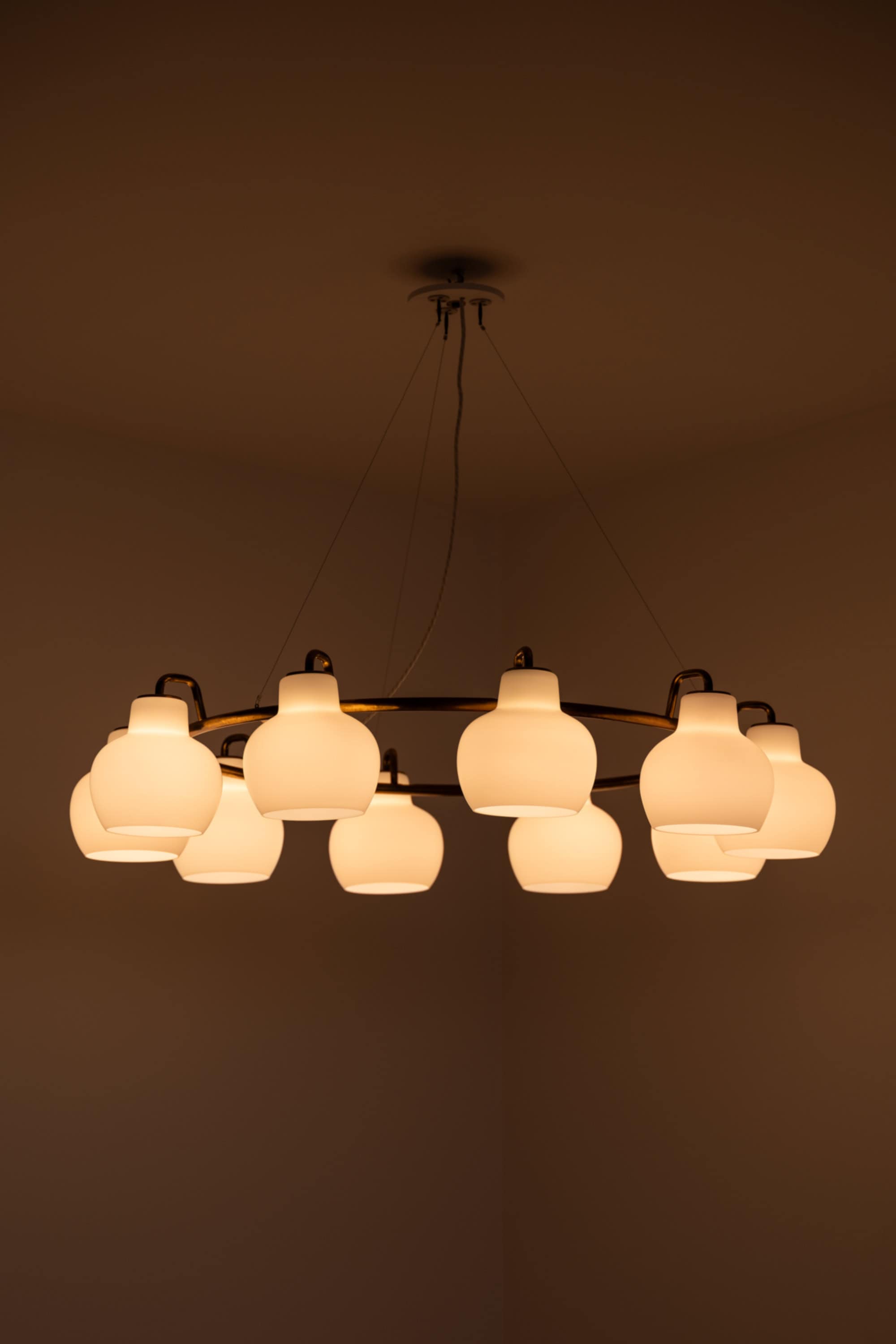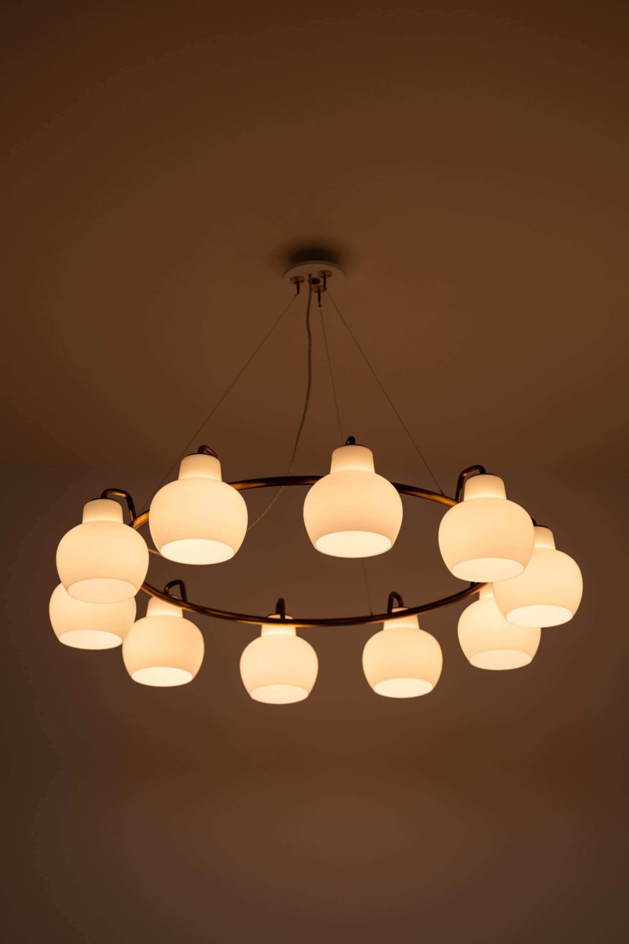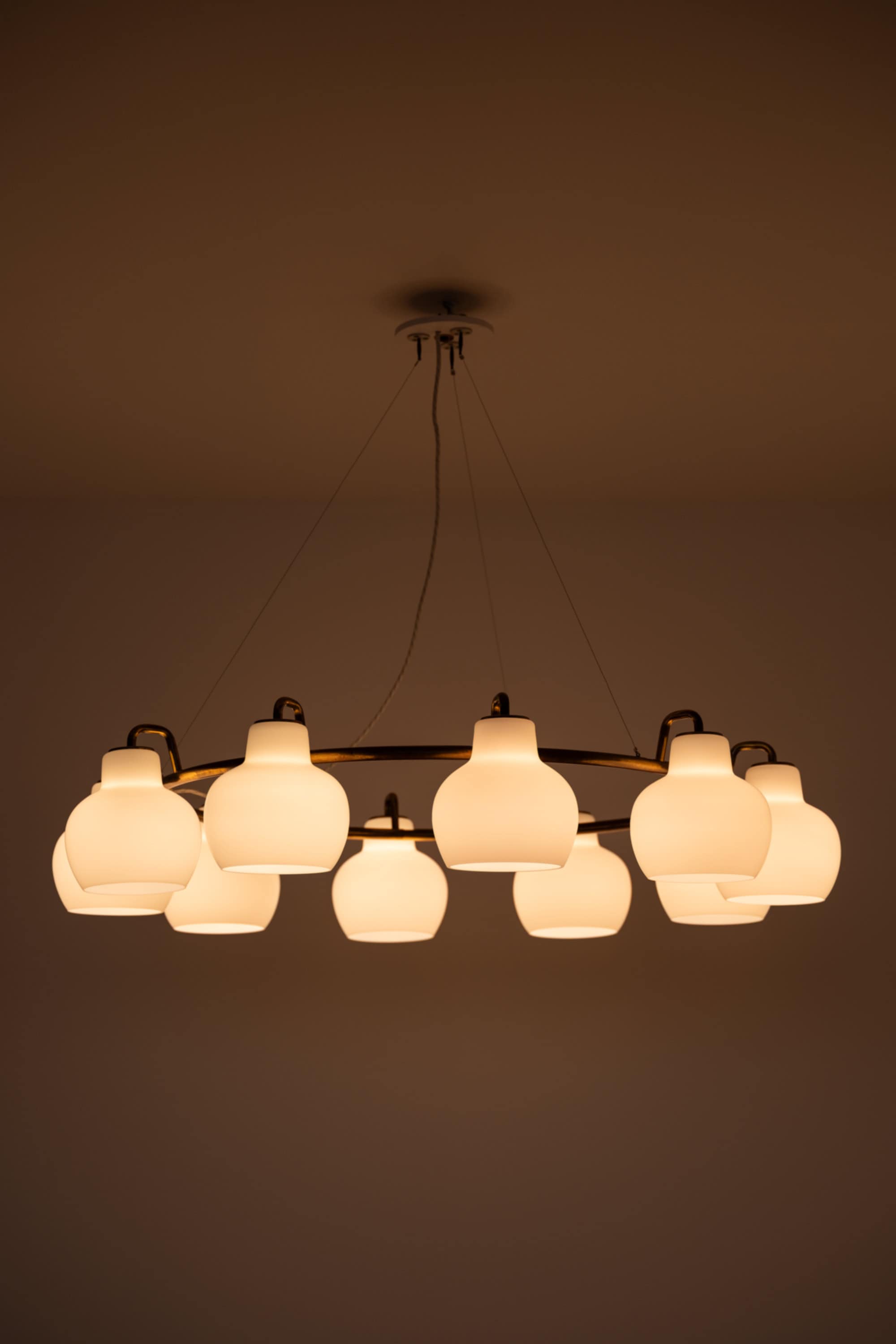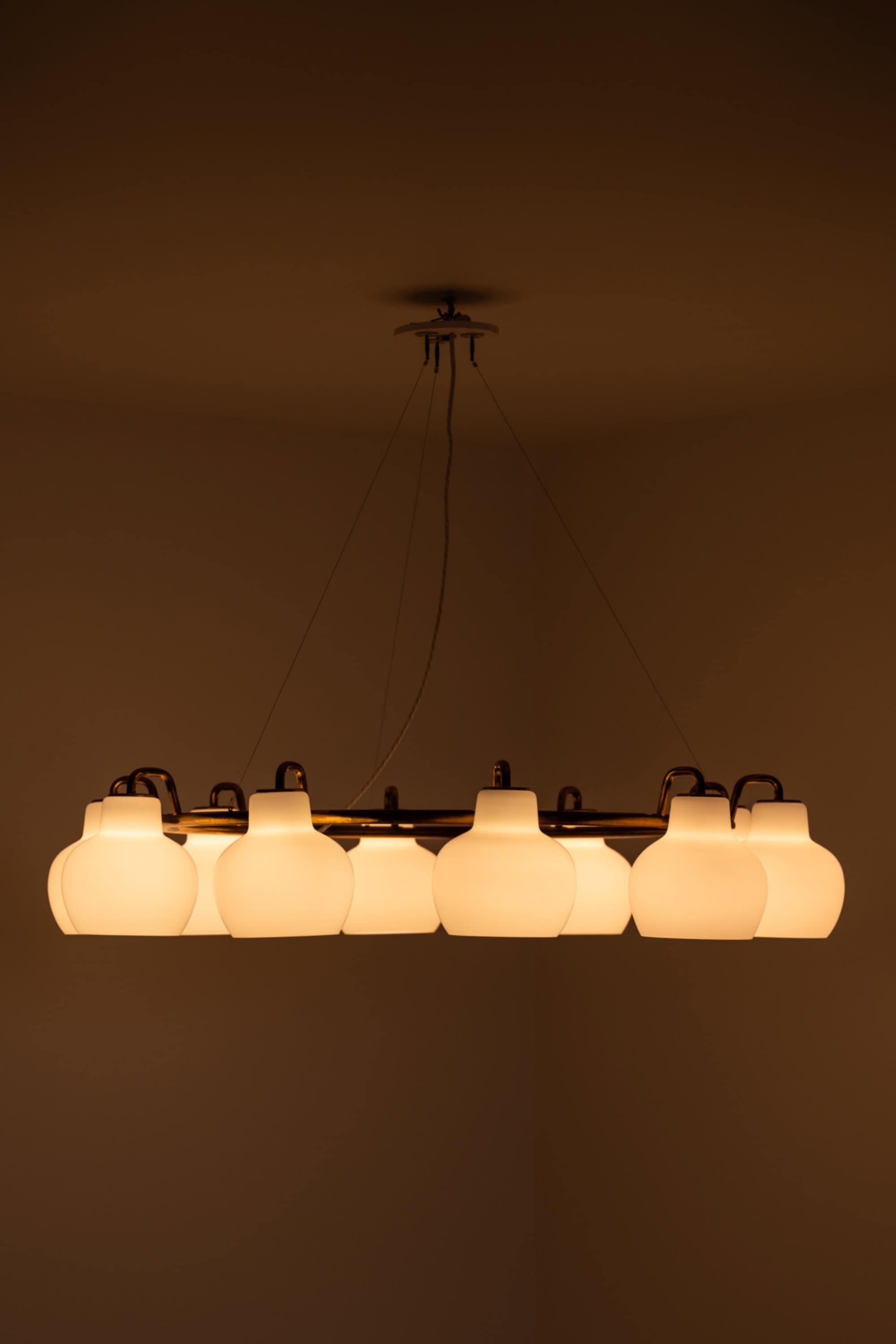 Each shade is executed in matte opaline glass with a softly rounded, bulbous profile that narrows slightly at the top and opens downward. When unlit, the glass appears satin white with a smooth, diffused surface. When illuminated, the shades emit a warm, evenly distributed light, producing a soft ambient glow while minimizing glare. The repeated rhythm of the ten glass volumes around the ring creates a strong visual cadence, characteristic of Lauritzen’s systematic and architectural design language.