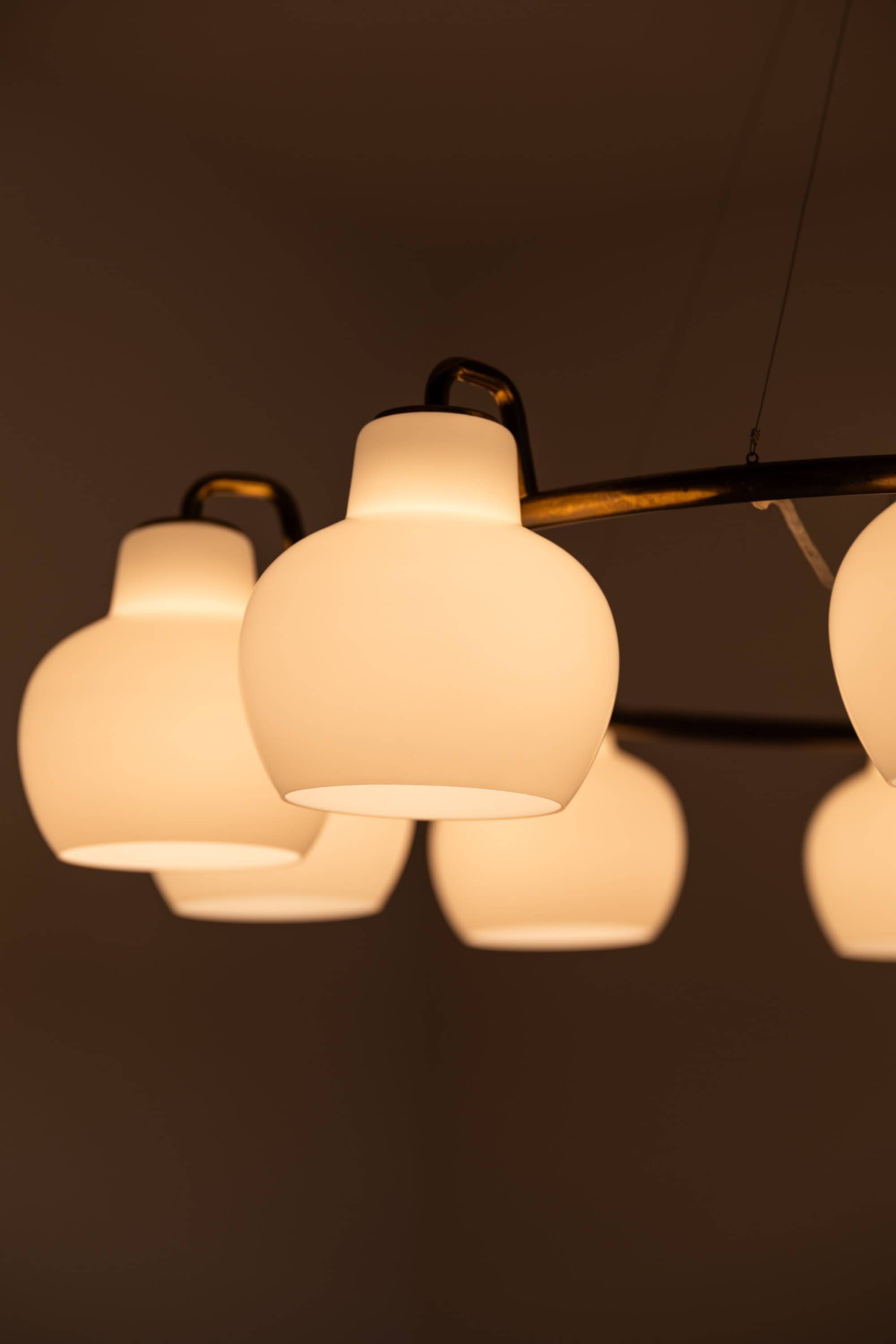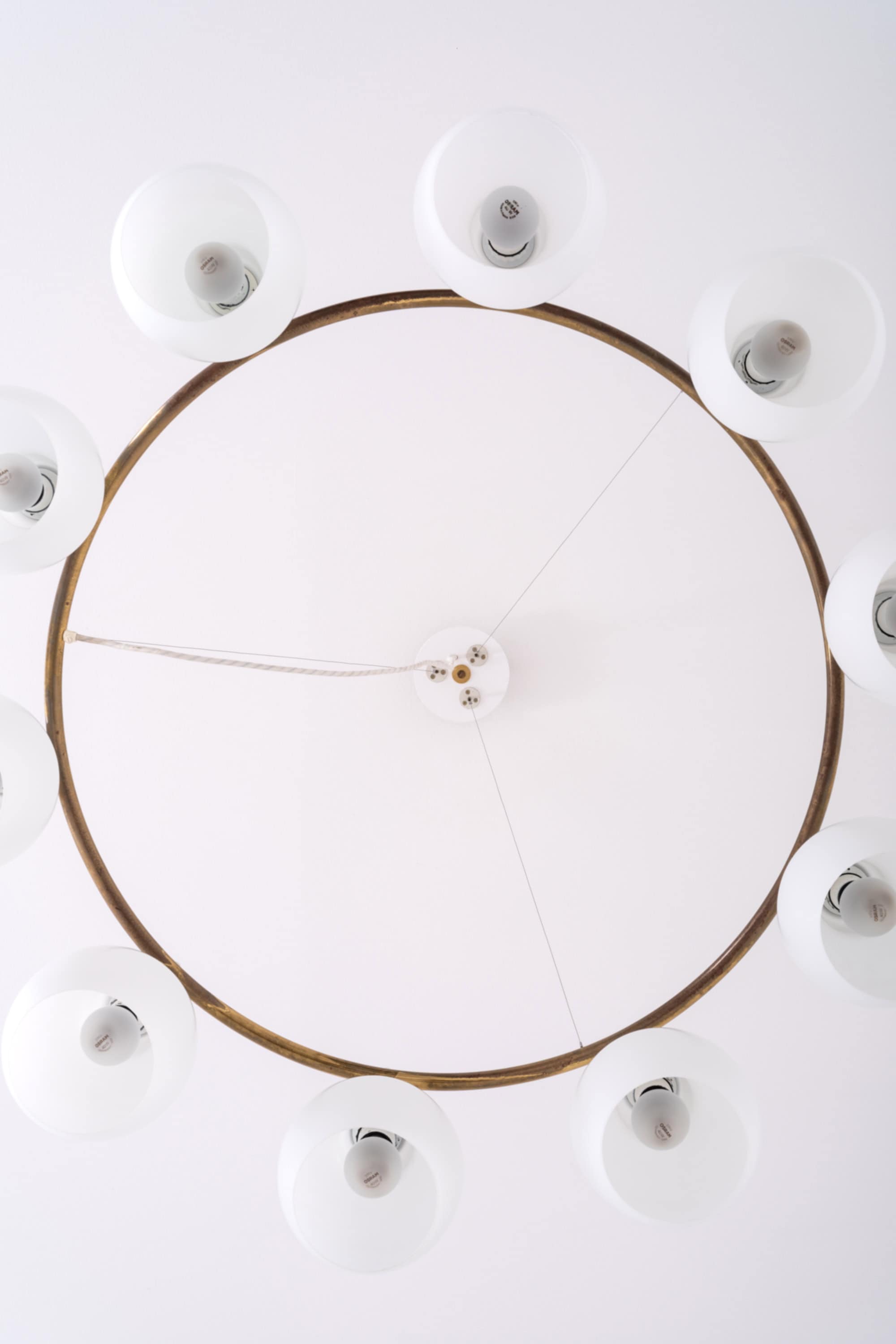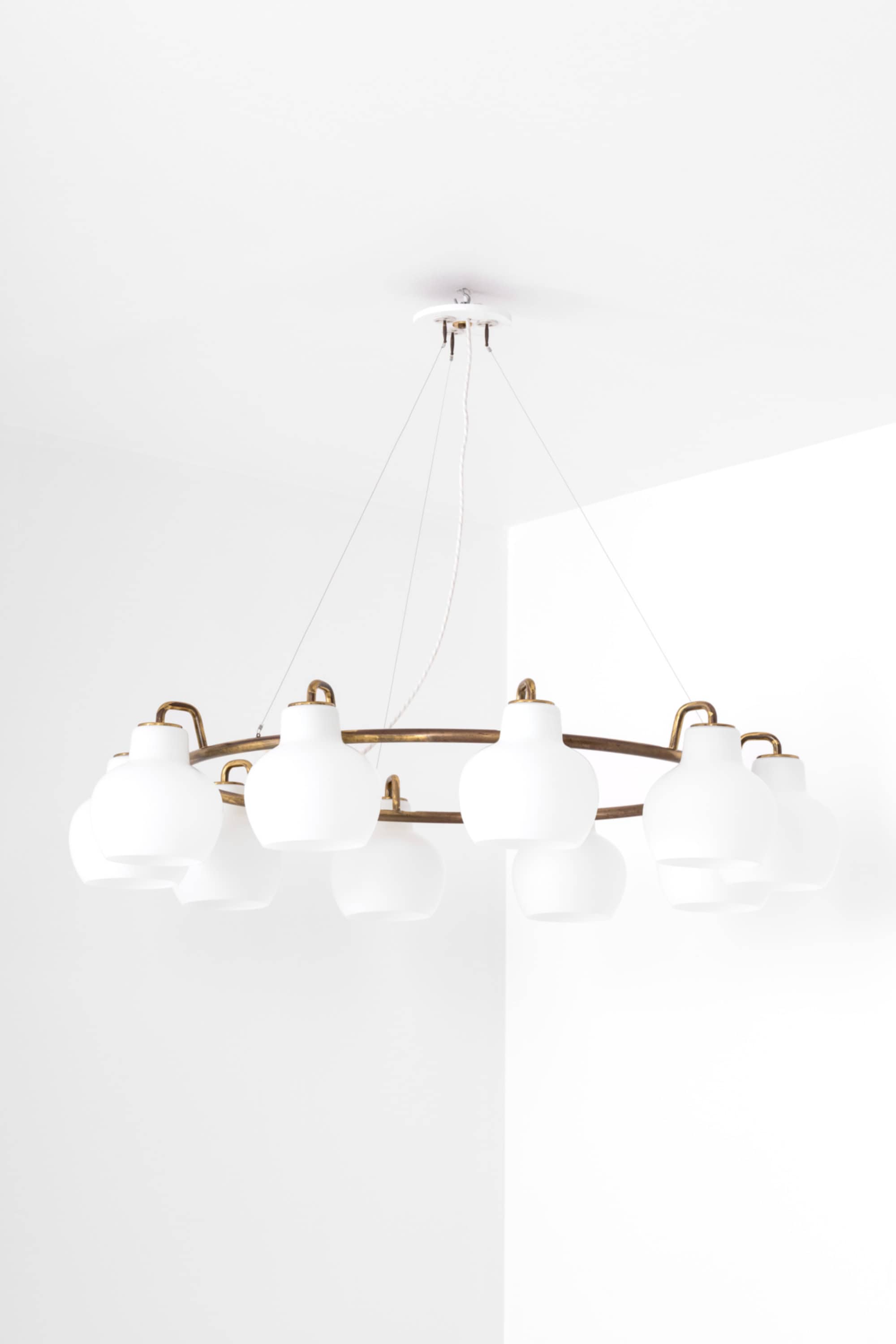 Each shade is executed in matte opaline glass with a softly rounded, bulbous profile that narrows slightly at the top and opens downward. When unlit, the glass appears satin white with a smooth, diffused surface. When illuminated, the shades emit a warm, evenly distributed light, producing a soft ambient glow while minimizing glare. The repeated rhythm of the ten glass volumes around the ring creates a strong visual cadence, characteristic of Lauritzen’s systematic and architectural design language.