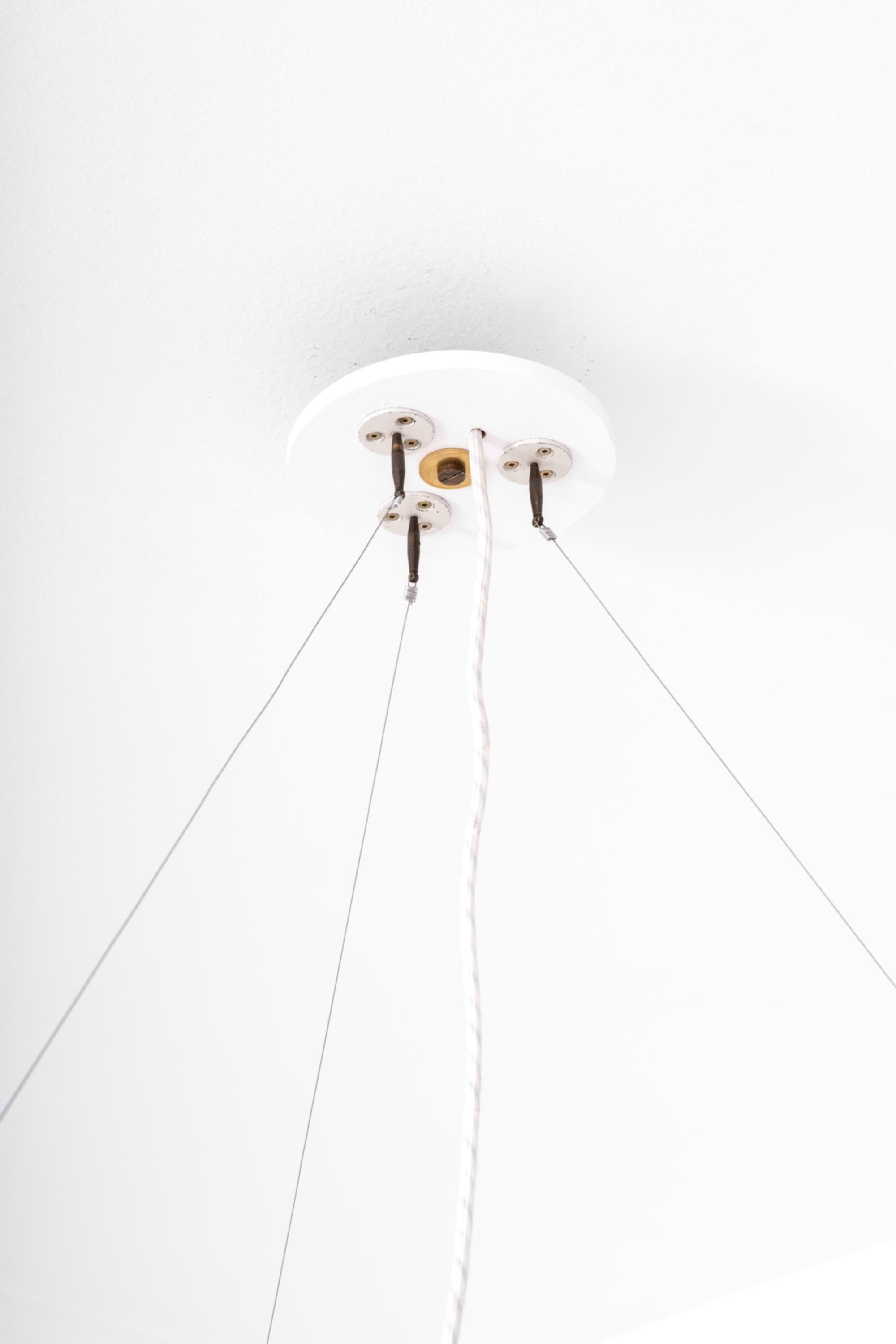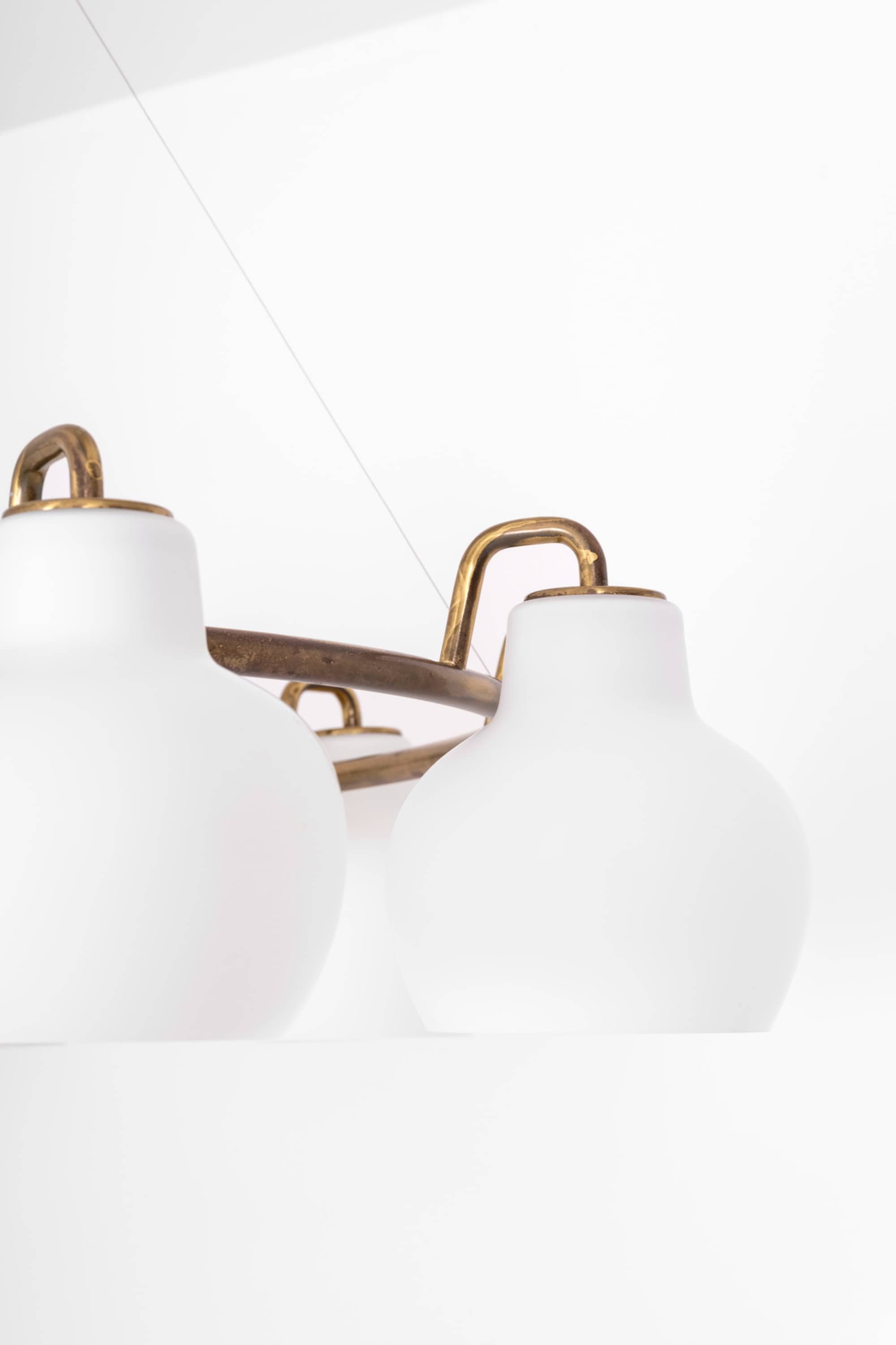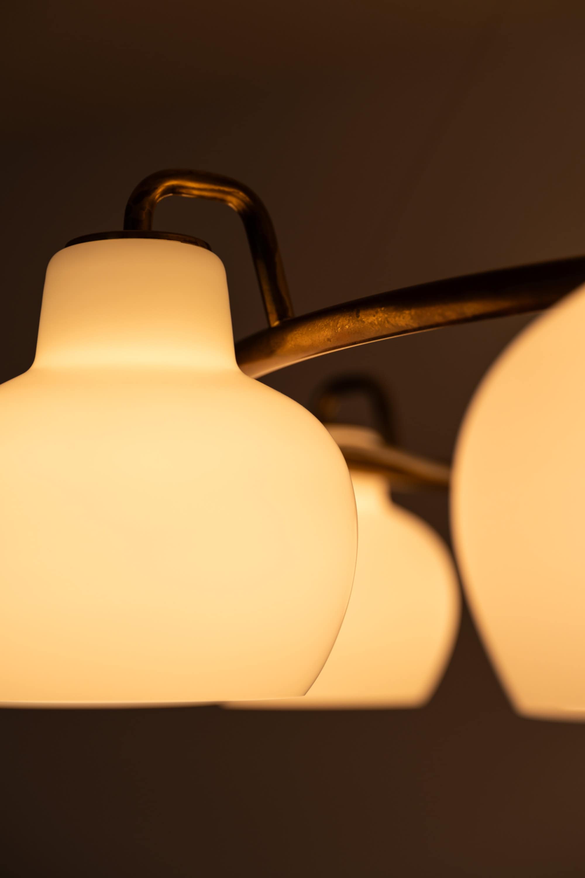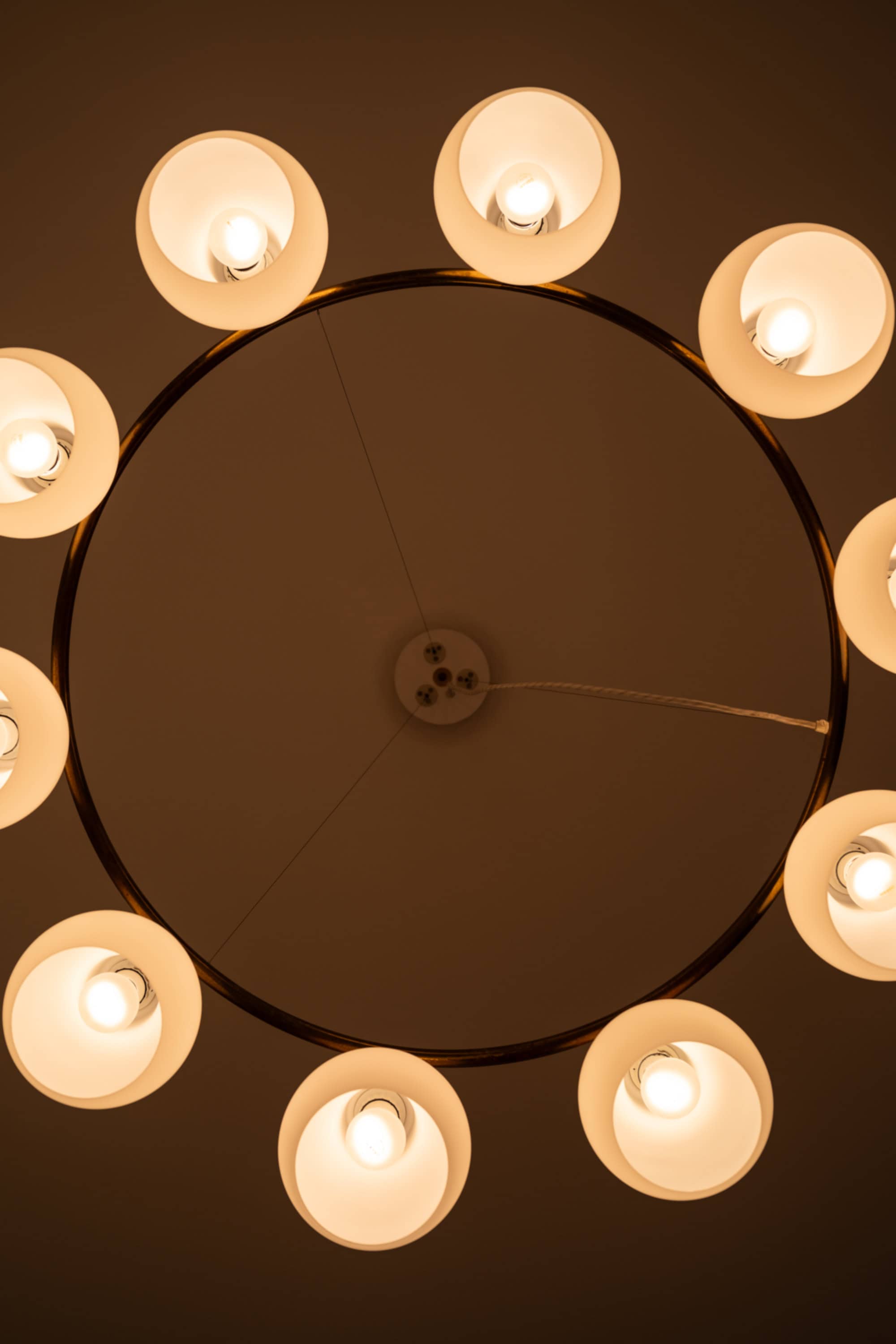 Each shade is executed in matte opaline glass with a softly rounded, bulbous profile that narrows slightly at the top and opens downward. When unlit, the glass appears satin white with a smooth, diffused surface. When illuminated, the shades emit a warm, evenly distributed light, producing a soft ambient glow while minimizing glare. The repeated rhythm of the ten glass volumes around the ring creates a strong visual cadence, characteristic of Lauritzen’s systematic and architectural design language.