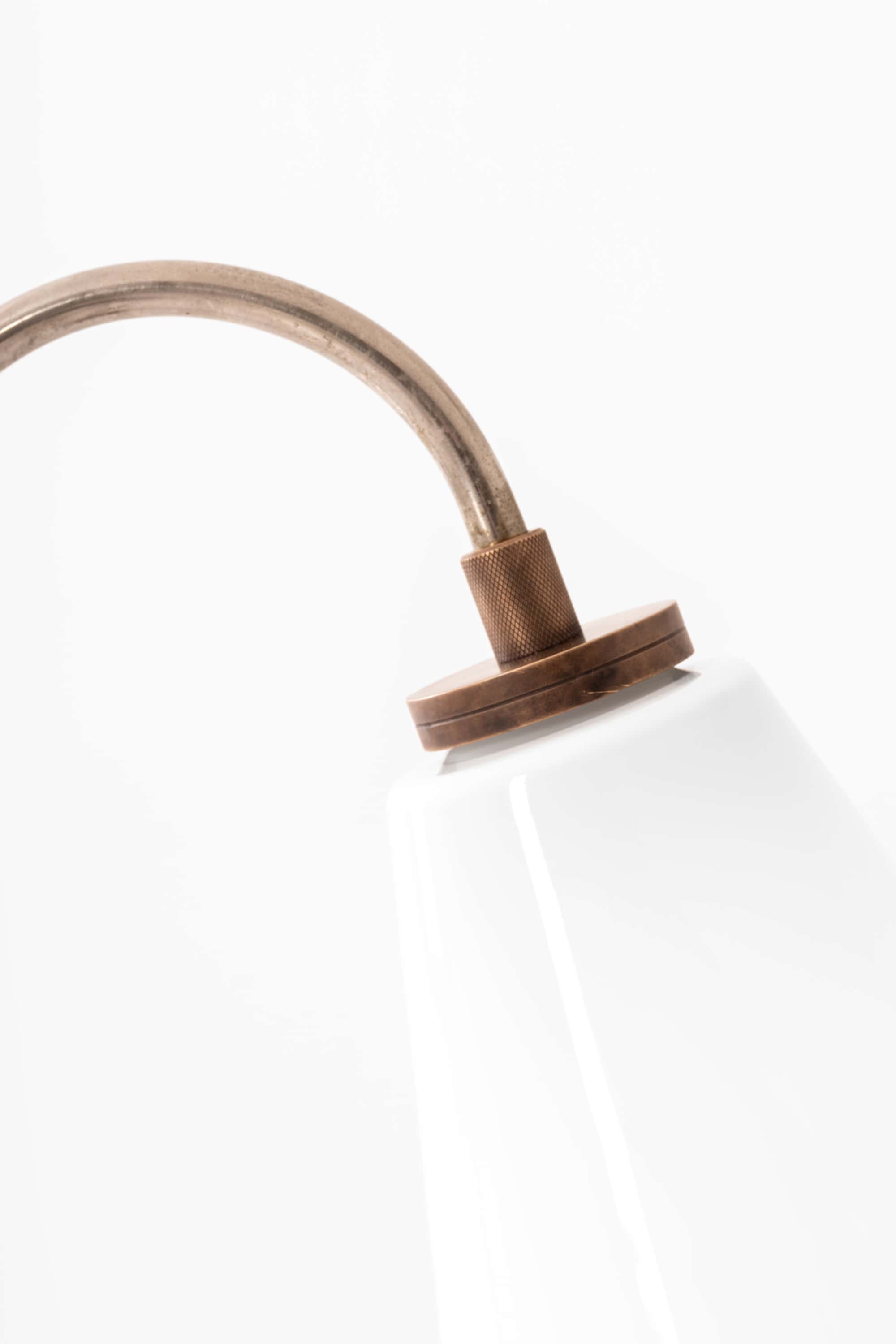 The shade is formed in opaline glass, tapering slightly to create a soft conical profile. It diffuses the light evenly, producing a warm and atmospheric glow while maintaining functional downward illumination. The brass gallery and fittings provide a subtle contrast to the matte translucency of the glass. The shade is likely a later replacement, yet remains highly sympathetic to the original design language.