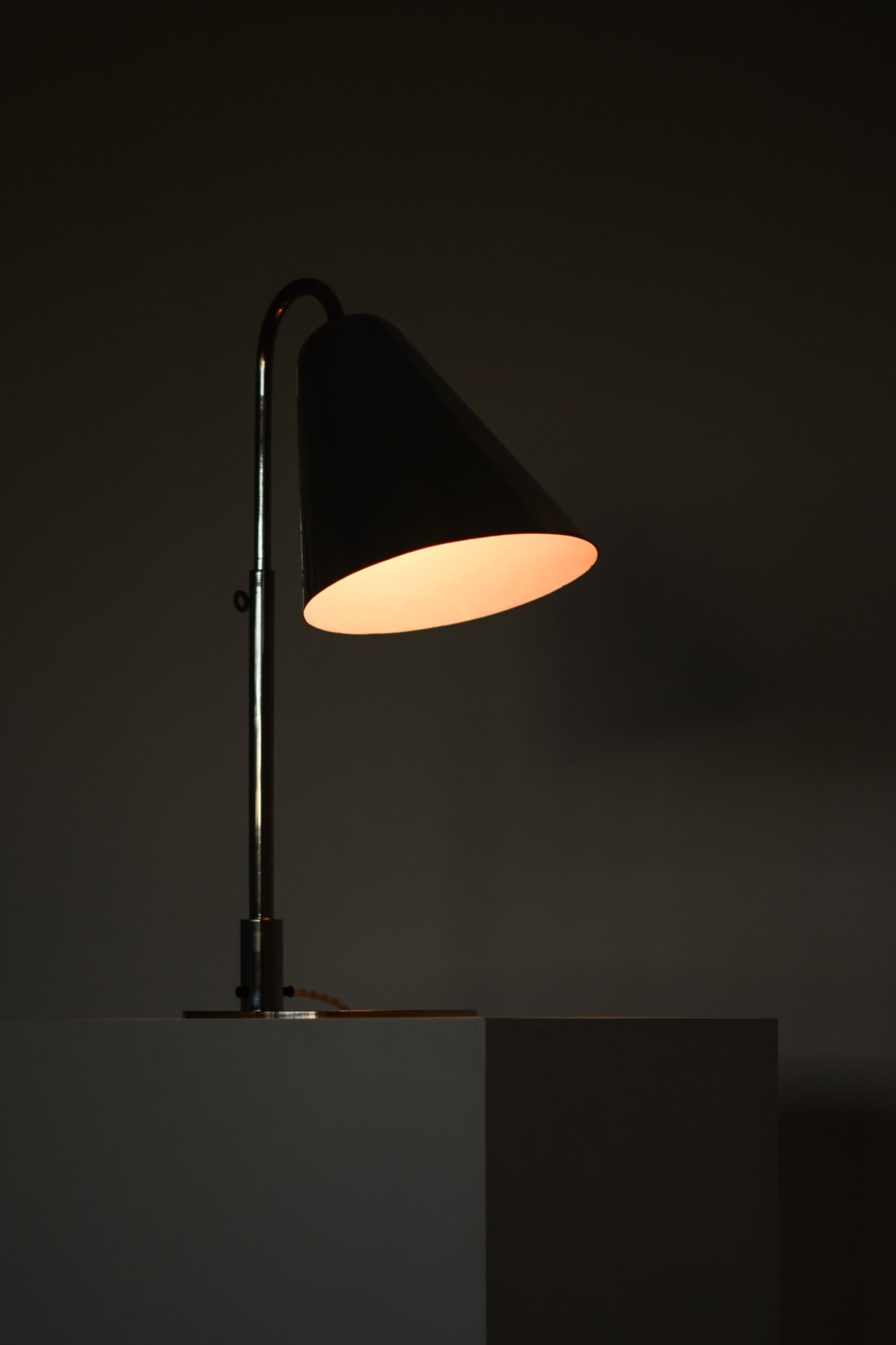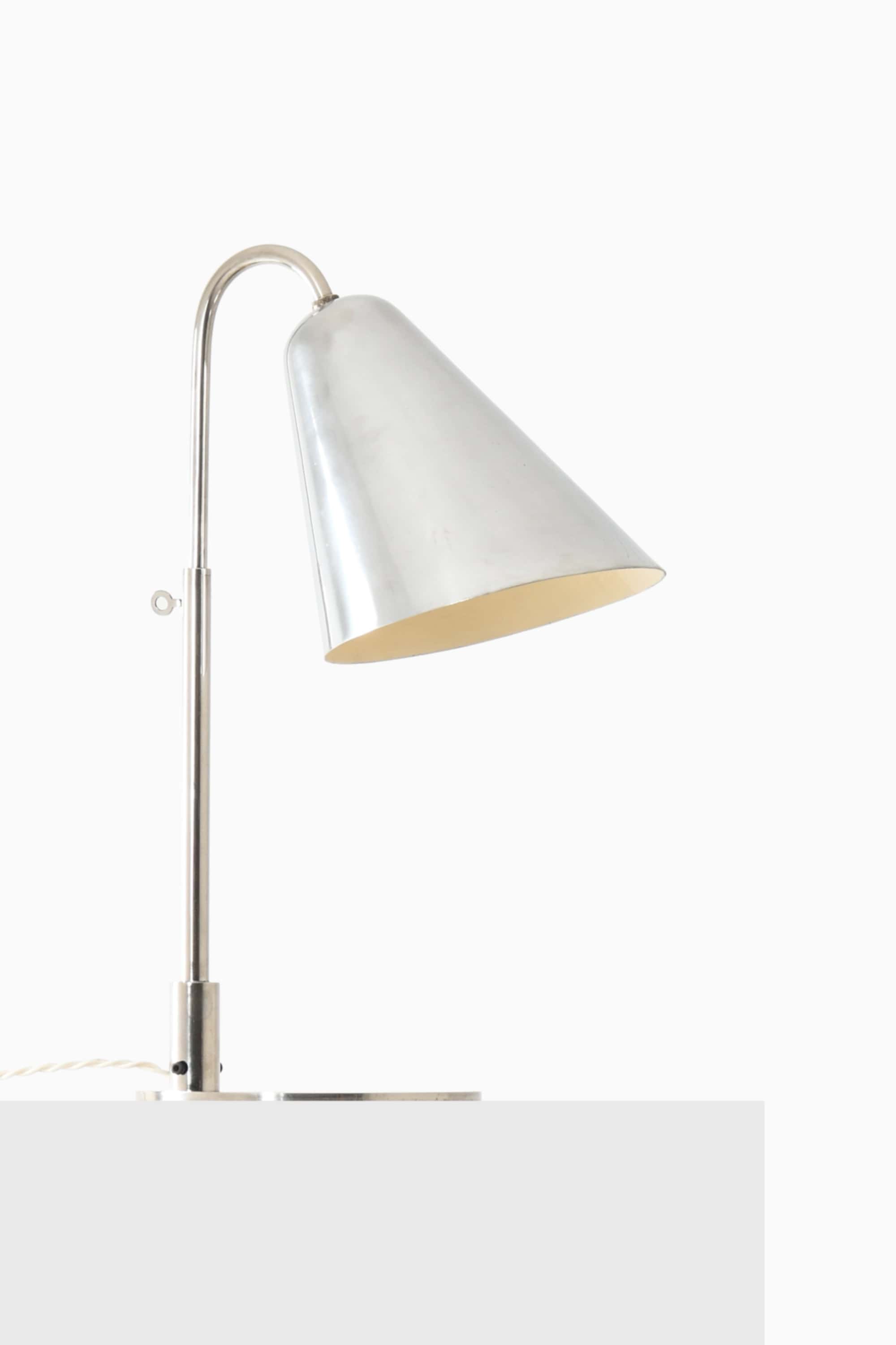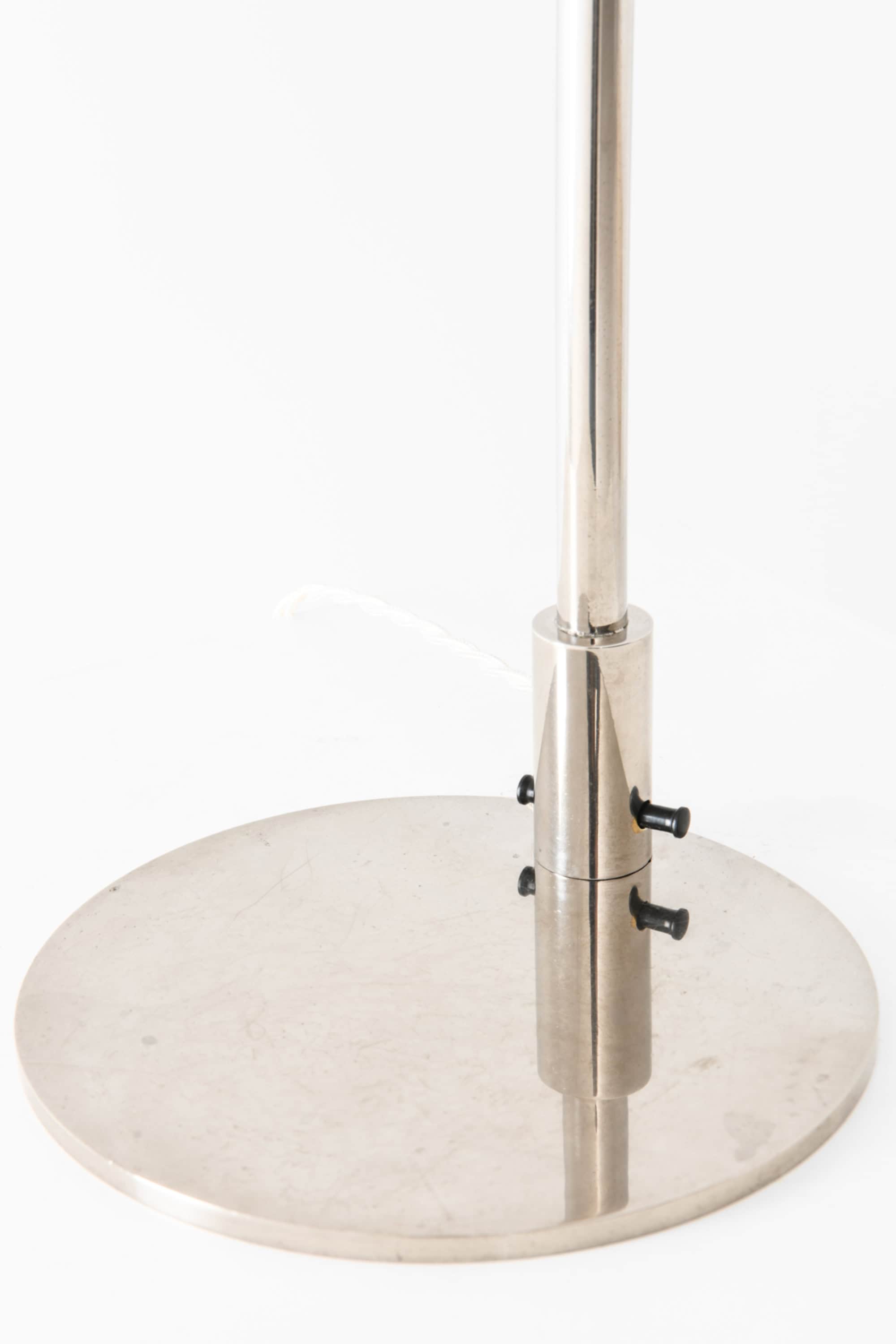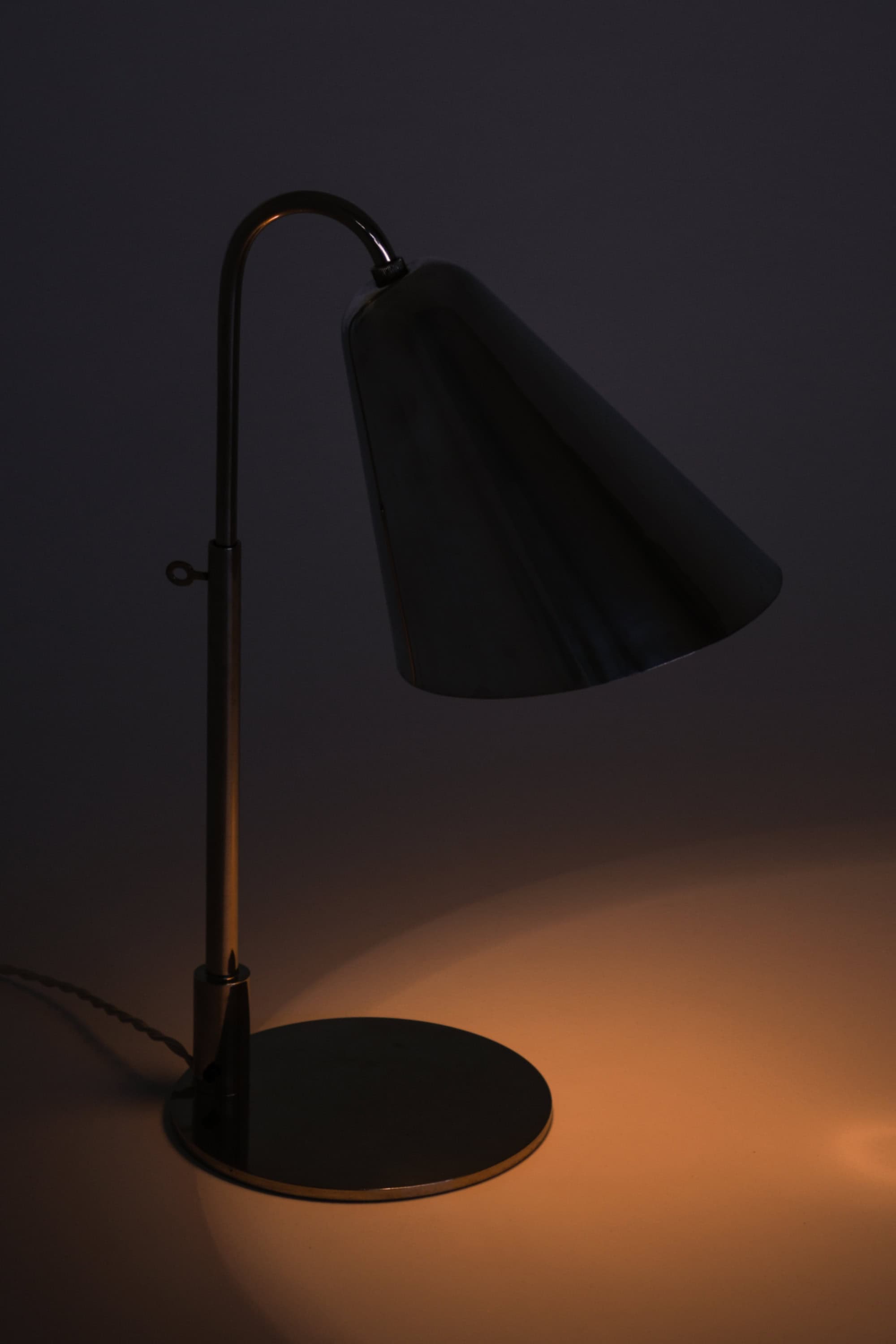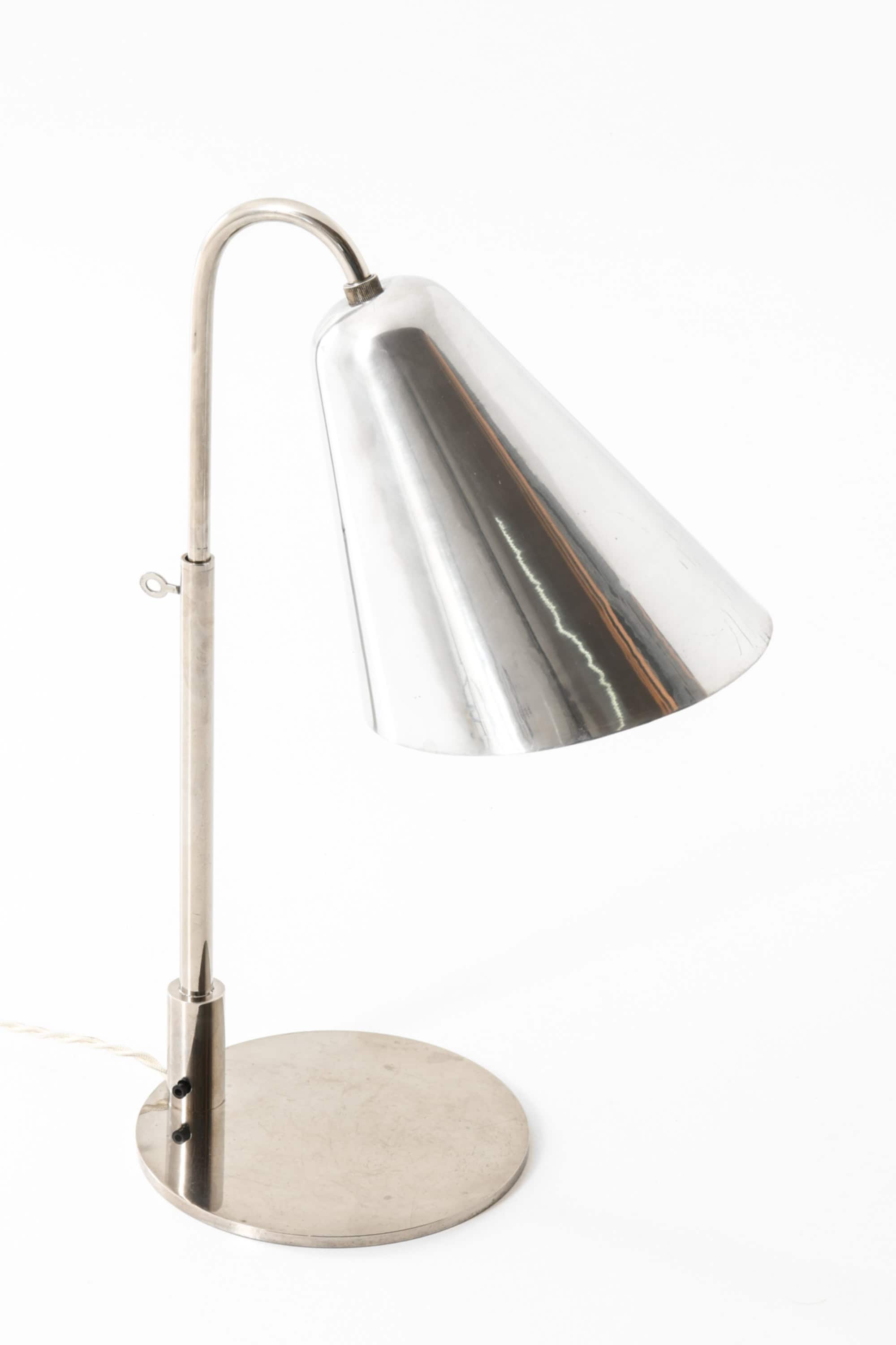 The lamp is made of nickel-plated metal with a polished surface that reflects light with subtle depth. Its form is defined by a conical shade mounted on a gently curved tubular arm, supported by an adjustable stem and circular base. The clean geometry and mechanical detailing, such as the height adjustment key and fastening screws, reveal an industrial influence tempered by refined craftsmanship. The overall expression is minimal and architectural, characteristic of Lauritzen and Schlegel’s shared approach to modern design in the late 1920s.