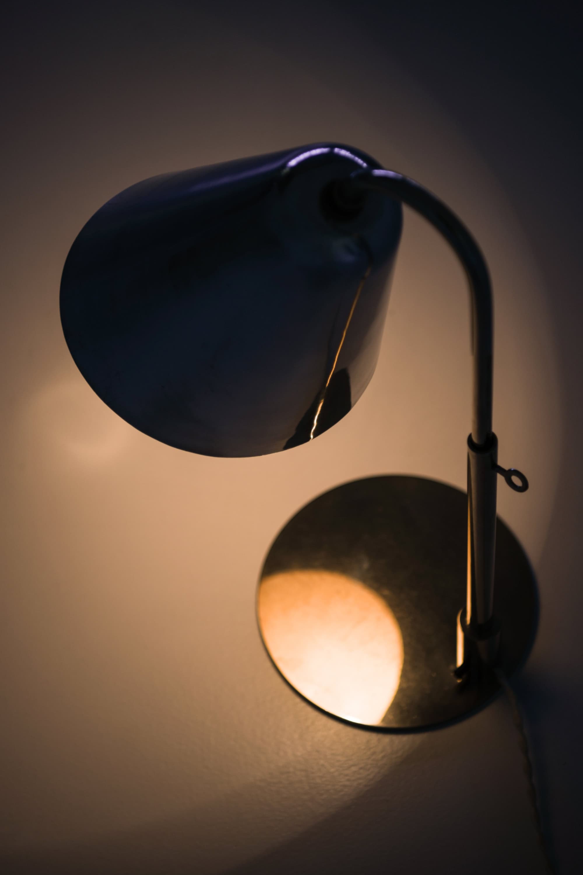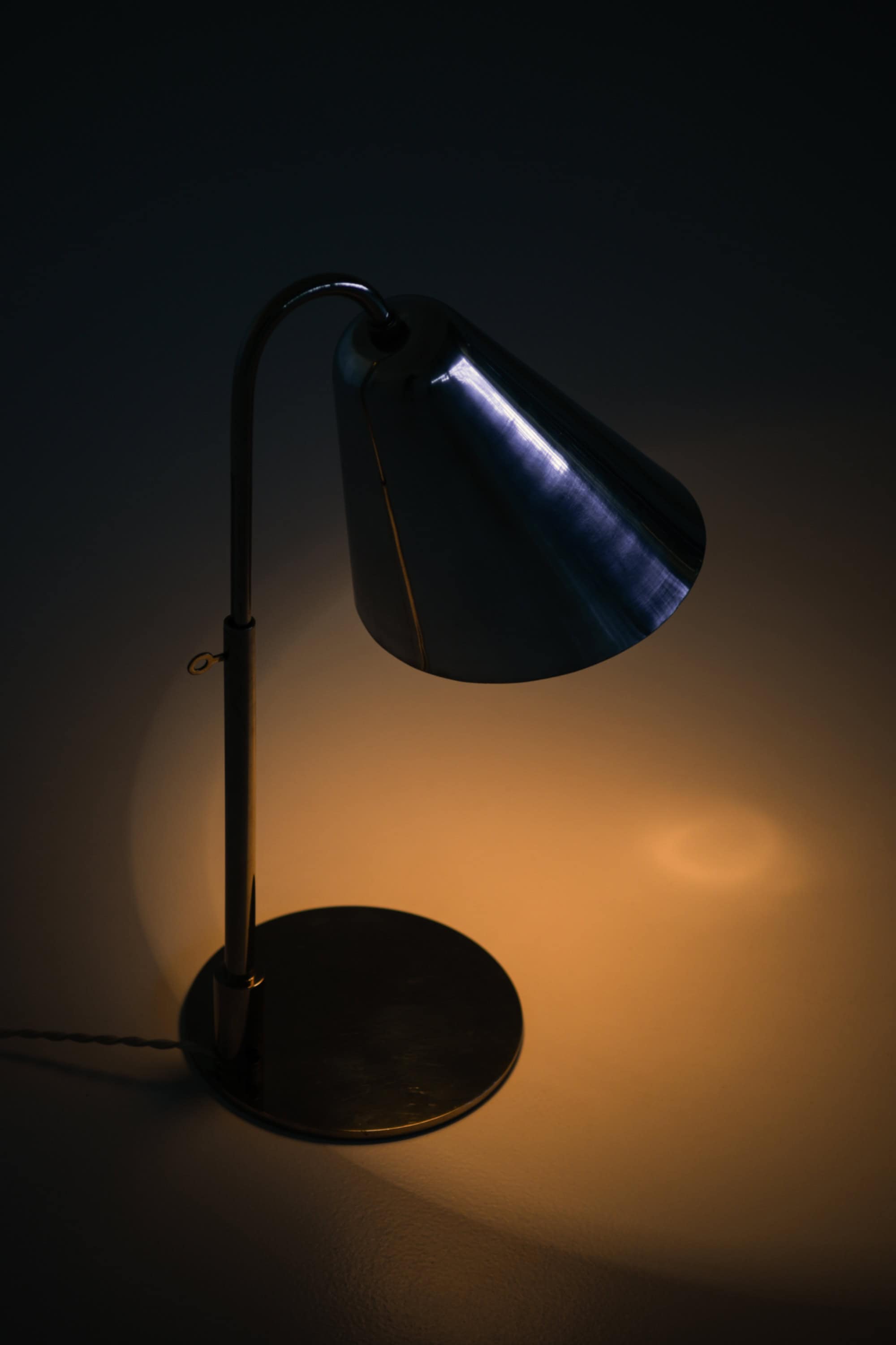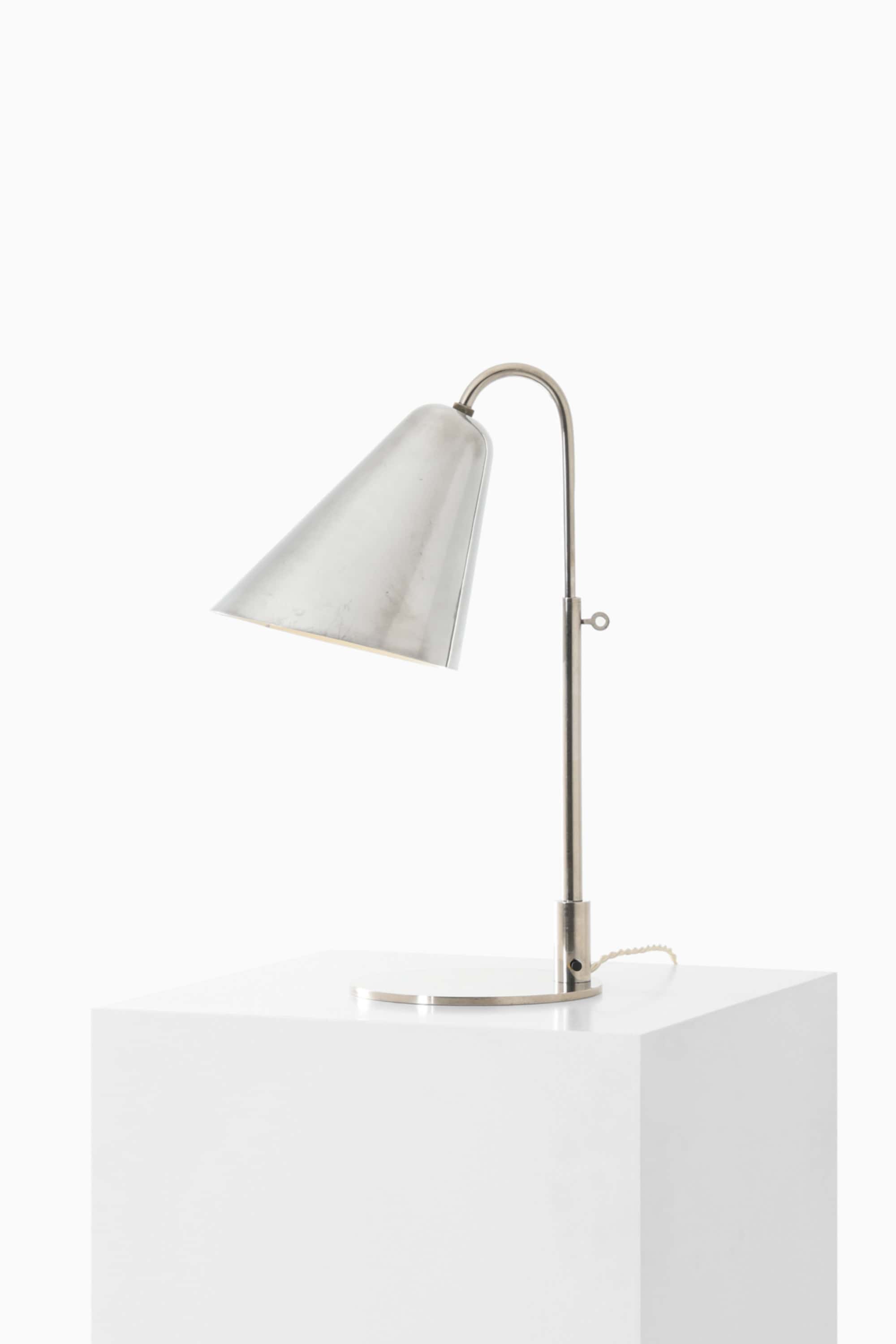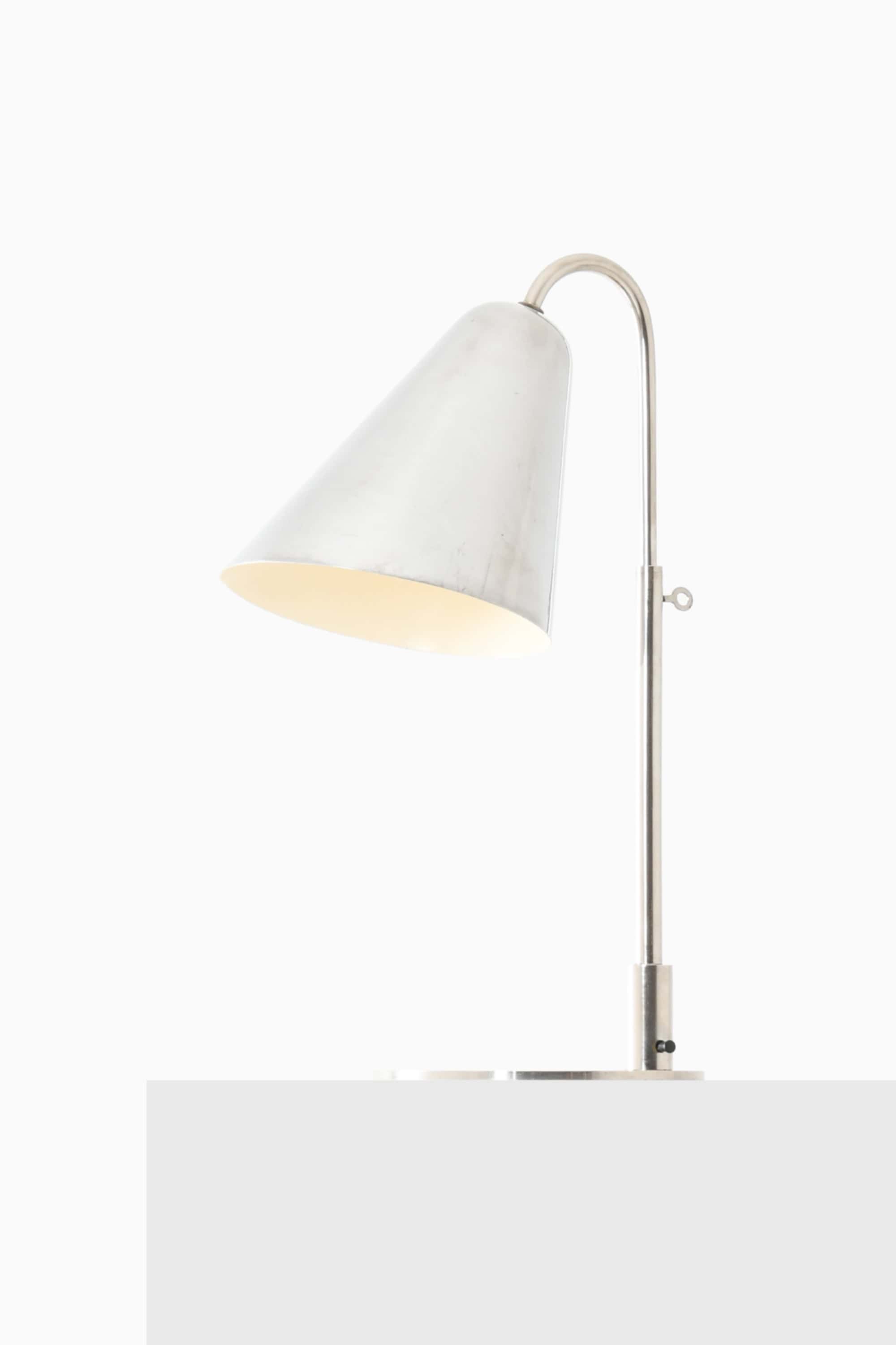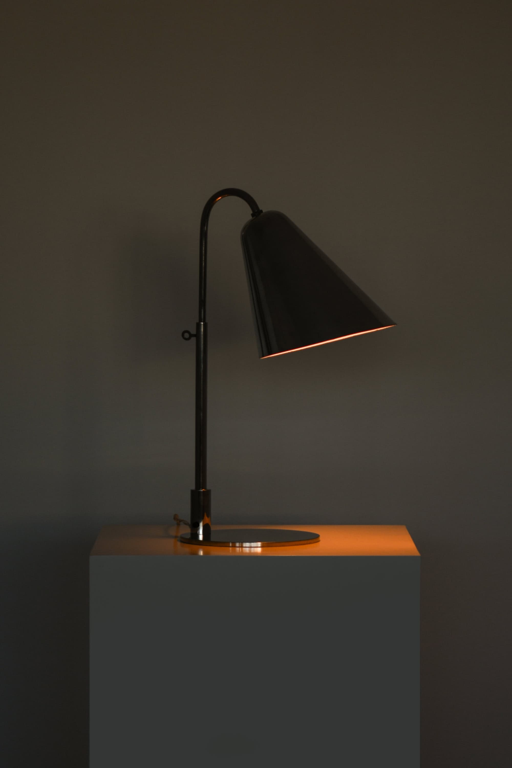 The lamp is made of nickel-plated metal with a polished surface that reflects light with subtle depth. Its form is defined by a conical shade mounted on a gently curved tubular arm, supported by an adjustable stem and circular base. The clean geometry and mechanical detailing, such as the height adjustment key and fastening screws, reveal an industrial influence tempered by refined craftsmanship. The overall expression is minimal and architectural, characteristic of Lauritzen and Schlegel’s shared approach to modern design in the late 1920s.