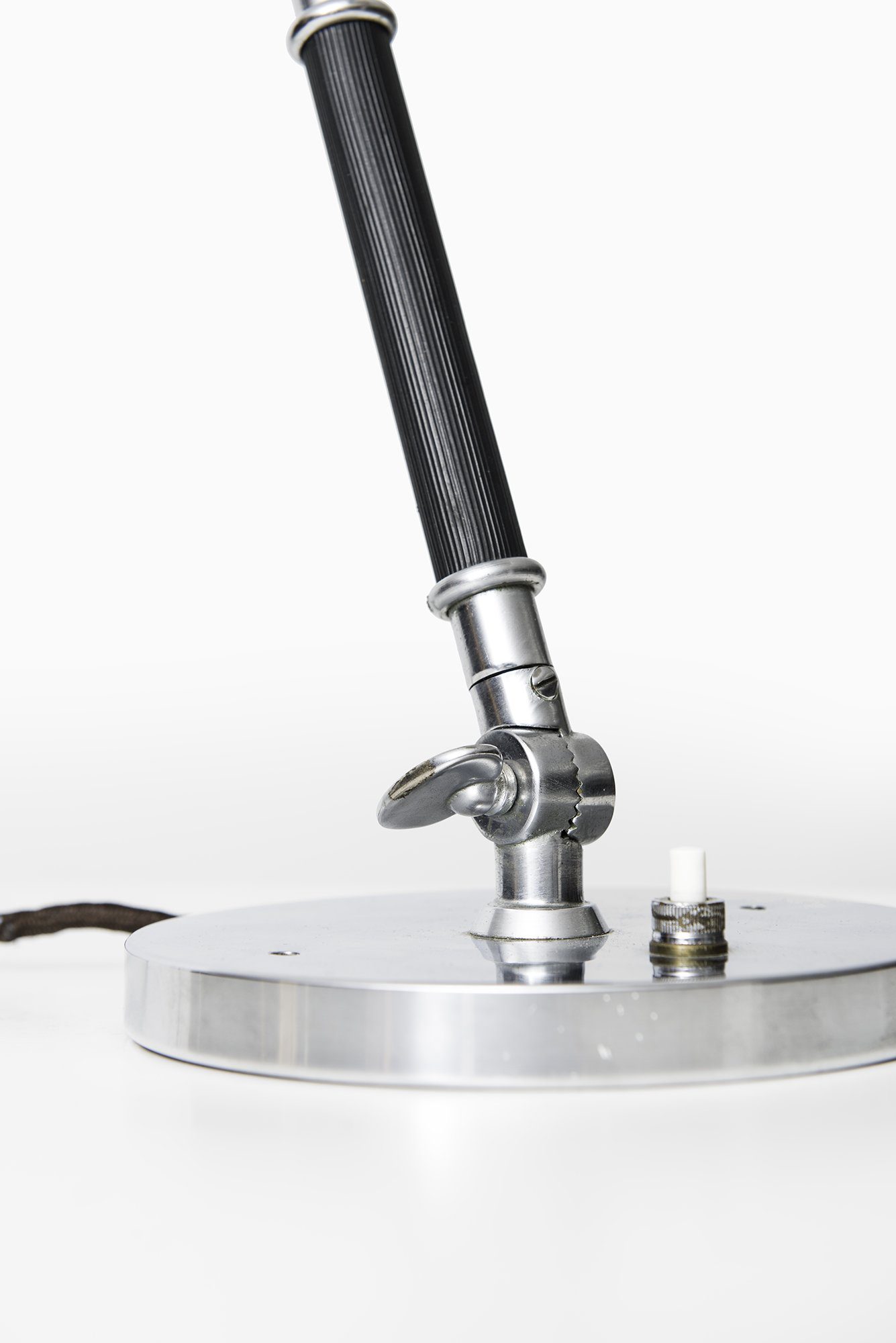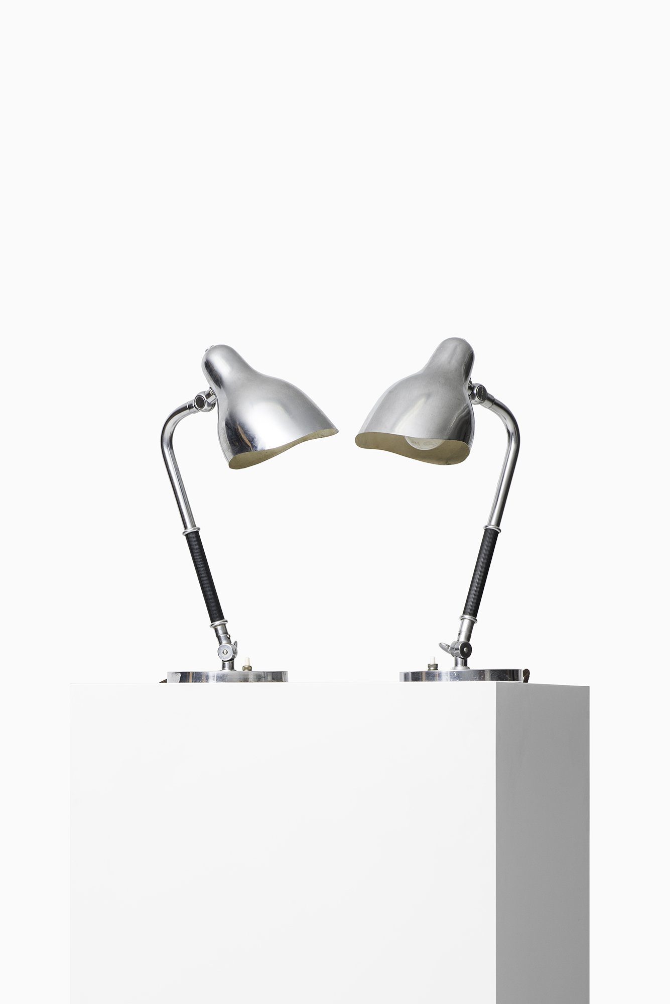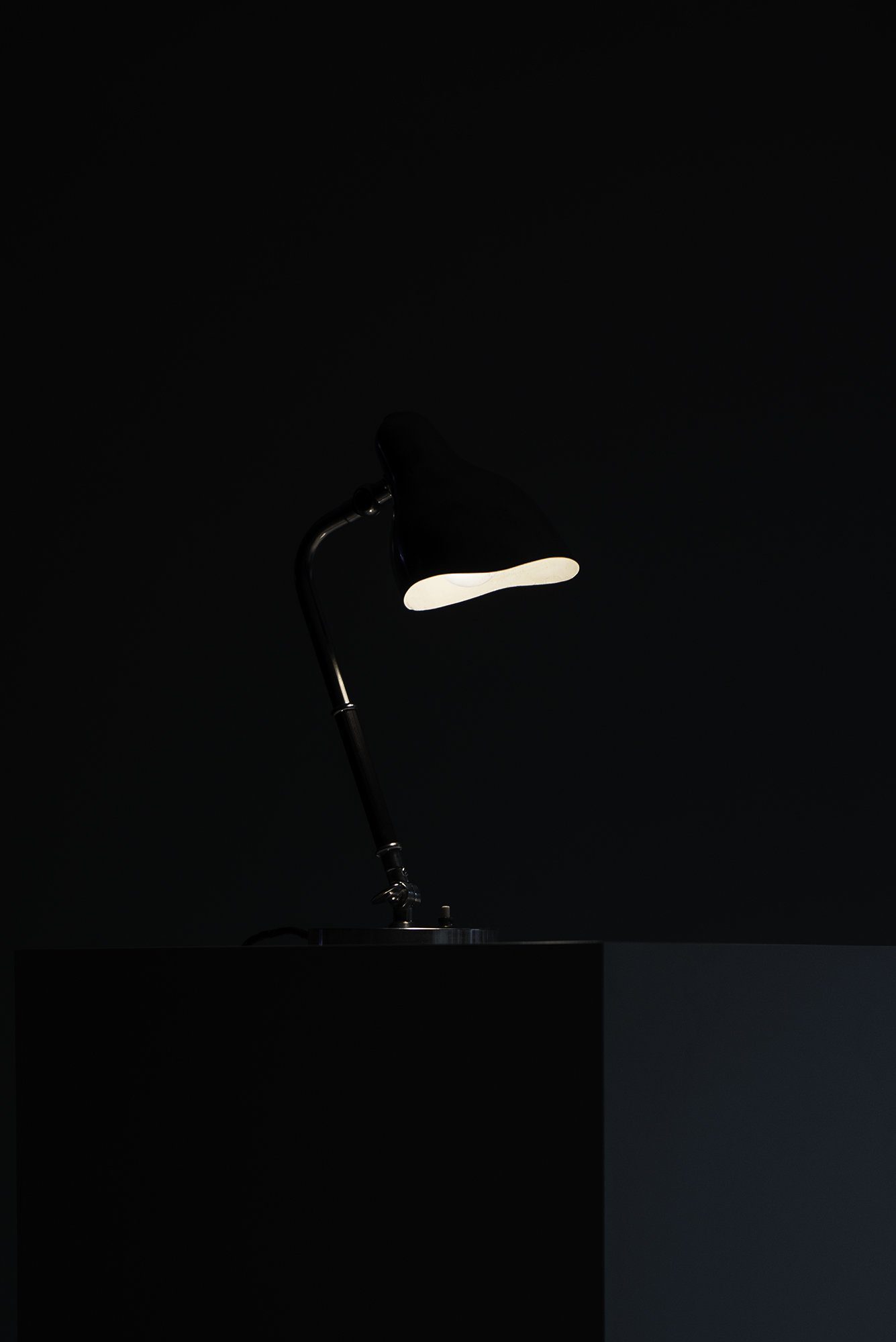 These pair of table lamps are a rare example of Vilhelm Lauritzen’s design work for Louis Poulsen, produced in Denmark during the 1940s. It is executed in chromed steel with a rounded, sculptural shade and a slim cylindrical arm partially clad in ribbed black vinyl for both visual contrast and grip. The organically shaped shade is slightly asymmetrical, directing light in a soft, concentrated beam ideal for task lighting. The base is circular and flat, featuring a small switch and a jointed connection that allows for adjustability.