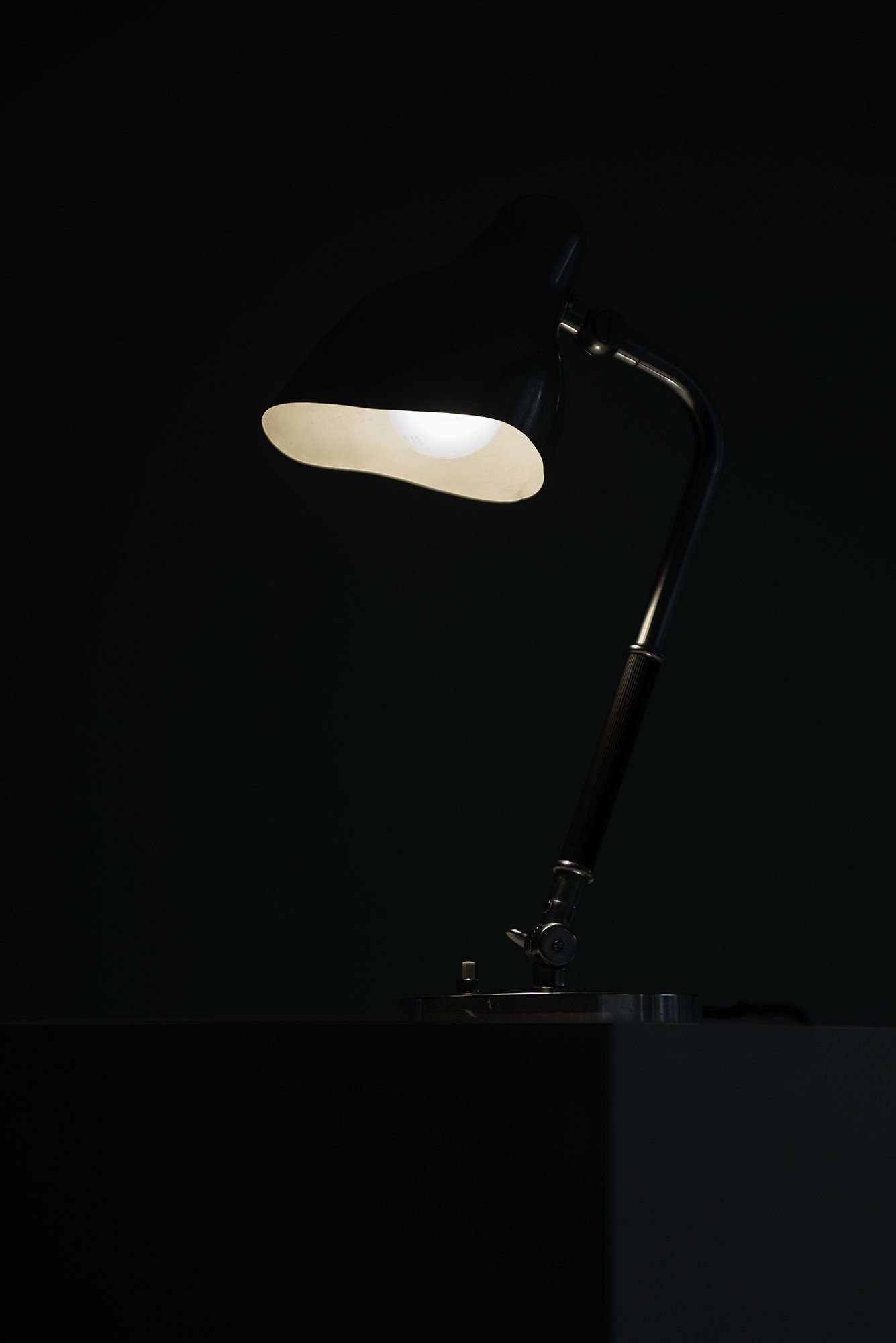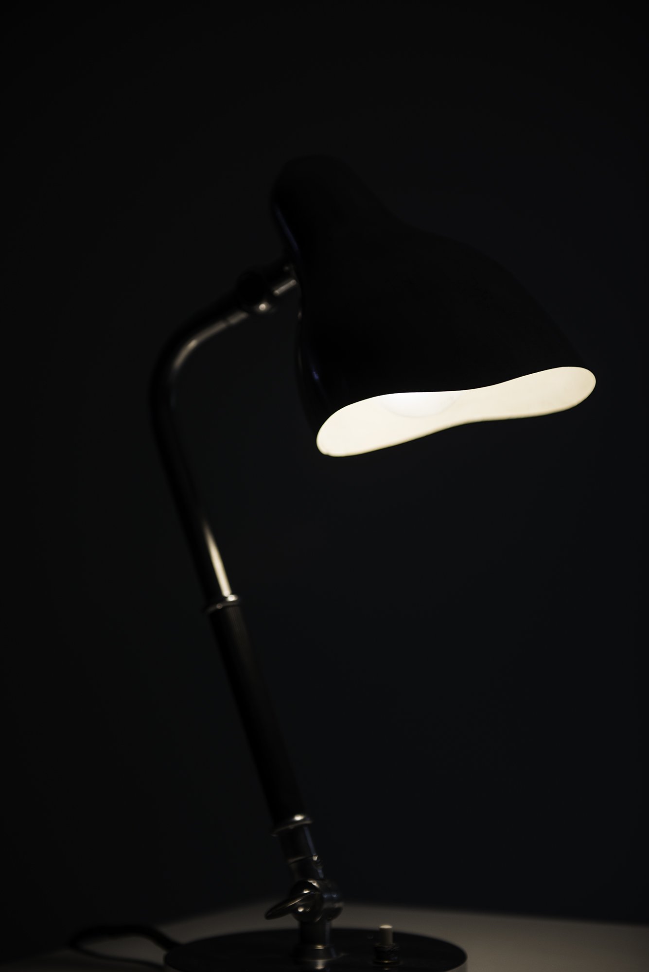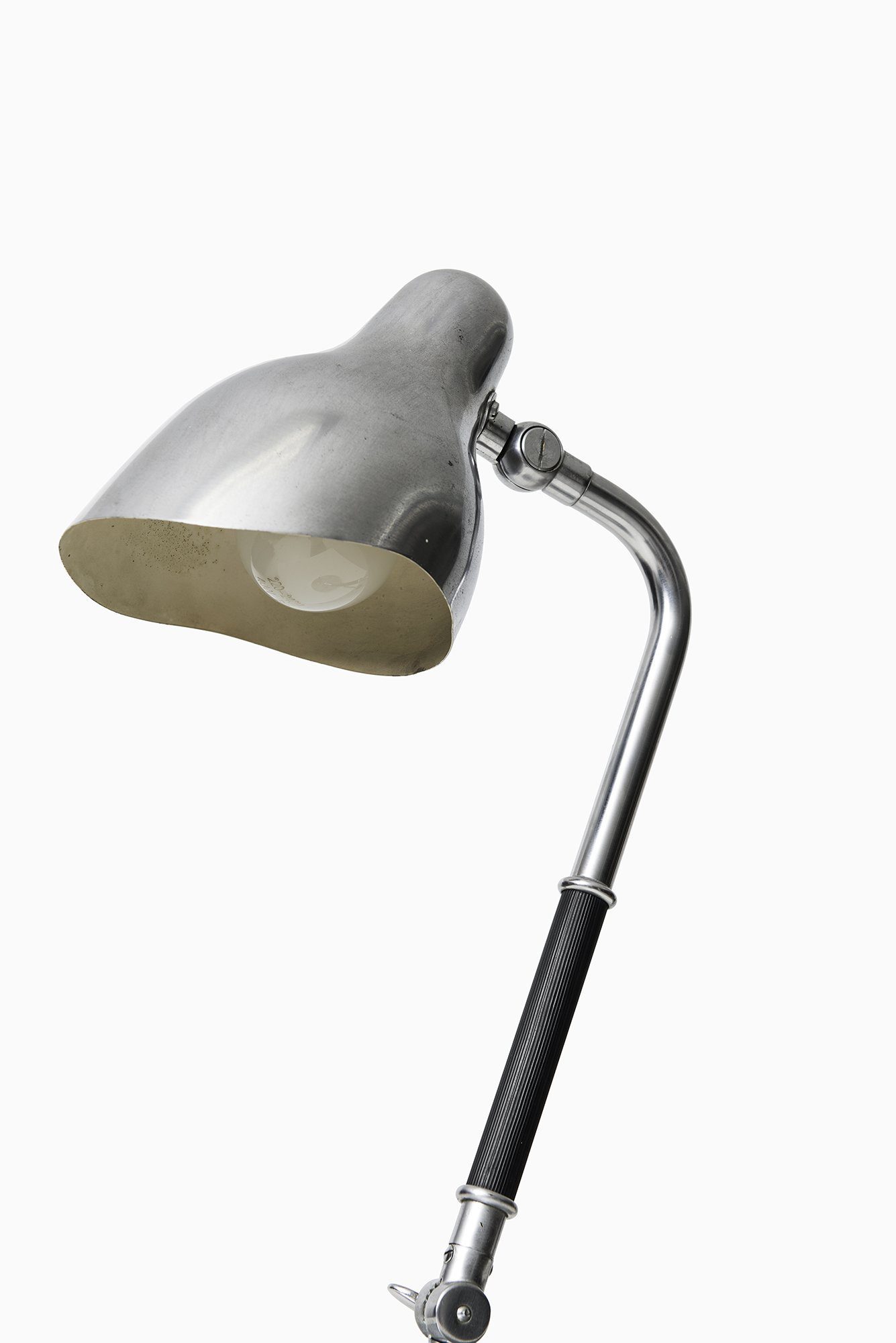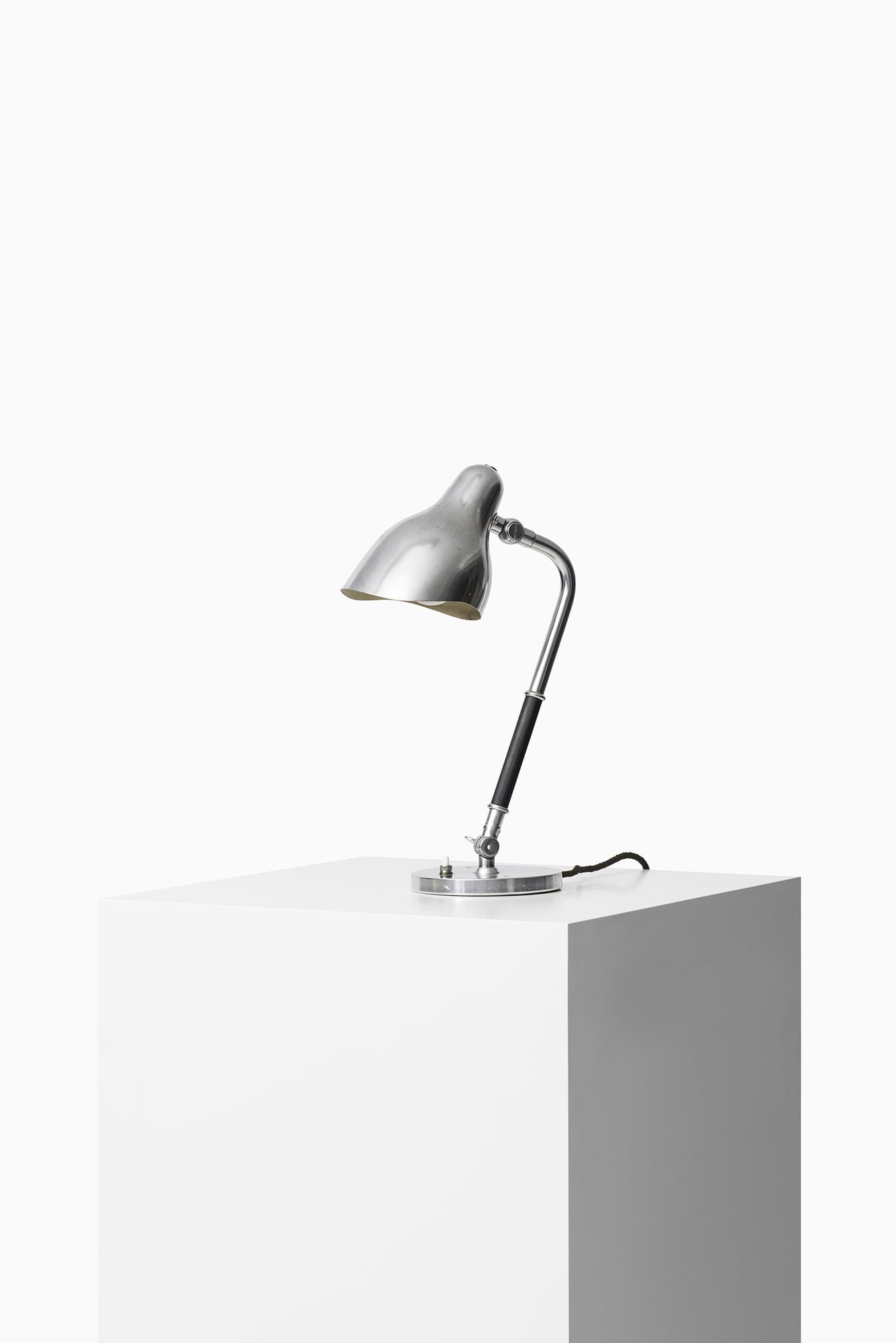 These pair of table lamps are a rare example of Vilhelm Lauritzen’s design work for Louis Poulsen, produced in Denmark during the 1940s. It is executed in chromed steel with a rounded, sculptural shade and a slim cylindrical arm partially clad in ribbed black vinyl for both visual contrast and grip. The organically shaped shade is slightly asymmetrical, directing light in a soft, concentrated beam ideal for task lighting. The base is circular and flat, featuring a small switch and a jointed connection that allows for adjustability.