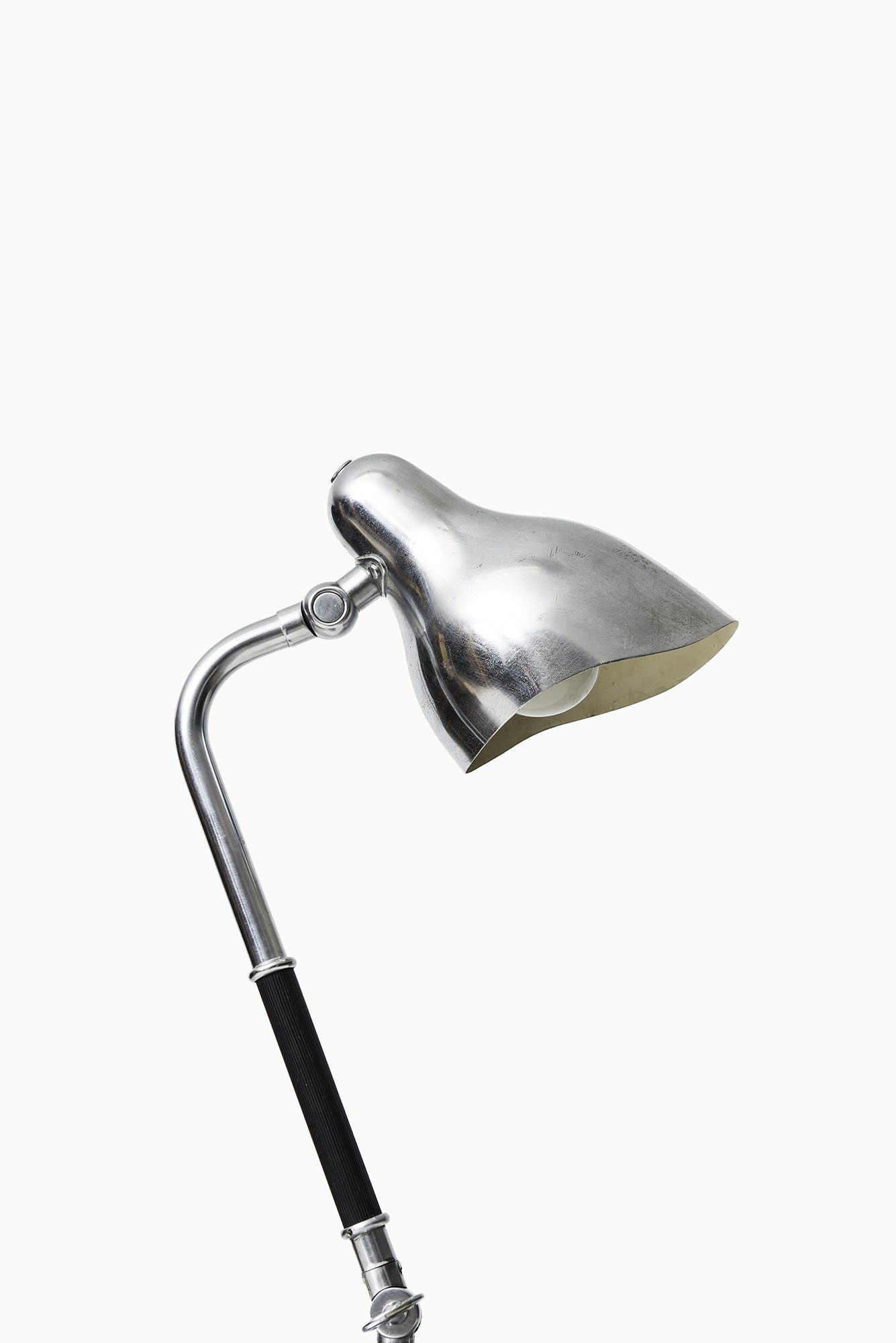 The lamps are finished in polished chrome, with a warm patina that speaks to its age and history. Minor surface scratches and slight darkening of the metal are present, consistent with careful use over decades, but the overall condition remains excellent for a piece of this period. The black vinyl on the arm is intact, adding a subtle textural element and reinforcing the lamp’s utilitarian yet elegant character.
