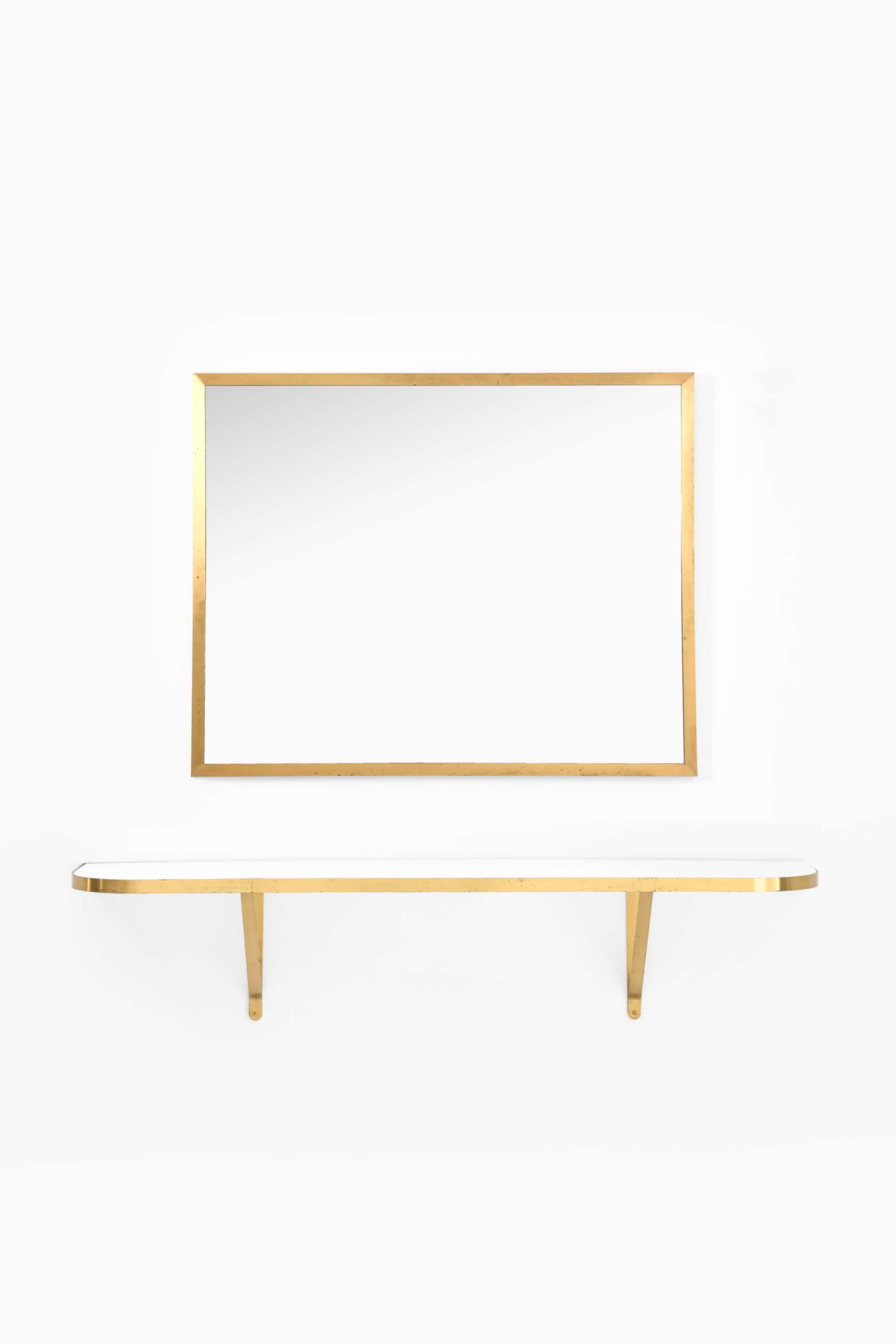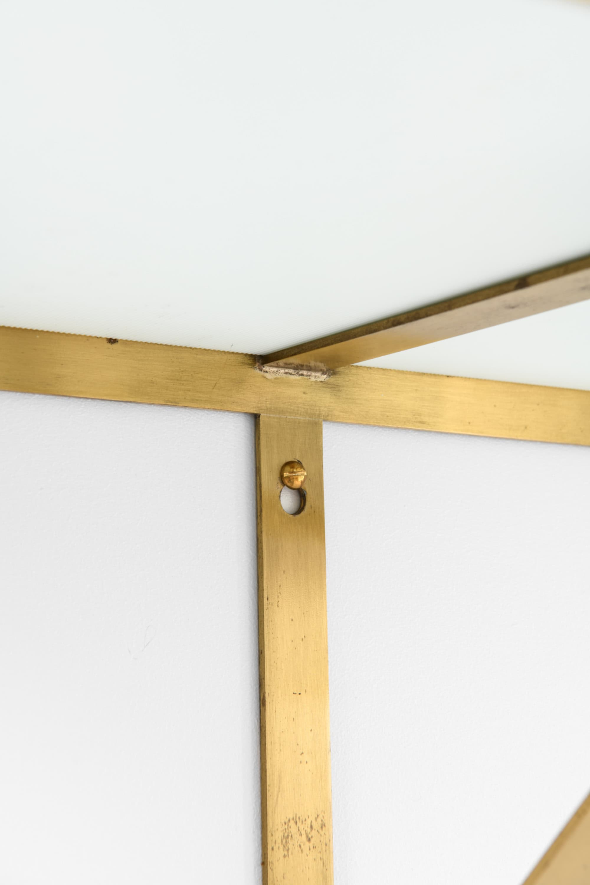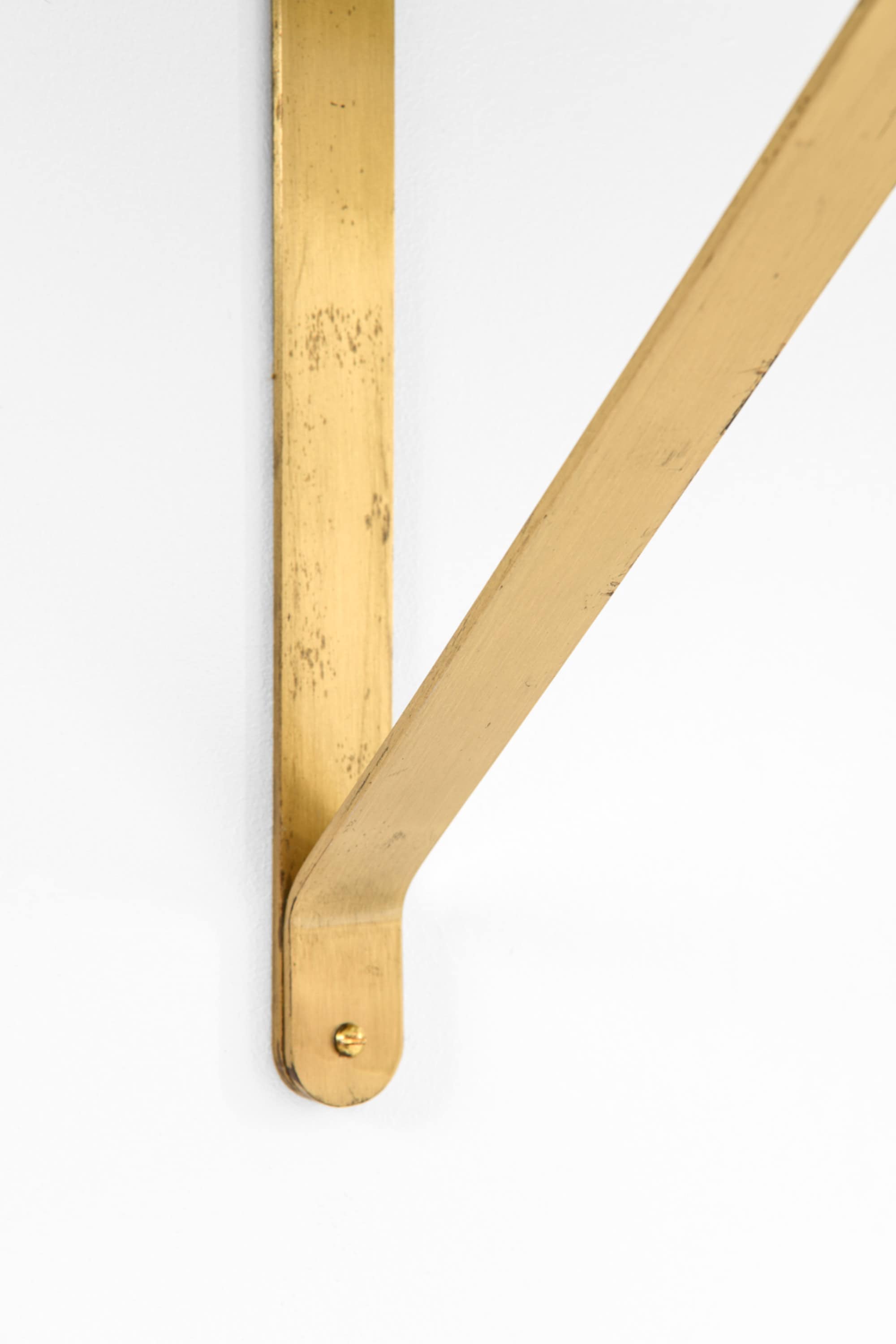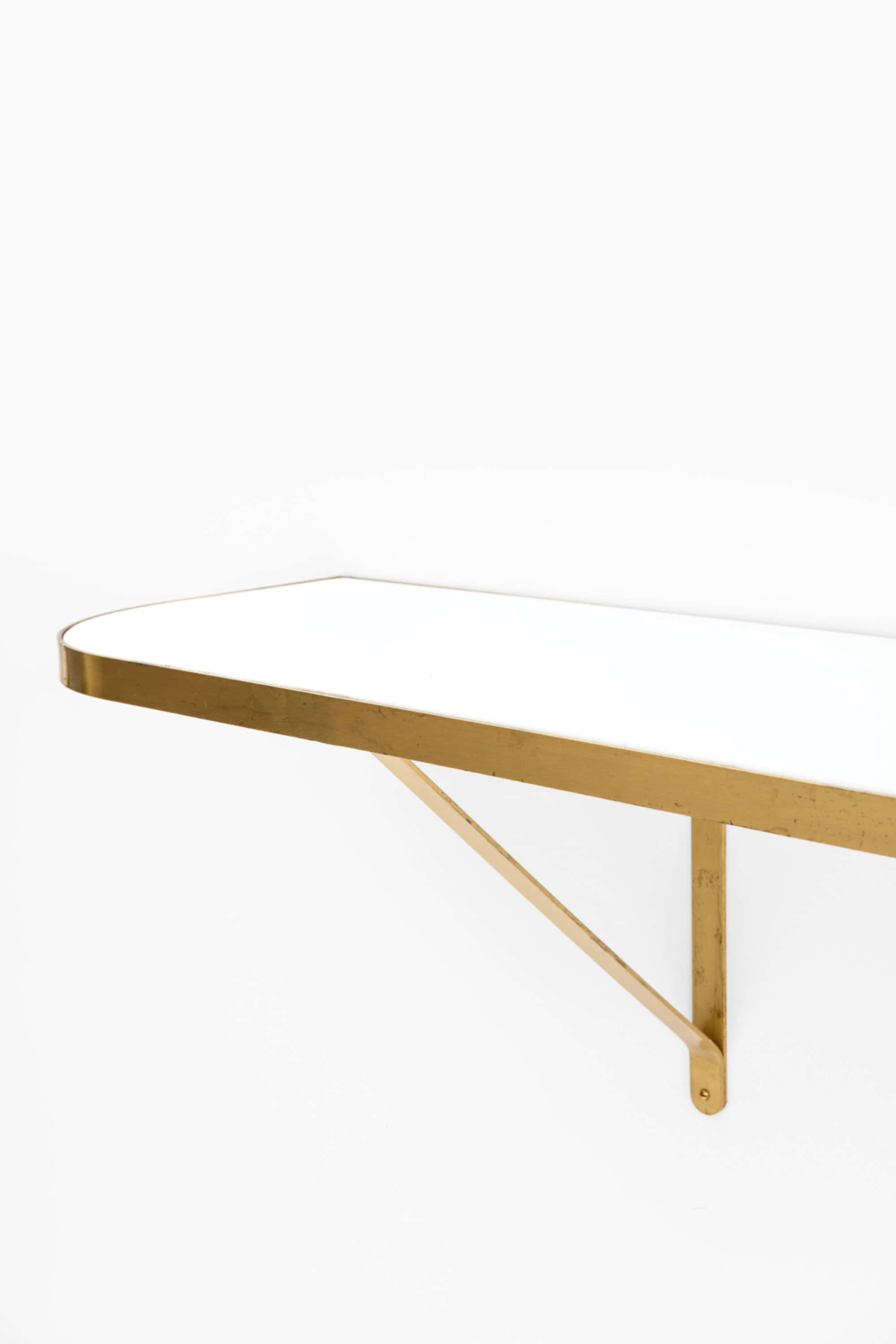 This wall-mounted shelf was produced in Sweden during the 1960s by Glas Mäster in Markaryd, a company known for its refined craftsmanship in glass and metal design. The piece is constructed from brass and white glass, forming a balanced composition that combines a reflective metallic warmth with the cool clarity of opal glass. The shelf features a streamlined brass structure with rounded corners and a continuous brass band encasing the glass top. Two brass brackets provide structural support, fixed directly to the wall for a clean, floating appearance.