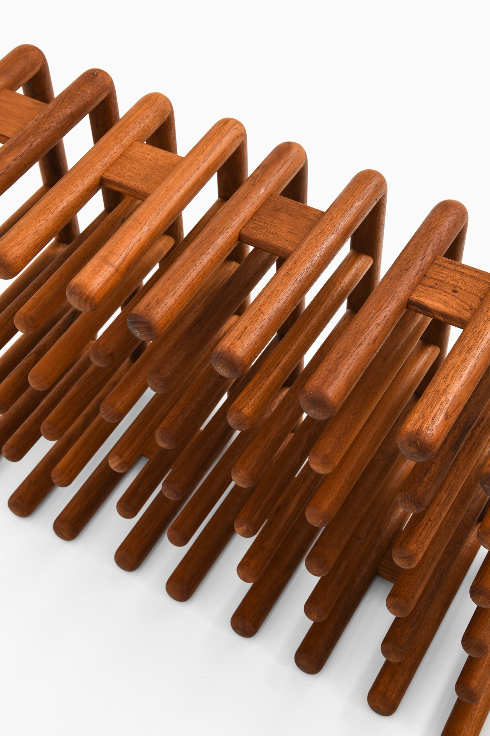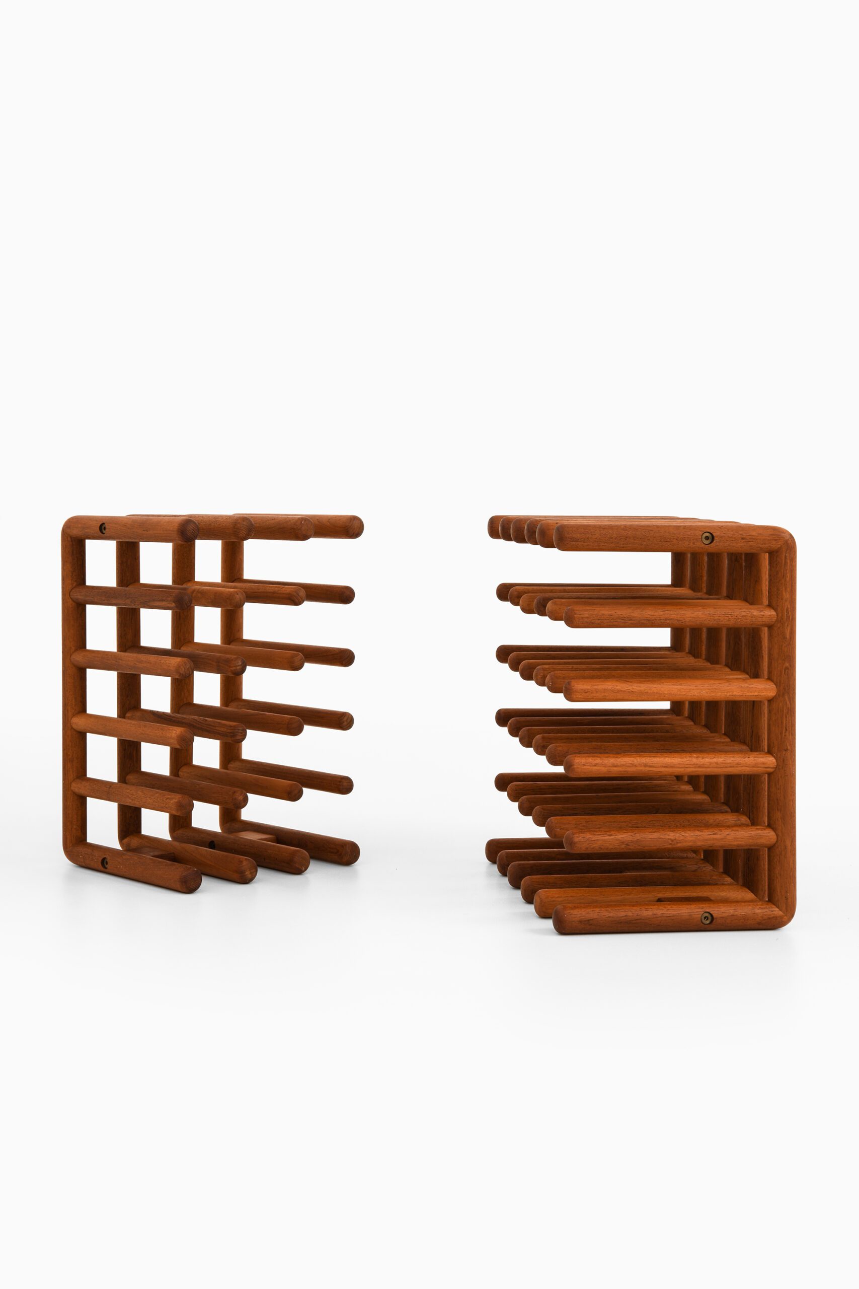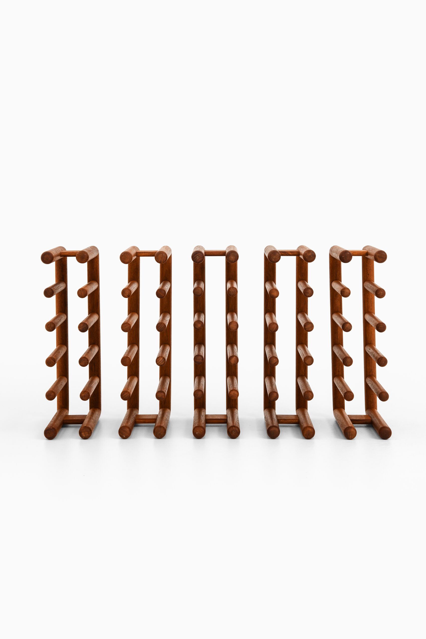 This set of five wine racks or bottle stands, produced in Denmark during the 1950s, is a fine example of Scandinavian mid-century design focusing on functionality and understated elegance. Crafted from solid teak, each rack features a modular, open-frame construction with evenly spaced, rounded horizontal dowels specifically designed to hold wine bottles securely. The pieces can be used individually or combined to form a larger storage system, enhancing versatility.