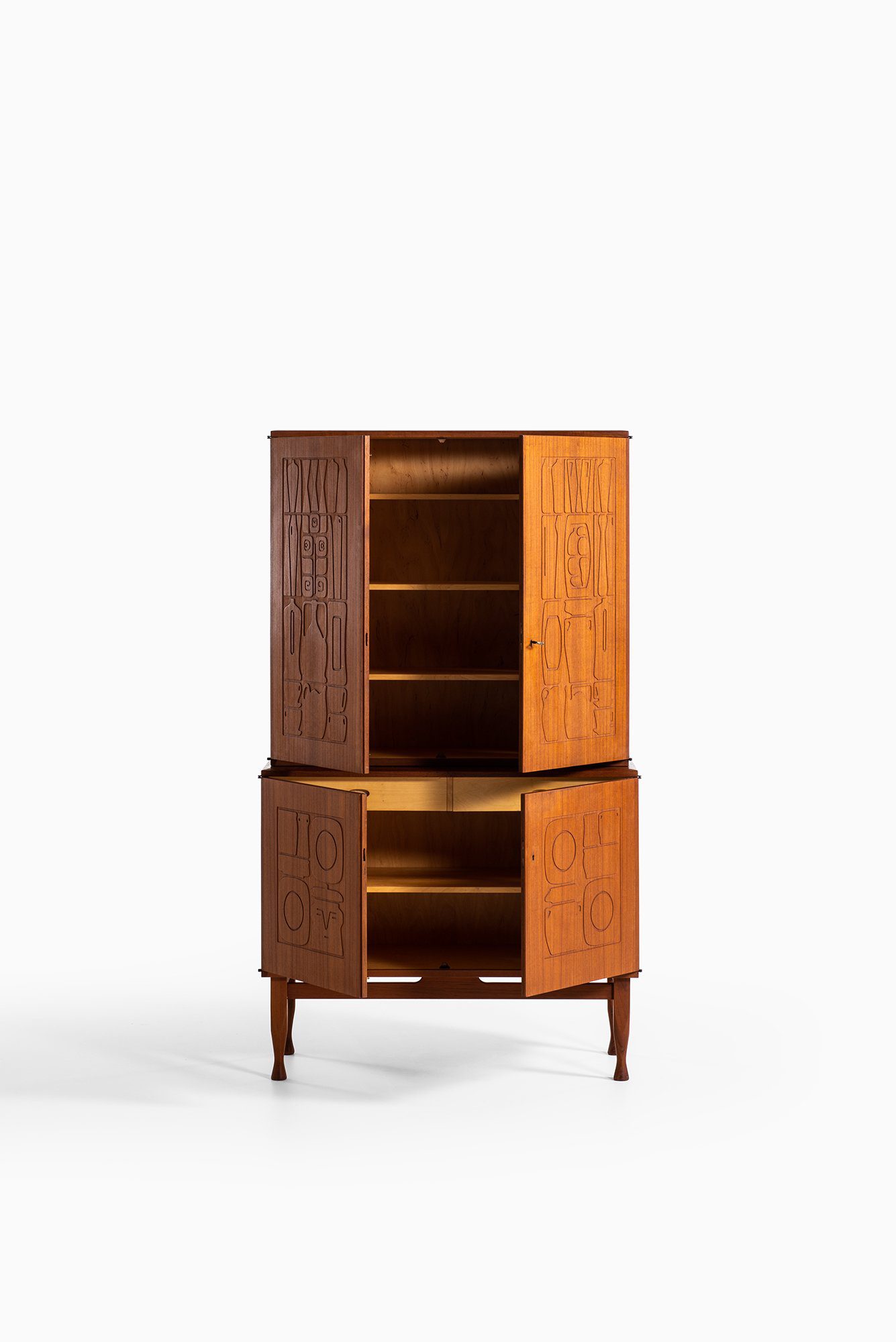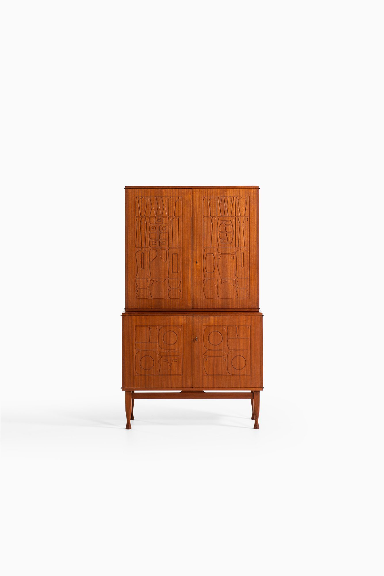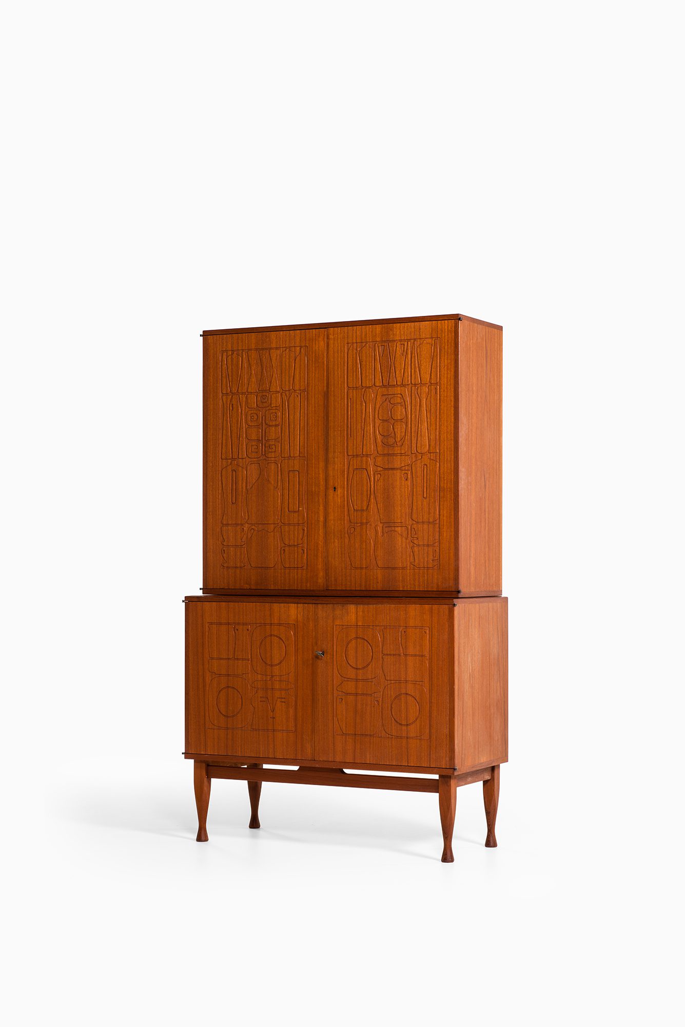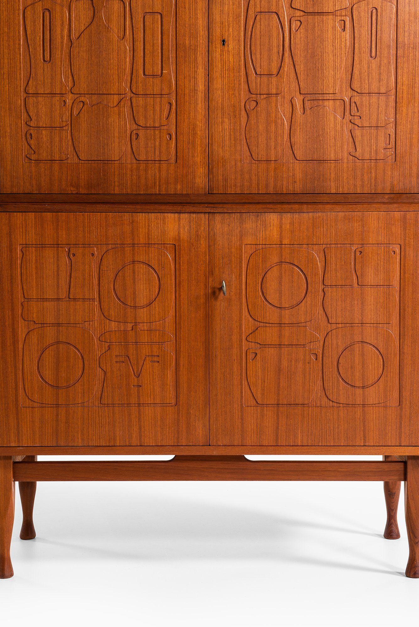The cabinet is executed in teak with a warm, medium-brown tone and a finely figured grain. It is composed as a two-part construction, with an upper cabinet resting on a lower storage section, both supported by slender, tapered legs. The doors are the defining feature, each panel carved with abstracted, relief-like motifs inspired by vessels, utensils, and domestic forms. These linear carvings are shallow yet precise, creating a rhythmic surface pattern that interacts subtly with light and shadow while remaining fully integrated into the wood surface rather than applied ornament.