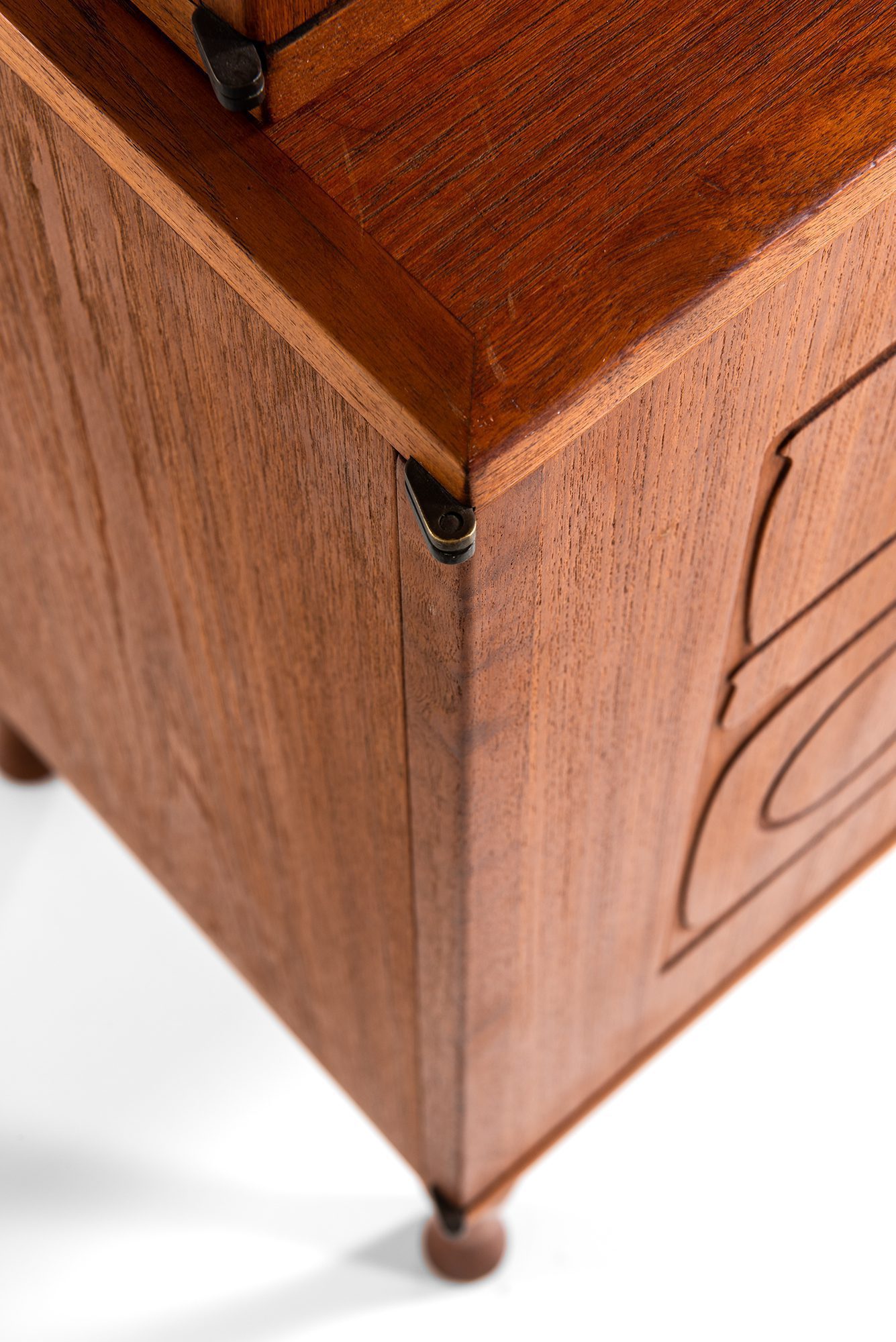The cabinet is in good vintage condition, showing small signs of use consistent with age. These include light surface wear, minor marks, and gentle patina to the teak, all of which contribute to the authenticity of the piece without detracting from its structural integrity or visual clarity. The doors align well, the carved details remain crisp, and the interior shelving is intact and functional.